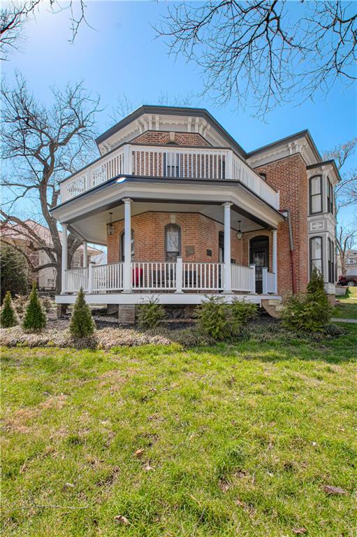 This historical three bedroom home in Liberty Missouri, listed as a national historic landmark, preserves original 1875 craftsmanship while offering modern kitchen, bath, and structural updates. At 225 Groom Street in Groom’s Addition, this rare Italianate residence features restored masonry, remodeled interiors, wraparound porches, and a three car garage with workshop space. This historic home offers a one and a half story layout with a light filled primary suite on the main level and two upstairs bedrooms with oak floors throughout. The east bedroom features stained glass doors that open to the upper wraparound porch, while the north bedroom showcases bay windows and generous natural light. Upstairs bathroom is newly remodeled with a tub and shower and antique fixtures. The foyer welcomes you with a polished wooden staircase, intricate woodwork, and detailed newel posts. The formal living room includes the original fireplace, antique gasolier chandelier, transom windows, and lower porch access. The formal dining room features bay windows, original fireplace, gasolier chandelier, transom window, and stained glass door to the porch. The remodeled kitchen includes stainless steel appliances, KraftMaid cabinetry, and granite countertops, plus a large entry area with laundry and a spacious walk in pantry. The main floor bath is remodeled with marble floors, stained glass, and shower. A separate family or rec room offers accent ceilings, bar, built in media cabinet, and direct access to a private patio. The basement is clean and dry with windows, original fireplace, storage space, and outside access. Exterior improvements include newly tuck pointed masonry, restored concrete and brick foundation, newly poured front and rear concrete driveways, new 6 foot privacy fence, landscaped grounds, and a three car garage with ample storage and workshop area.