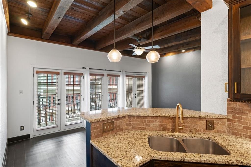 Bella Condominiums offers a lifestyle-focused living experience just moments from the Country Club Plaza. This charming Spanish-style community is centered around a resort-style pool, creating a relaxed, low-maintenance setting in a highly desirable location. This second-floor unit features true single-level living with a blend of character and thoughtful updates throughout. Interior highlights include exposed beams, wood floors, and an electric fireplace that anchors the main living space. The updated kitchen is equipped with modern finishes, ample cabinetry, and all appliances remain, including the in-unit washer/dryer combo. A standout feature of the home is the double French door entry leading to a covered deck with views overlooking the community pool—offering a seamless extension of the living space and a great spot to unwind. The unit includes two bedrooms with flexible use, along with an updated bathroom featuring quality finishes. One gated off-street parking space is included. Residents of Bella enjoy secured access and amenities such as a clubhouse, fitness center, poolside entertaining areas, and maintained grounds—ideal for a lock-and-leave lifestyle. Move-in ready and perfectly positioned near premier shopping, dining, and entertainment, this is an excellent opportunity to enjoy comfortable, convenient living near the Plaza.