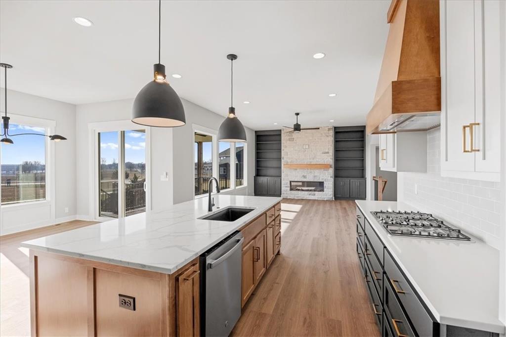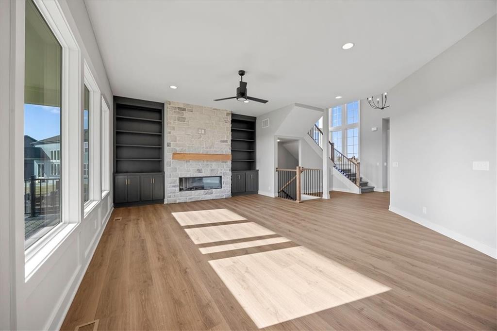 Situated on a level lot with a covered patio, this thoughtfully designed home offers comfort, style, and exceptional functionality. The inviting great room features a beautiful stone fireplace and built-in cabinetry, creating a warm focal point that flows seamlessly into the kitchen. Designed with both style and practicality in mind, the kitchen showcases upgraded quartz countertops, a custom coffee bar, and a large walk-in pantry, offering plenty of space for storage and gathering. Just off the garage, the owner’s entry includes custom lockers, helping keep everything organized and functional for daily life. The main level also offers a convenient pocket office, perfect for working from home or managing day-to-day tasks, along with a separate guest bedroom on the main floor for added flexibility. Throughout the home you’ll find upgraded trim, decorative accent details, and numerous tile and finish upgrades, highlighting the quality craftsmanship in every space. The lower level is unfinished but already stubbed for a future bathroom and wet bar, giving buyers the opportunity to expand the living space and customize it to fit their needs. Additional highlights include an oversized garage and extended driveway, providing extra room for vehicles and storage.