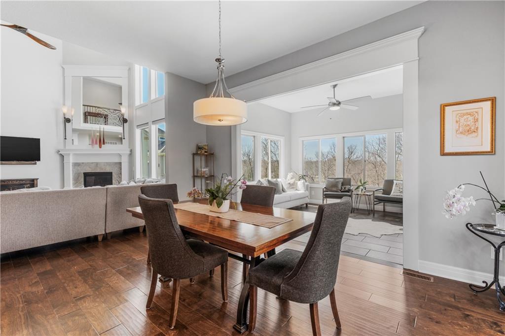 Located in the desirable River Ridge Farms West subdivision, this exceptional home is framed by beautifully landscaped grounds and a welcoming front façade that radiates elegance. Set on an estate lot (over half an acre) with open rear views, the home offers privacy and tranquil sunset vistas. A formal dining room off the entry flows seamlessly into the open two-story great room, filled with natural light and anchored by a striking corner fireplace, creating a warm and inviting atmosphere. The chef’s kitchen features granite countertops, a marble backsplash, Thermador double wall ovens, ample cabinet and counter space, and a walk-in pantry. An adjacent dining area opens to a grill deck, perfect for effortless outdoor entertaining, and leads directly into a sunroom with a floor-to-ceiling stone fireplace and built-in shelving—a cozy retreat for morning coffee or relaxing any time of day. The primary suite is a serene haven with tray ceilings and abundant natural light. Its ensuite bath includes double vanities, a soaking tub, and a separate walk-in shower with dual shower heads. Spacious secondary bedrooms each feature their own private bathrooms, and two laundry rooms make daily living convenient. The expansive finished walkout lower level offers versatile living space with a rec room, wet bar, an additional bedroom, and full bathroom. Step outside to a patio overlooking the large backyard, ideal for relaxing or entertaining. A circular driveway provides easy access, and the 4-car garage with extended storage accommodates vehicles, bikes, and more. Located in the highly sought-after Blue Valley School District, this home offers easy highway access and is conveniently close to shopping, dining, and less than 5 minutes to Aubrey Vineyards. Your lifestyle of tranquility and comfort awaits.