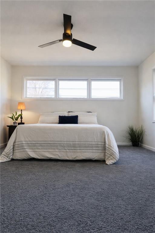 Carpeted bedroom featuring a ceiling fan and multiple windows