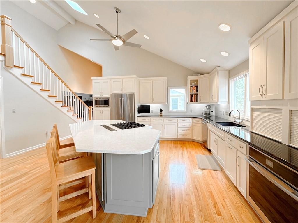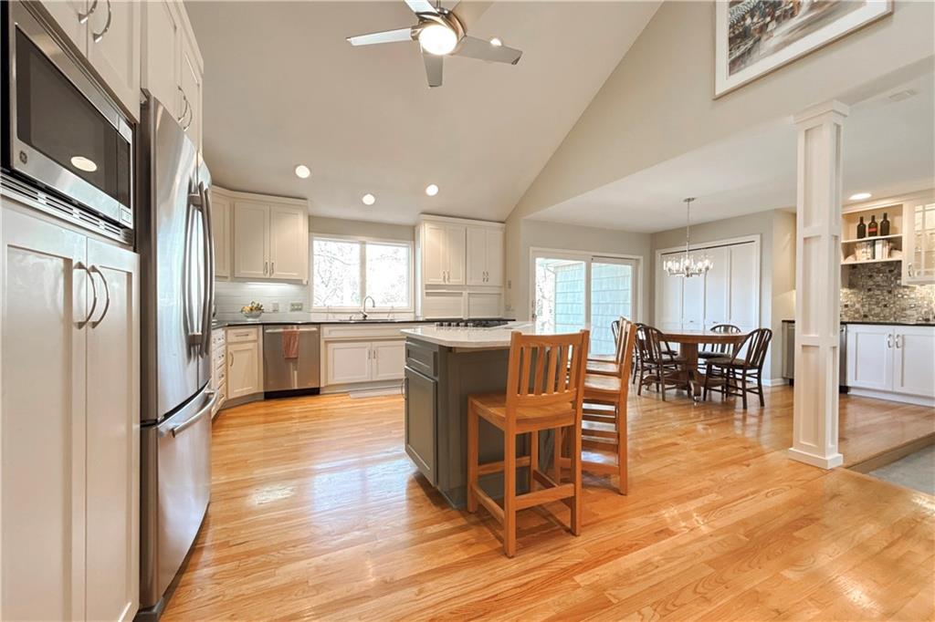 Welcome to this beautifully updated 1.5 story home in highly sought-after Leawood Estates, perfectly suited for a growing family looking for space, comfort, and modern convenience. Offering 4 bedrooms, 3 full bathrooms, and over 3,000 square feet, this home blends timeless charm with thoughtful updates throughout. The inviting main level features a spacious, family-friendly layout with a remodeled kitchen and hearth room completed in 2018, plus two fireplaces located in the hearth room and the living room. The kitchen showcases granite countertops and a stunning quartz island, flowing seamlessly into the main living areas. The primary suite offers a luxurious retreat with a fully remodeled bath completed in 2016 and a custom California Closet system. Extensive improvements provide peace of mind and added value, including Andersen replacement windows on the upper and main levels (excl. the garage), an attic fan, and a second 40-gallon water heater. The home is wired for a zoned audiovisual system with speakers in the living room, primary bedroom and bath, second bedroom/office, dining room, and patio. Outdoor features are equally impressive, including a sprinkler system, gutter covers, a spacious brick patio, a flagstone walkway on the north side of the home, and a beautiful stone chimney. The walkout basement is unfinished, offering a great opportunity to make it your own, whether you're thinking about adding extra living space, a rec room, or simply keeping it as flexible storage. The four-car garage is a rare find and offers plenty of room for vehicles, storage, or hobbies. A gas generator sub-panel is also already in place. Wonderfully located in one of Leawood’s most desirable neighborhoods, this home has it all and it's sure to go fast. Schedule your showing today!
