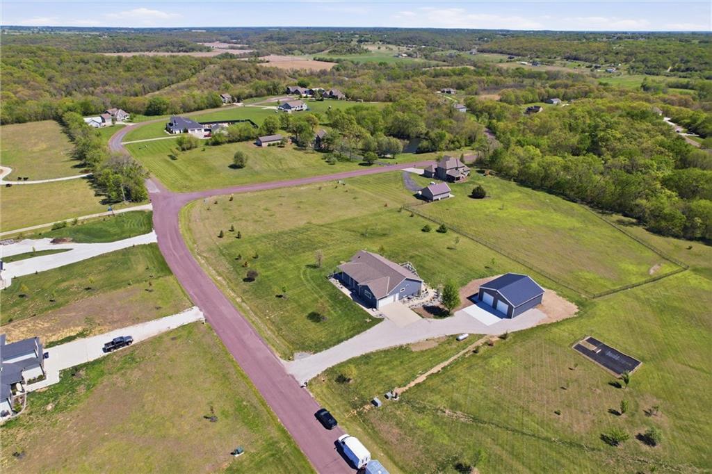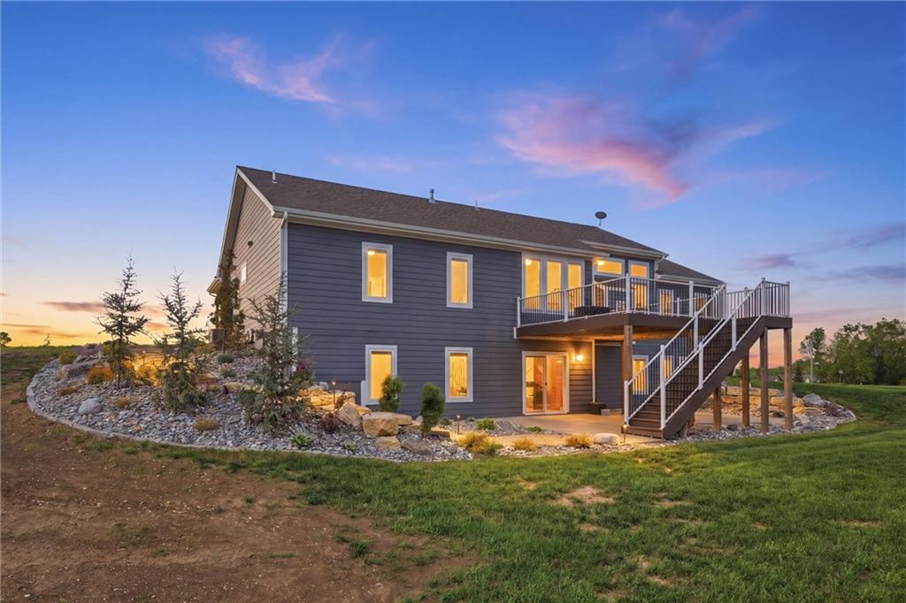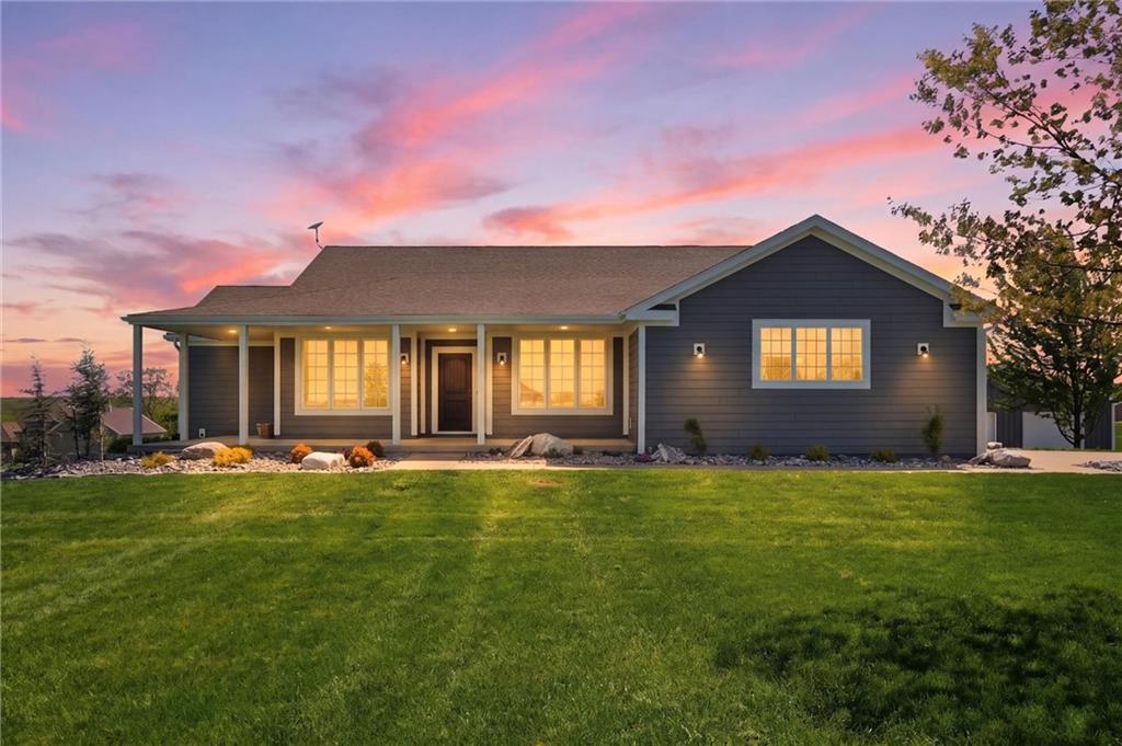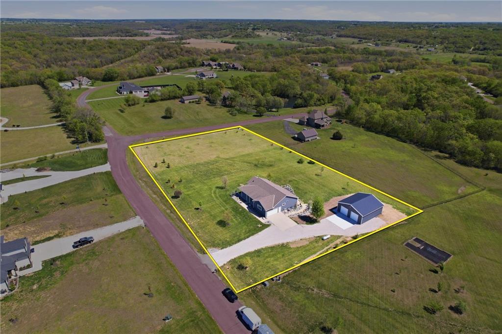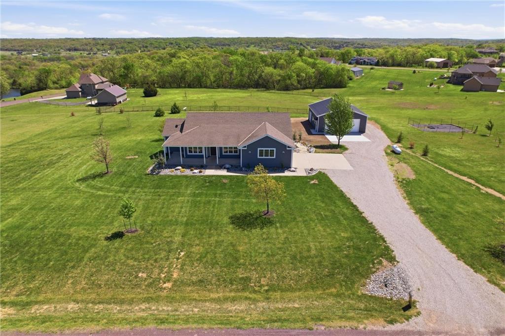 STUNNING ACREAGE RETREAT IN ROCKING C ESTATES | 2.5 ACRES | OUTBUILDING + WALKOUT BASEMENT | NO HOA Positioned on a premier corner 2.5-acre homesite atop a gentle rise with sweeping countryside views in sought-after Rocking C Estates of Tonganoxie. This meticulously maintained property has perfect views from every angle & offers privacy, functionality & some of the BEST country living—OFF PAVED ROADS with NO HOA! From the moment you arrive, the INCREDIBLE landscaping creates a true resort-like setting with a dreamy arrival with wraparound front porch inviting you to slow down and enjoy your own private retreat. A TRUE ranch floorplan offers 3 spacious bedrooms split for privacy PLUS a beautiful office with French doors and 2 full baths delivering 2,400 SF of main-level living! This home has been completely REFRESHED with paint, carpet, stunning natural hardwood flooring complemented by soaring ceilings and new oversized kitchen windows that flood the interior with natural light. You’ll LOVE the thoughtfully designed updated kitchen featuring gorgeous countertops, a large island, Designer selected custom inset white oak cabinetry & gorgeous hardware w/ stunning luxury appliances! The full unfinished walkout basement offers HIGH ceilings and endless potential for additional living space, a home gym, or entertainment area. ##### OUTBUILDING DREAMS ###### A show-stopping NEW (June 2025) 36x40 outbuilding is fully insulated and impressively built with a 5-inch concrete floor reinforced with #4 rebar and high-voltage service—ideal for hobbyists, entertaining, a home business, in-law suite, multi-generational living, or future expansion. This is more than a home—it’s a rare BETTER THAN NEW acreage lifestyle opportunity offering space, flexibility, and hard-to-find detail!