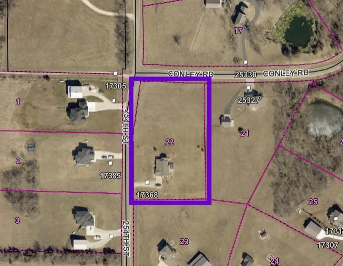 From downtown Tonganoxie: Head west on State Ave / US-24 toward the western edge of town. Turn left (south) onto Tonganoxie Road. Continue south, then turn right (west) onto 254th Street. Follow 254th Street into Rocking C Estates—the property will be on the corner, positioned on an elevated homesite.