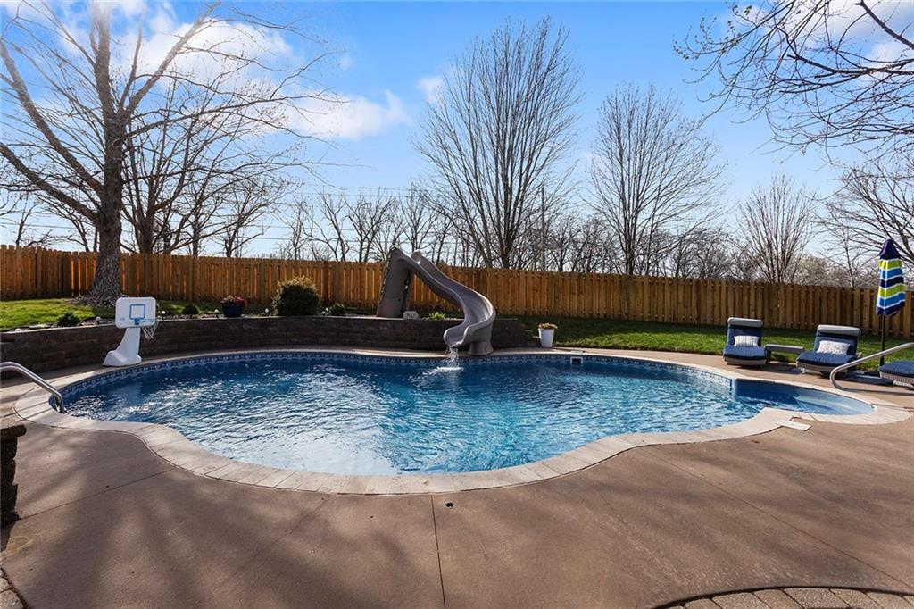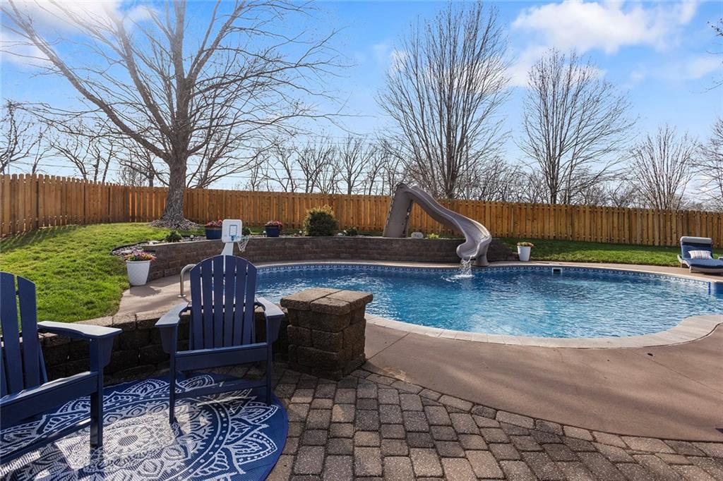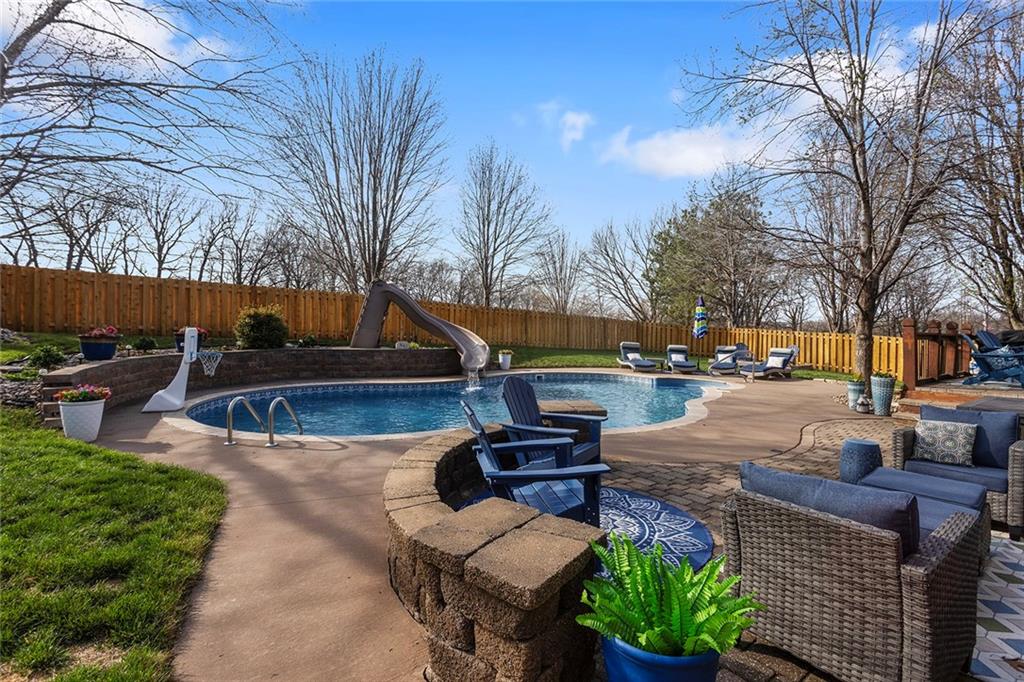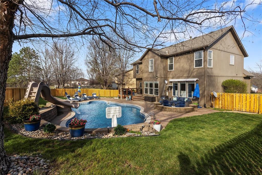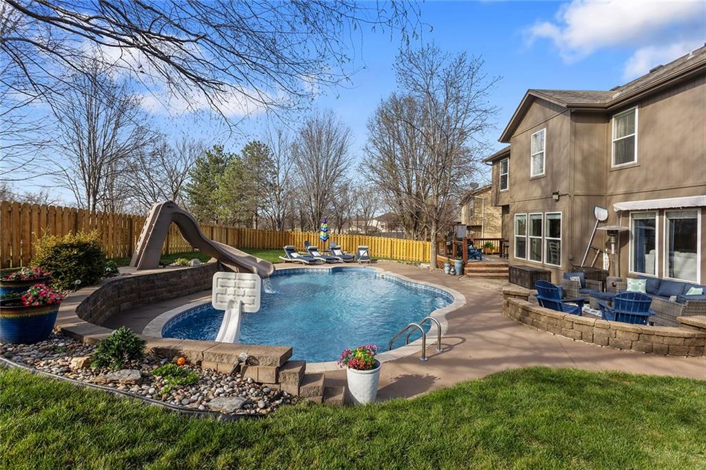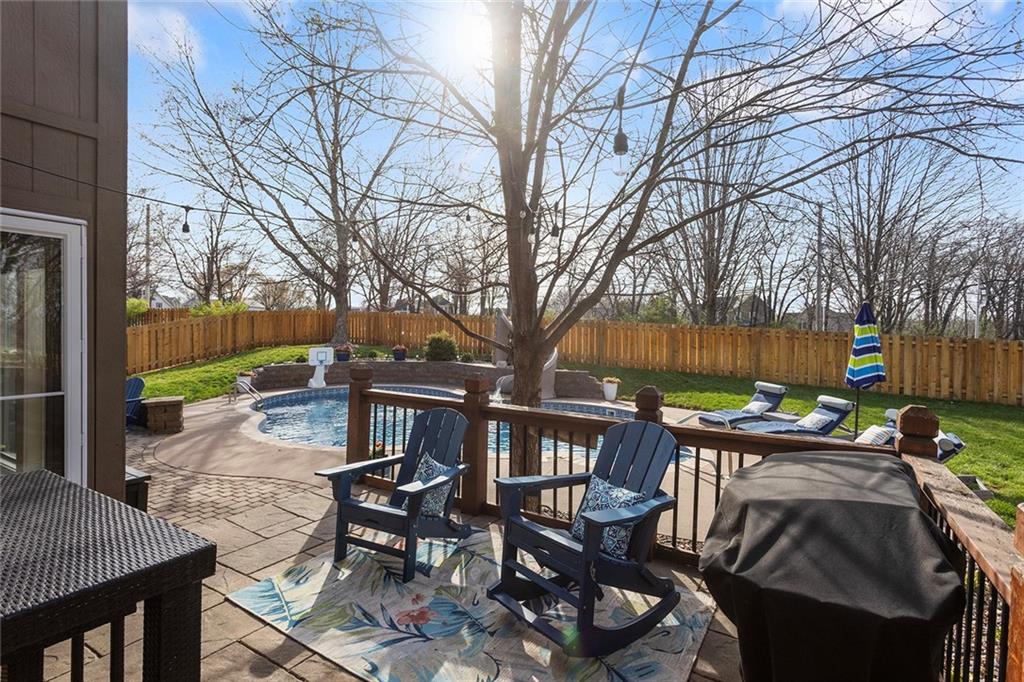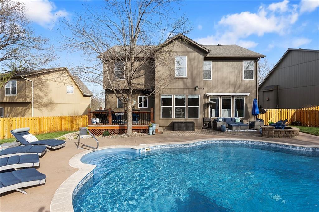 Welcome to this exceptional Shawnee residence with heated saltwater pool. The home is ideally situated on a cul-de-sac. Inside, the home showcases soaring ceilings, quality craftsmanship, and a thoughtfully designed floor plan suited for everyday living and hosting. Luxury vinyl plank flooring extends throughout the main level. A formal dining room and light-filled living room which features a striking masonry fireplace. The kitchen is well-appointed with a large island, granite countertops, and a pantry, offering both functionality and style. The half bath provides secondary access to the back deck and pool. The spacious primary suite serves as a private retreat, complete with a bath featuring a soaking tub, walk-in shower, dual vanities, and an expansive walk-in closet with access to additional out of sight storage areas. The second level also includes generously sized secondary bedrooms which include ample closet spaces; two with walk-in closets and one with dual closets. A full bath and conveniently located laundry room complete the upper level. The finished lower level is designed for versatility and entertainment, offering a large recreation area, additional space for a game table and another area for fitness equipment or future bar. A fifth non-conforming bedroom with a private full bath completes the lower level. The backyard is a private retreat, surrounded by a fully fenced yard. Outdoor living is enhanced by a wood deck, an expansive paver patio, and a dedicated firepit area; perfect for both relaxation and entertaining. Recent updates include newer fence, pool liner (1 year old), HVAC system and water heater (2 years old). Ideally located near three De Soto schools and scenic walking trails, this home combines comfort, style, and convenience in a highly desirable setting.