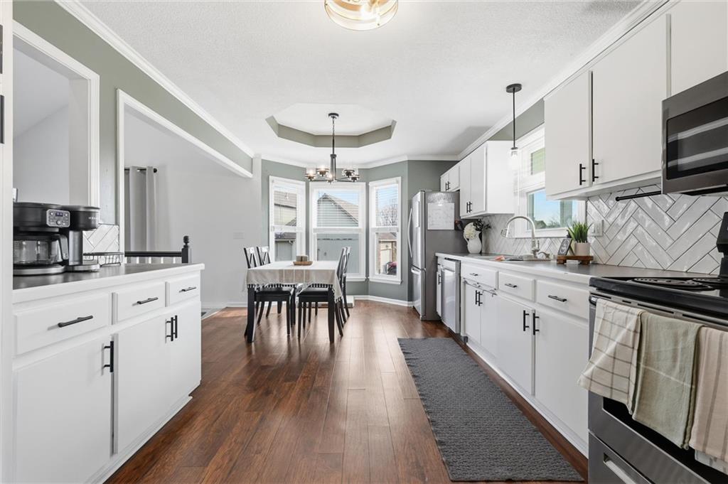 Welcome home to this beautifully maintained raised ranch in Raymore! From the moment you arrive, you’ll be charmed by the inviting covered front porch and standout curb appeal. Inside, this 3-bedroom, 2.5-bath home offers a seamless flow from the entry into the kitchen and spacious great room, complete with a cozy fireplace—perfect for both everyday living and entertaining. Stylish touches like wainscoting along the hallway add character, while the expansive layout continues with a unique loft space above the master featuring hardwood floors—ideal for a home office, reading nook, or flex space. Step outside and fall in love with your private backyard retreat! The full-length deck spans the entire back of the home and includes direct access from the primary suite—perfect for morning coffee or unwinding in the evening. The patio leads to a stunning 3-year-old in-ground pool, creating the ultimate setup for summer entertaining. All of this sits on a large, fenced lot offering both space and privacy. This home truly has it all—style, function, and an outdoor oasis you won’t want to miss!