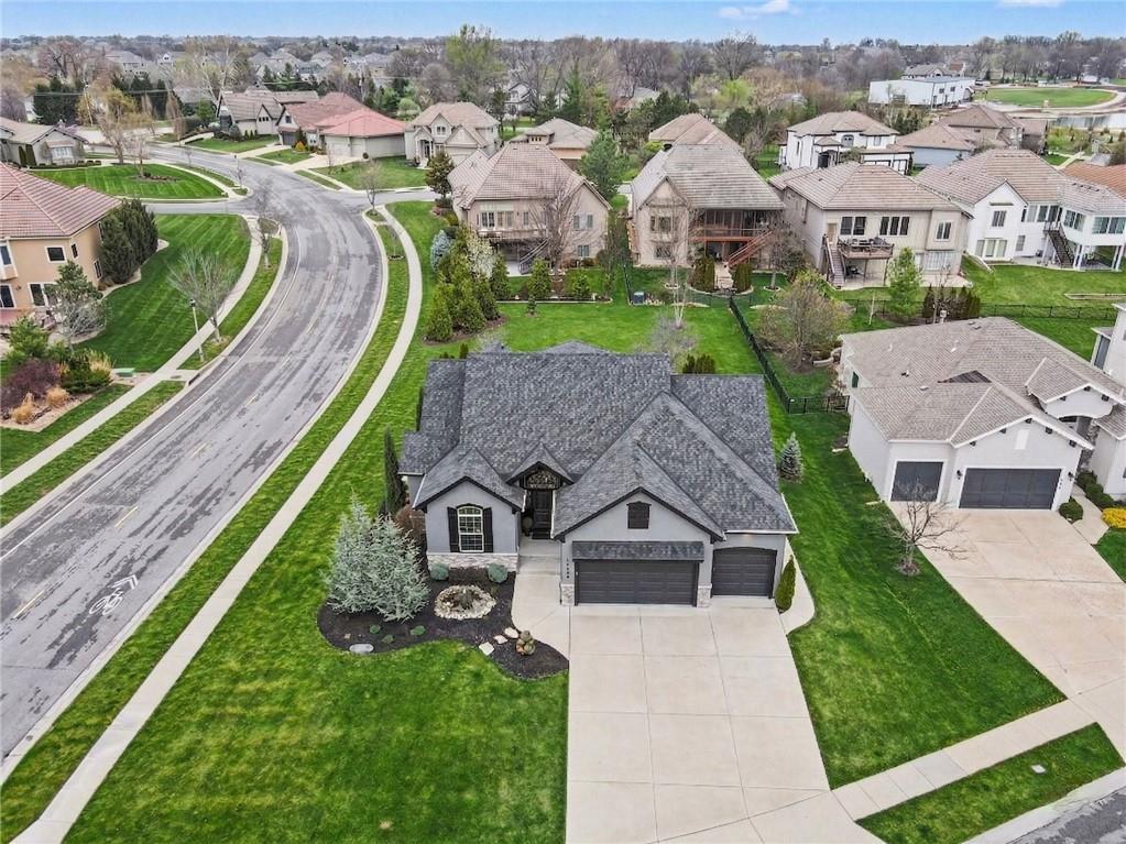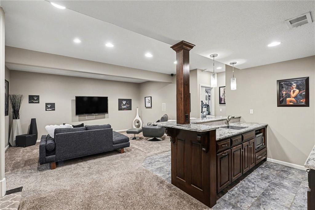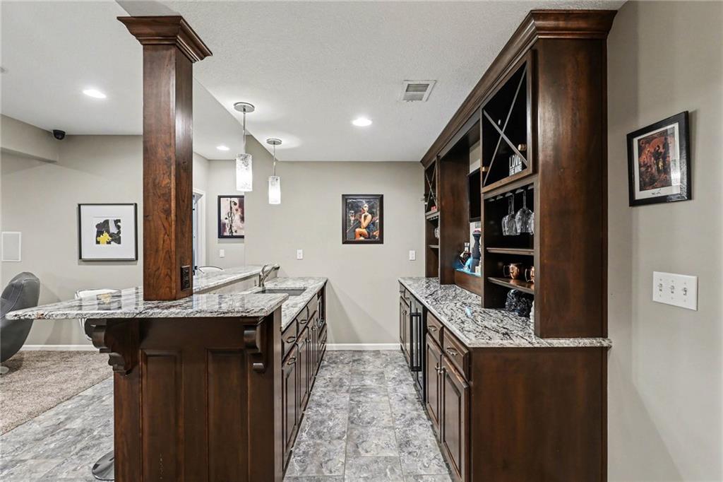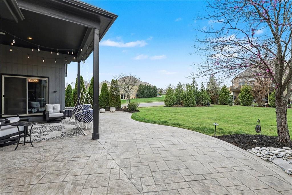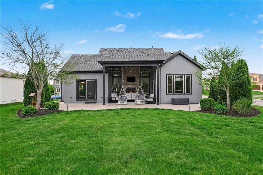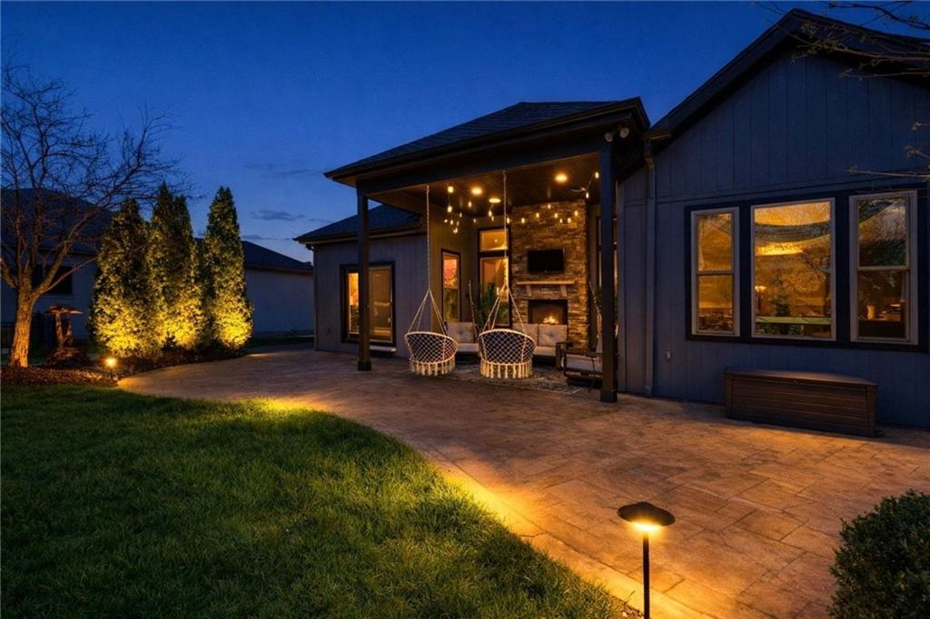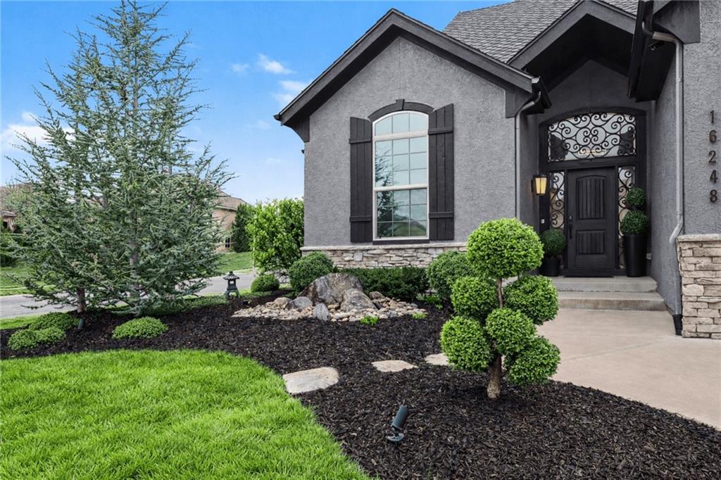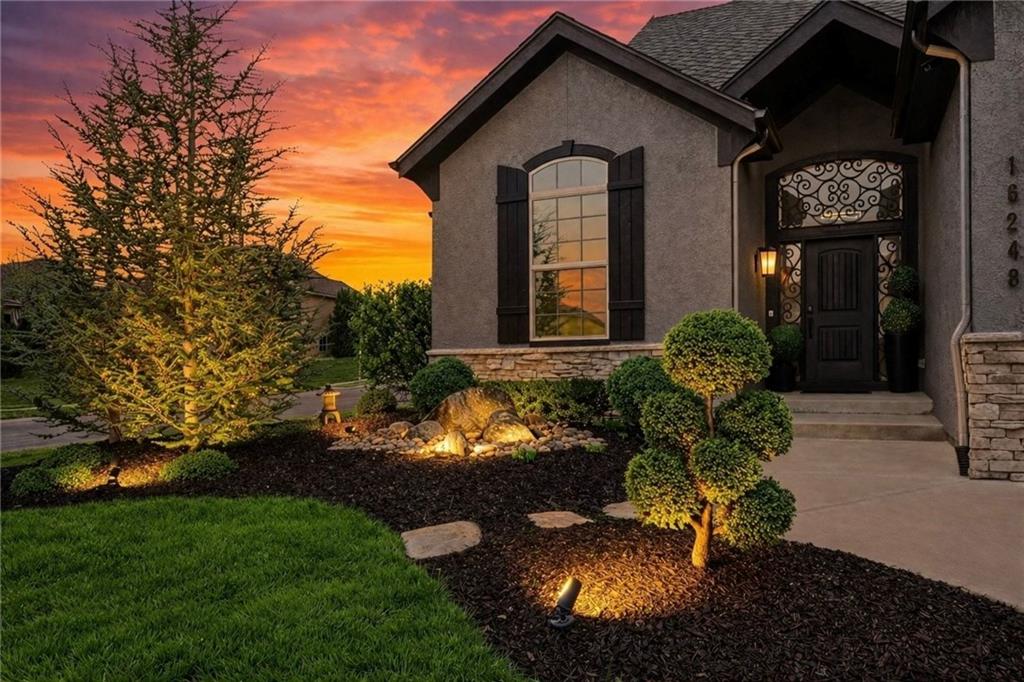 Custom built, upgraded and exceptionally well maintained by the original owner, this Reverse 1.5 Story is impressive. Every inch and finish was thoughtfully curated for the owners enjoyment, comfort and security. Fresh exterior paint, brand new roof, backlit address, up lit landscaping and a water feature provide the ultimate curb appeal. Drawn inside by the vaulted ceilings, stacked stone fireplace highlighted by a 110 piece blown glass fixture by Seth Parks and dimmed for entertaining in the open concept main level. Smart sound system throughout main, lower and exterior living spaces. Upgraded kitchen with thoughtfully planned pantry space, opens to a vaulted dining space. Beautiful landscaping and lighting pulls the outdoors in from every vantage point. Accessible from both the dining area and the primary suite, enjoy the backyard from the covered or uncovered stamped concrete patio space and yard large enough to easily add a pool! Finished lower level entertainment space offers recreation room with wet-bar, 2 additional bedrooms with ensuite bathrooms. Plus plenty of storage in 2 fully insulated unfinished spaces- including a storm shelter! Extra tall and deep finished garage will impress the large truck owners. Be sure to see the full list of upgrades because there are too many to list here!