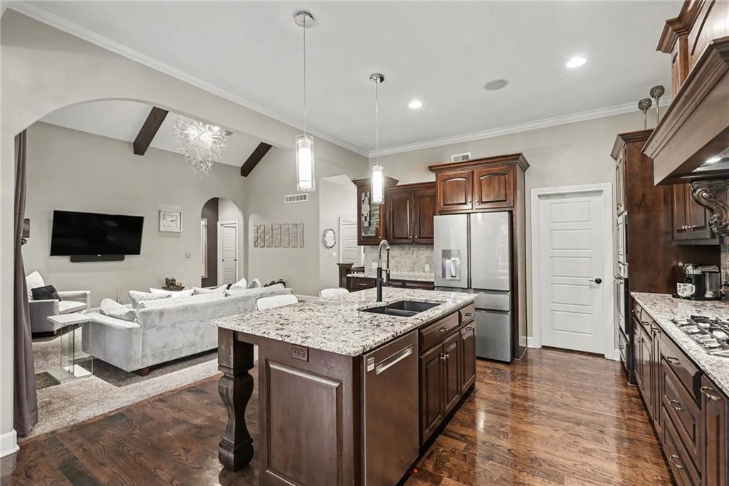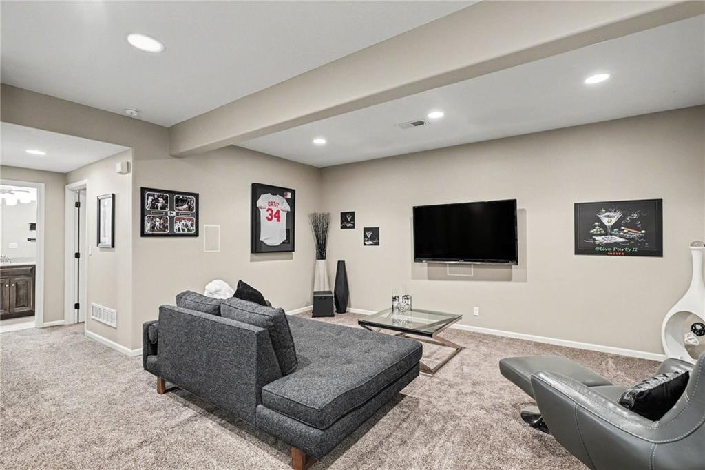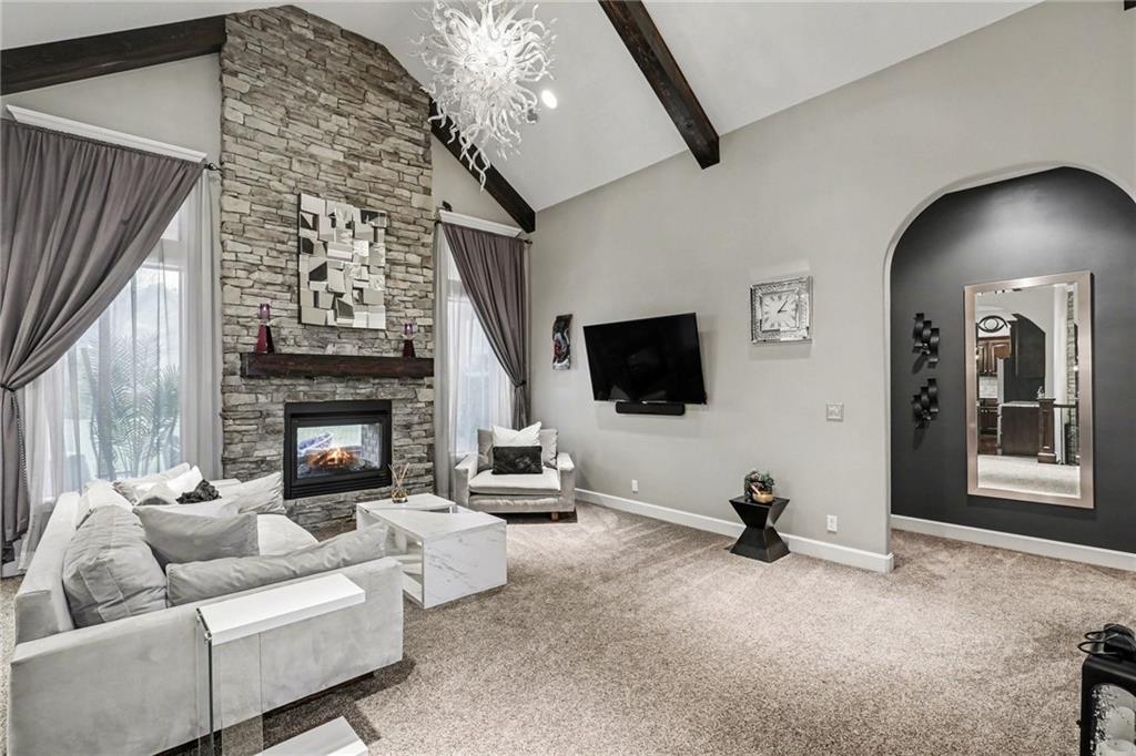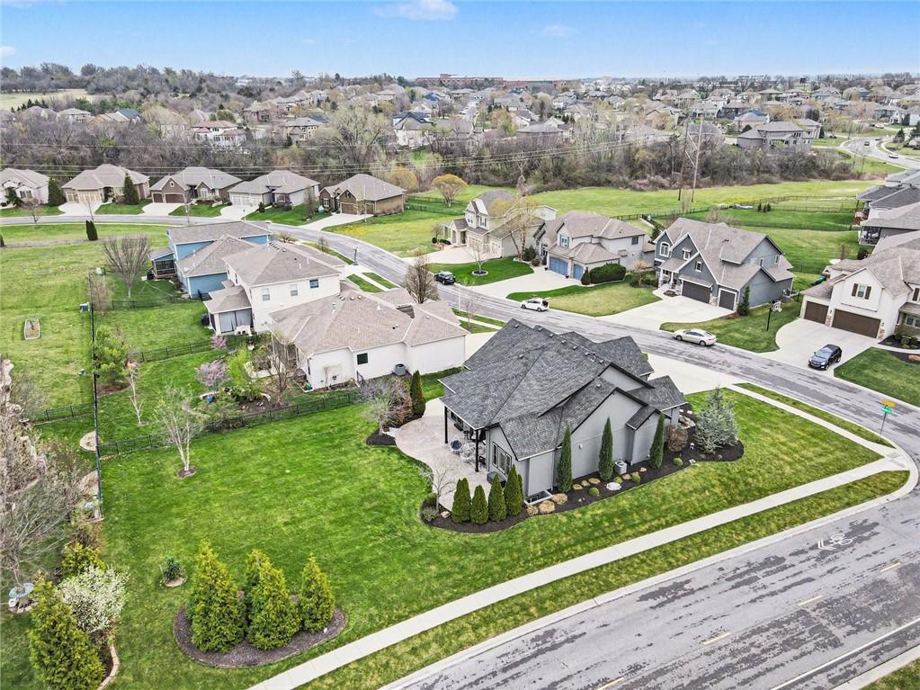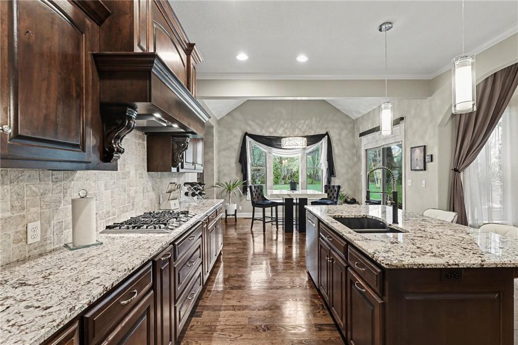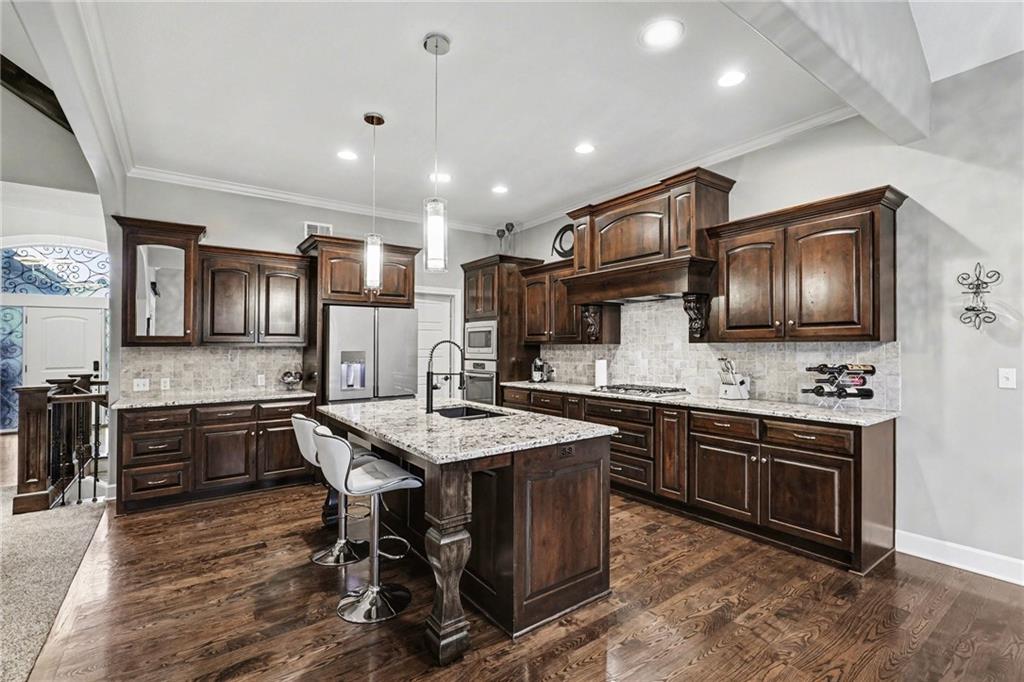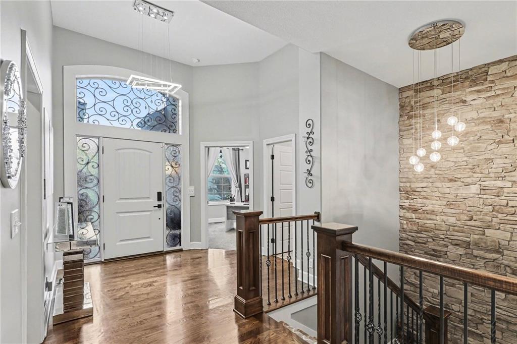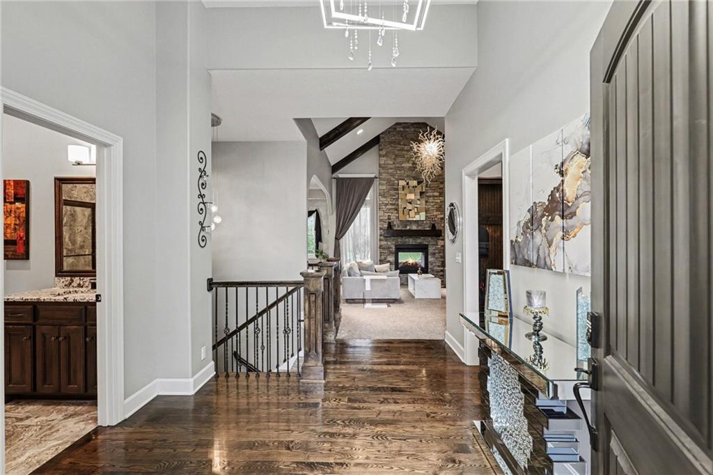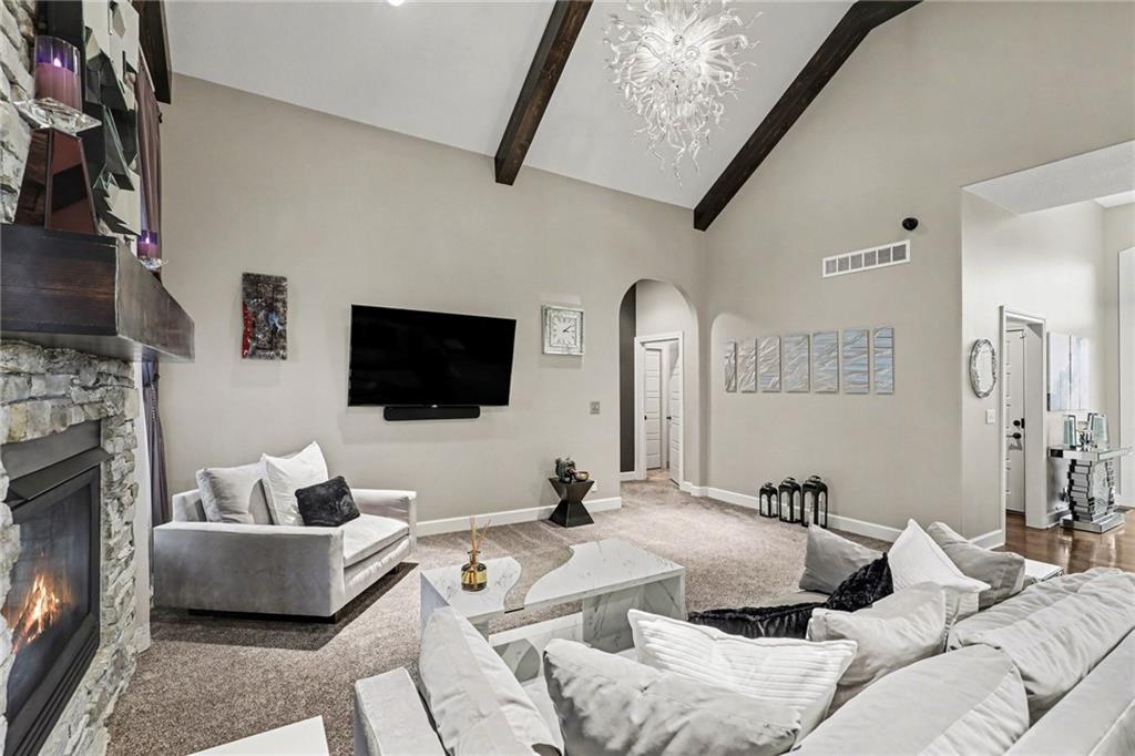 Custom built, upgraded and exceptionally well maintained by the original owner, this Reverse 1.5 Story is impressive. Every inch and finish was thoughtfully curated for the owners enjoyment, comfort and security. Fresh exterior paint, brand new roof, backlit address, up lit landscaping and a water feature provide the ultimate curb appeal. Drawn inside by the vaulted ceilings, stacked stone fireplace highlighted by a 110 piece blown glass fixture by Seth Parks and dimmed for entertaining in the open concept main level. Smart sound system throughout main, lower and exterior living spaces. Upgraded kitchen with thoughtfully planned pantry space, opens to a vaulted dining space. Beautiful landscaping and lighting pulls the outdoors in from every vantage point. Accessible from both the dining area and the primary suite, enjoy the backyard from the covered or uncovered stamped concrete patio space and yard large enough to easily add a pool! Finished lower level entertainment space offers recreation room with wet-bar, 2 additional bedrooms with ensuite bathrooms. Plus plenty of storage in 2 fully insulated unfinished spaces- including a storm shelter! Extra tall and deep finished garage will impress the large truck owners. Be sure to see the full list of upgrades because there are too many to list here!