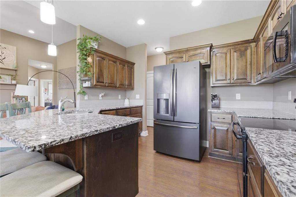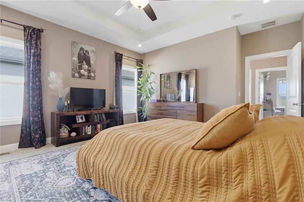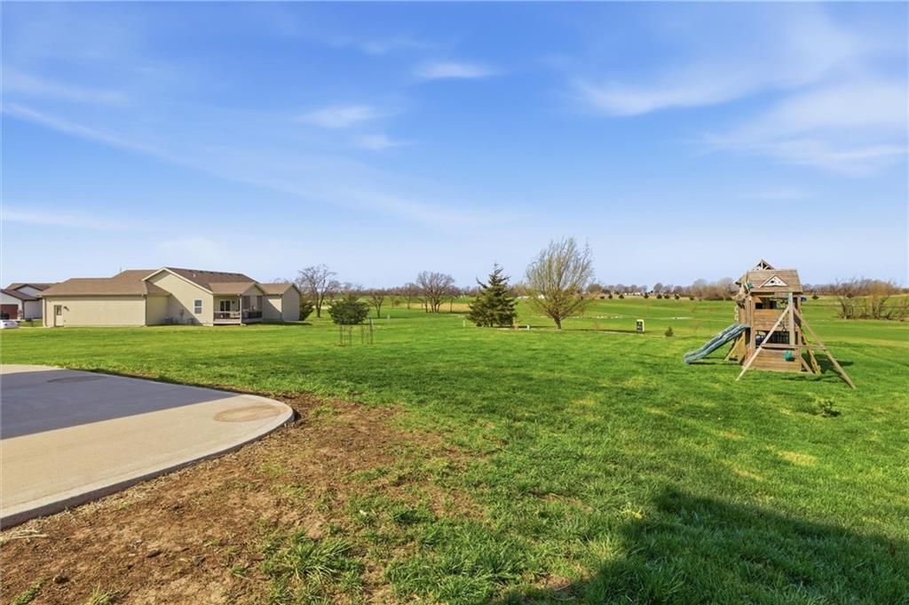 Enjoy golf course living in this well-maintained ranch home backing to the 18th hole at Hidden Valley Golf Course in Lawson! Built in 2018, this 3-bedroom, 2-bathroom home offers true main-level living with an open and airy layout with tall ceilings in the living room. The spacious primary bedroom features a private bathroom and walk-in closet. Walk out to the back deck that steps down to the large patio—perfect for relaxing or entertaining while taking in the beautiful views of the golf course. Deep backyard and very well cared for landscaping beds. Concrete storm/safe room in garage. Located in the desirable Lawson School District with quick access to Hwy 69, this home offers a great blend of comfort, convenience, and scenery.