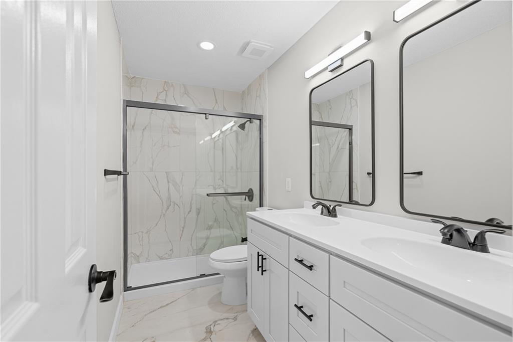 Completely reimagined inside and out, this Shawnee home offers the rare chance to move into a space that already feels brand new. Nearly every surface has been refreshed or redesigned to create a home that feels cohesive, elevated, and truly move-in ready. The kitchen sets the tone for the entire home, anchored by a stunning wrap-around waterfall-edge marble island with matching marble backsplash. Soft-close cabinetry, oversized sink with touchless faucet, and a premium appliance package including Samsung Bespoke refrigerator and dishwasher, 36-inch Frigidaire gas cooktop, Fotile range hood, and GE double wall oven with built-in microwave bring both style and function together beautifully. Updated flooring, baseboards, and fresh paint continue the polished feel throughout the main level. Upstairs features brand new flooring throughout, fresh paint, an expanded primary closet, and an updated primary bathroom with marble tile flooring, walk-in shower with sliding glass doors, and double-sink vanity with soft-close cabinetry. The finished basement lives like a natural extension of the home with marble tile flooring, a beautifully updated full bathroom, new lighting, fresh paint, hardwood stairs with updated handrails, and a flexible space ready for a guest suite, workout room, or second living area. Located in one of Shawnee’s most convenient areas near parks, trails, shopping, dining, and highway access, homes with this level of renovation rarely come available.
