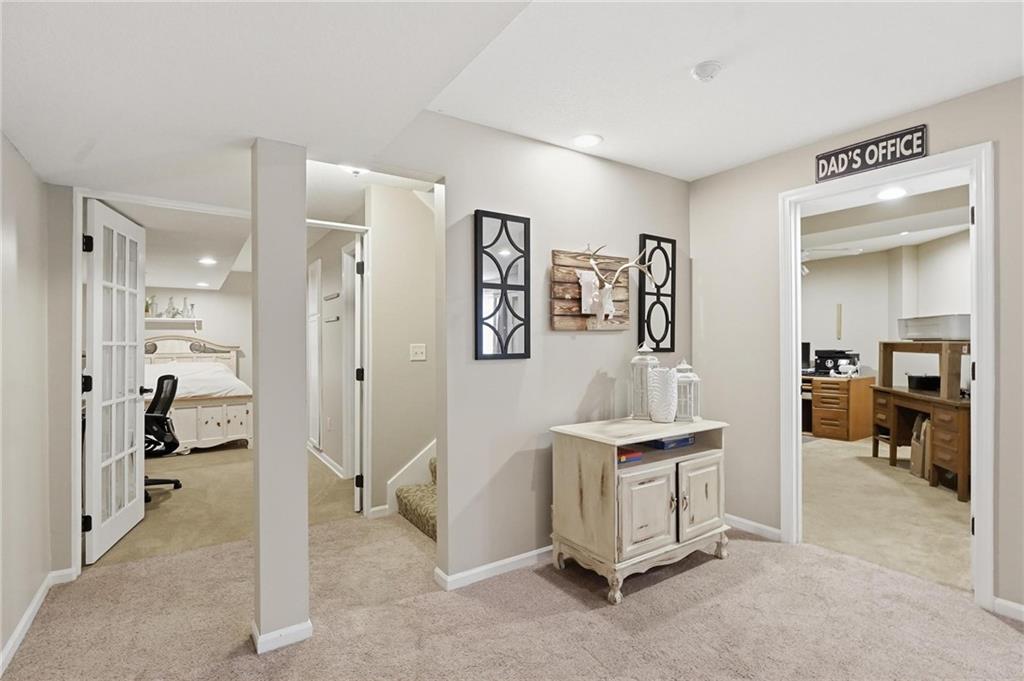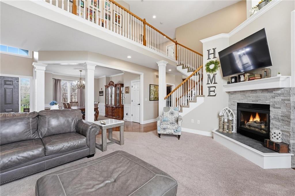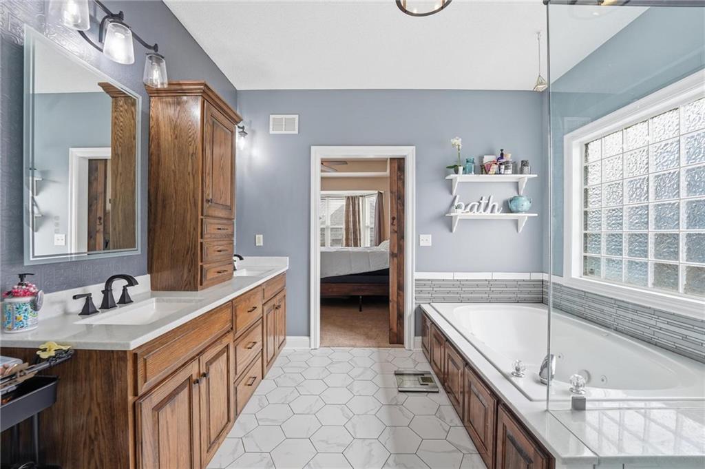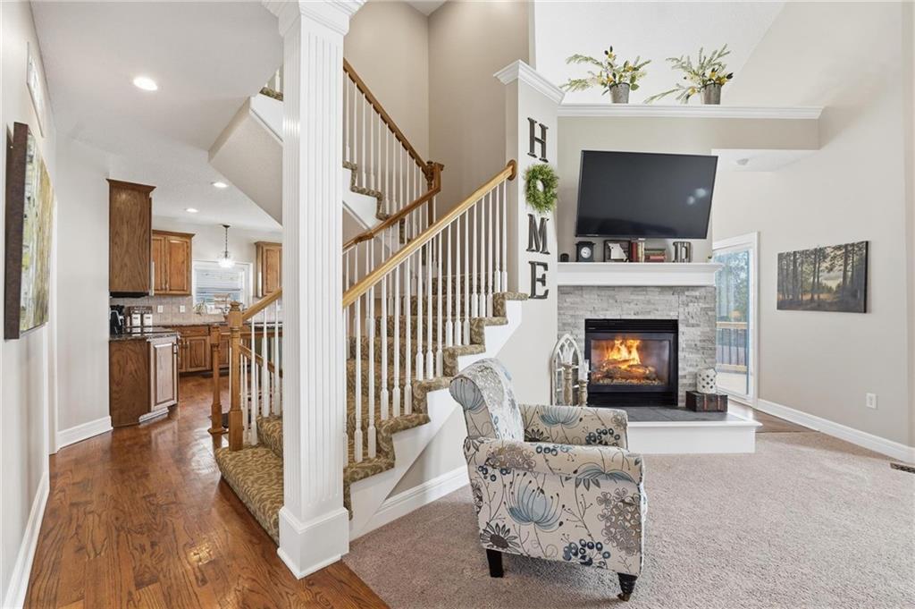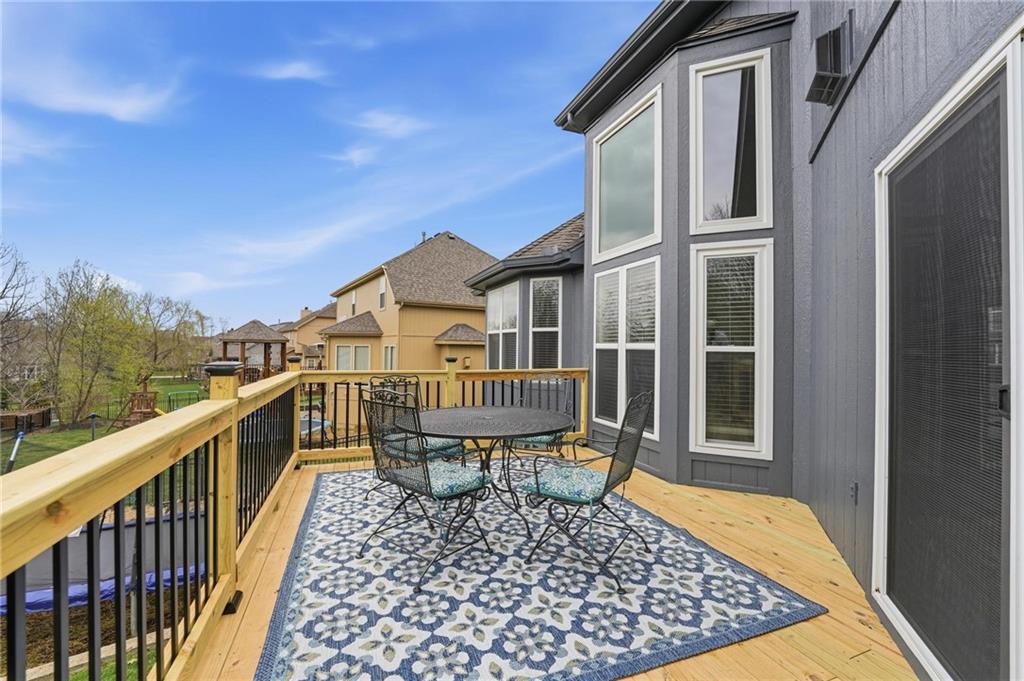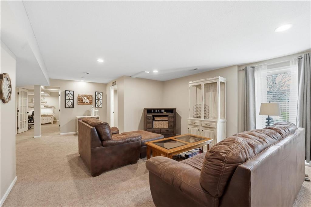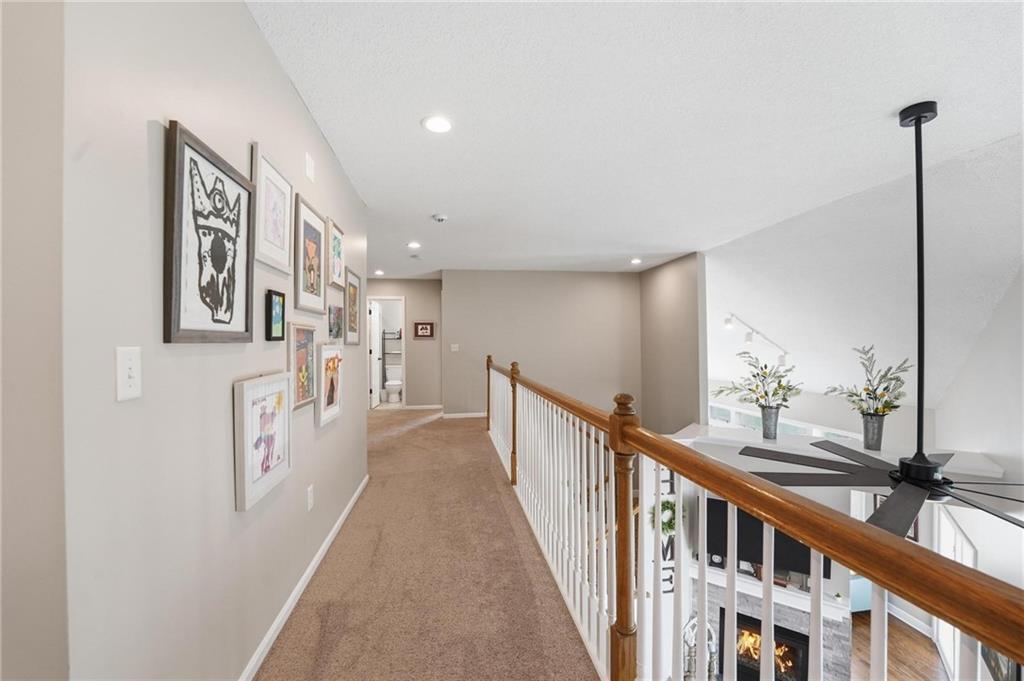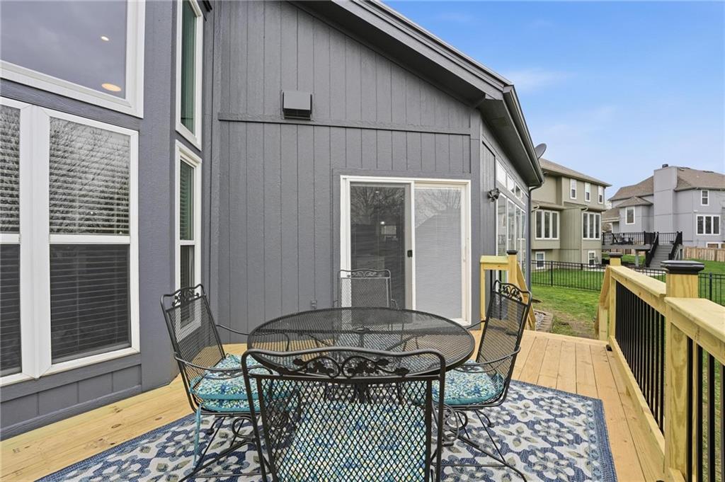 This beautifully designed 1.5-story home offers space, character, and a layout that truly stands out, along with an abundance of storage throughout. The main-level primary suite provides a private retreat, featuring a barn-style sliding door leading to the updated bathroom complete with a jetted tub, separate shower, double vanity with built-in cabinetry, a private toilet room, and a large walk-in closet with custom shelving. Just off the entry, you’ll find a formal dining room, with the living room straight ahead showcasing dramatic floor-to-ceiling windows, a stunning see-through fireplace, and an open view to the second-floor balcony above. The bright, eat-in kitchen features floor-to-ceiling windows, granite countertops, a rustic painted island, and stainless steel appliances—perfect for both everyday living and entertaining. Adjacent to the breakfast area is a cozy sitting room with access to the see-through fireplace and direct entry to the brand-new deck overlooking the fenced backyard—ideal for outdoor living. Upstairs, you’ll find three additional bedrooms. Bedrooms two and three are connected by a Hollywood-style bathroom, while the third bedroom also offers hallway access—perfect for guests. The finished lower level adds even more living space with a media area, dry bar, sitting area, full bathroom, and two additional rooms perfect for a home office, gym, or hobby space. Fresh paint inside and out, thoughtful updates, and inviting spaces throughout make this home move-in ready and a must-see.