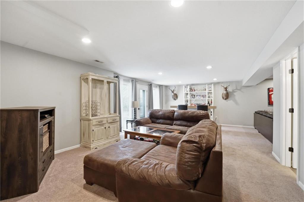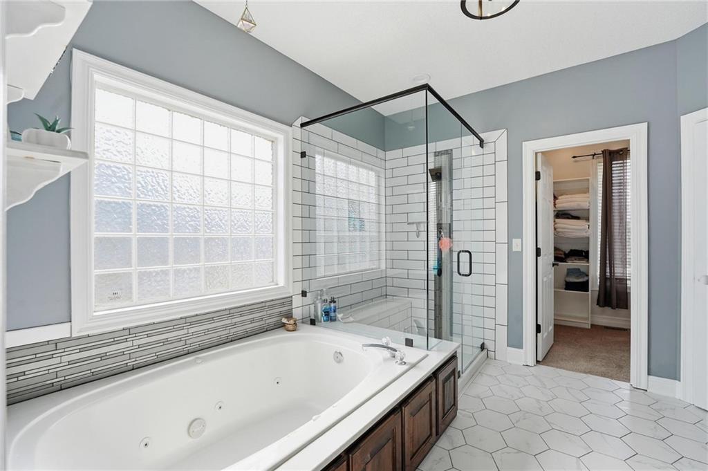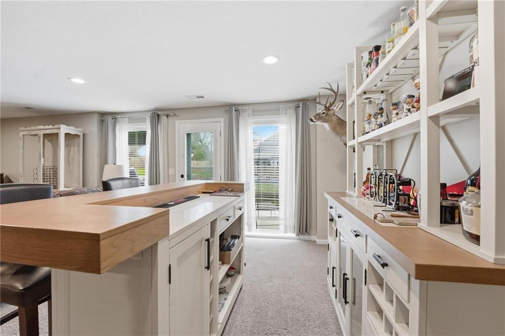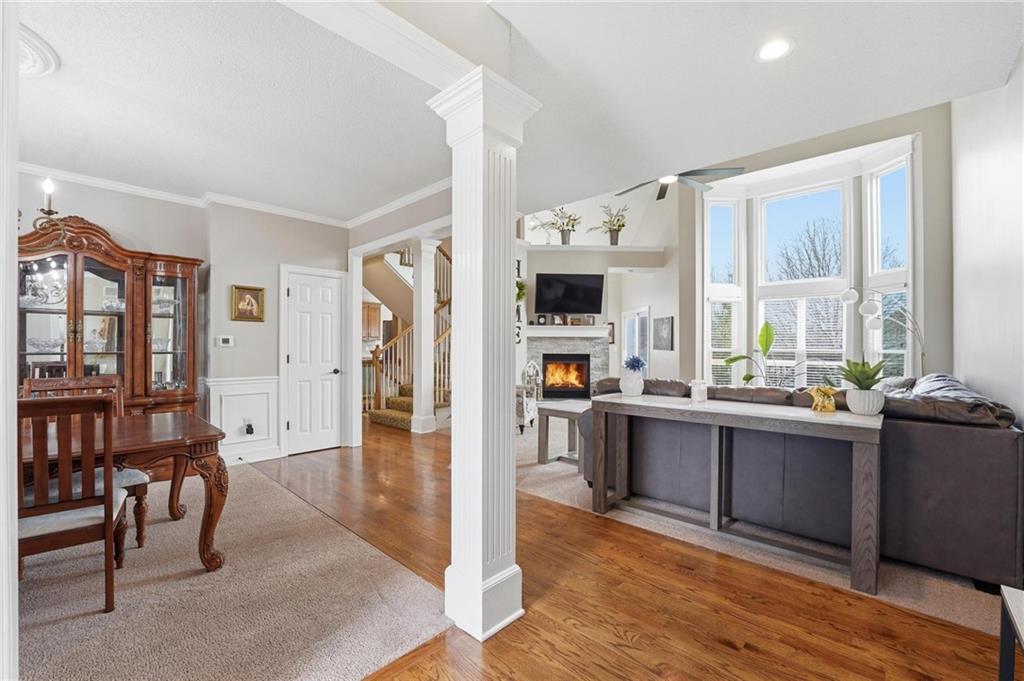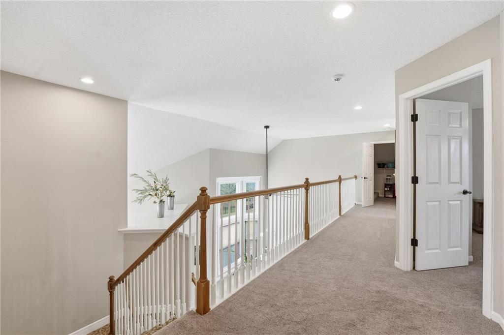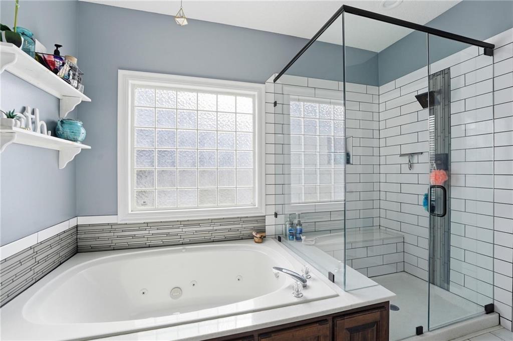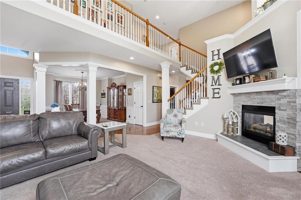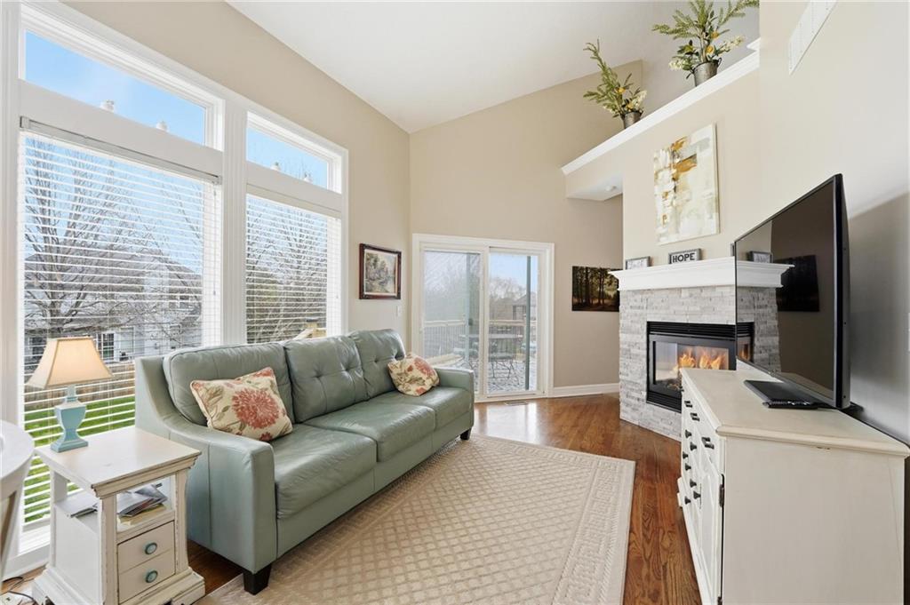 This beautifully designed 1.5-story home offers space, character, and a layout that truly stands out, along with an abundance of storage throughout. The main-level primary suite provides a private retreat, featuring a barn-style sliding door leading to the updated bathroom complete with a jetted tub, separate shower, double vanity with built-in cabinetry, a private toilet room, and a large walk-in closet with custom shelving. Just off the entry, you’ll find a formal dining room, with the living room straight ahead showcasing dramatic floor-to-ceiling windows, a stunning see-through fireplace, and an open view to the second-floor balcony above. The bright, eat-in kitchen features floor-to-ceiling windows, granite countertops, a rustic painted island, and stainless steel appliances—perfect for both everyday living and entertaining. Adjacent to the breakfast area is a cozy sitting room with access to the see-through fireplace and direct entry to the brand-new deck overlooking the fenced backyard—ideal for outdoor living. Upstairs, you’ll find three additional bedrooms. Bedrooms two and three are connected by a Hollywood-style bathroom, while the third bedroom also offers hallway access—perfect for guests. The finished lower level adds even more living space with a media area, dry bar, sitting area, full bathroom, and two additional rooms perfect for a home office, gym, or hobby space. Fresh paint inside and out, thoughtful updates, and inviting spaces throughout make this home move-in ready and a must-see.