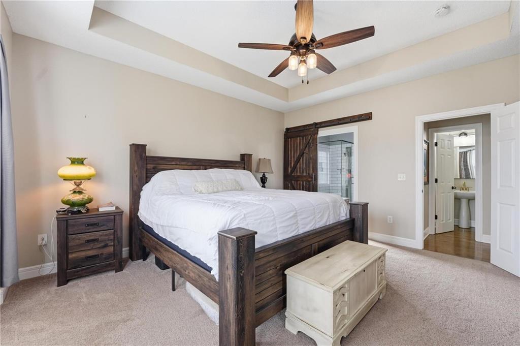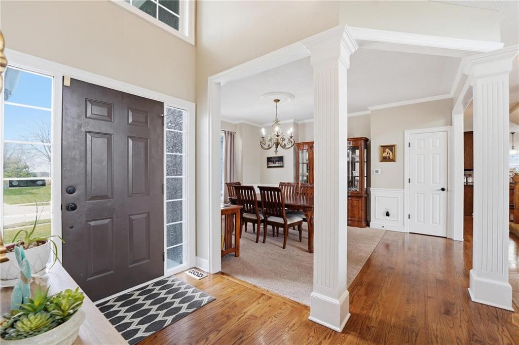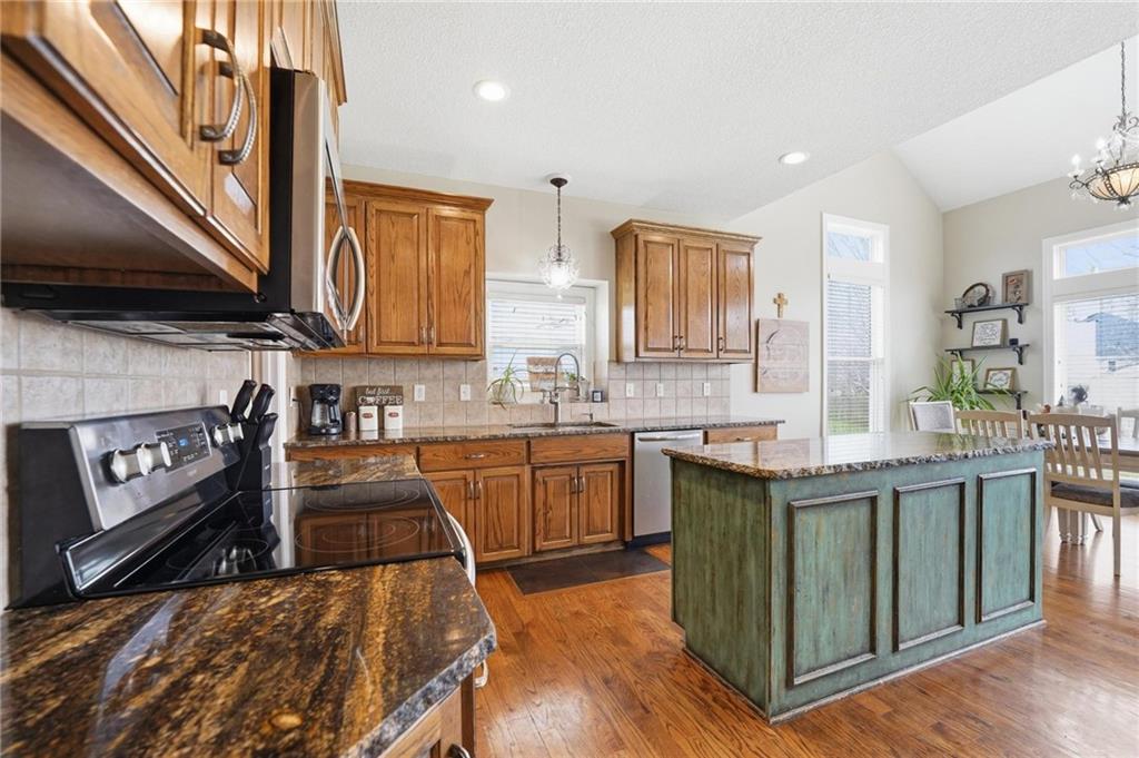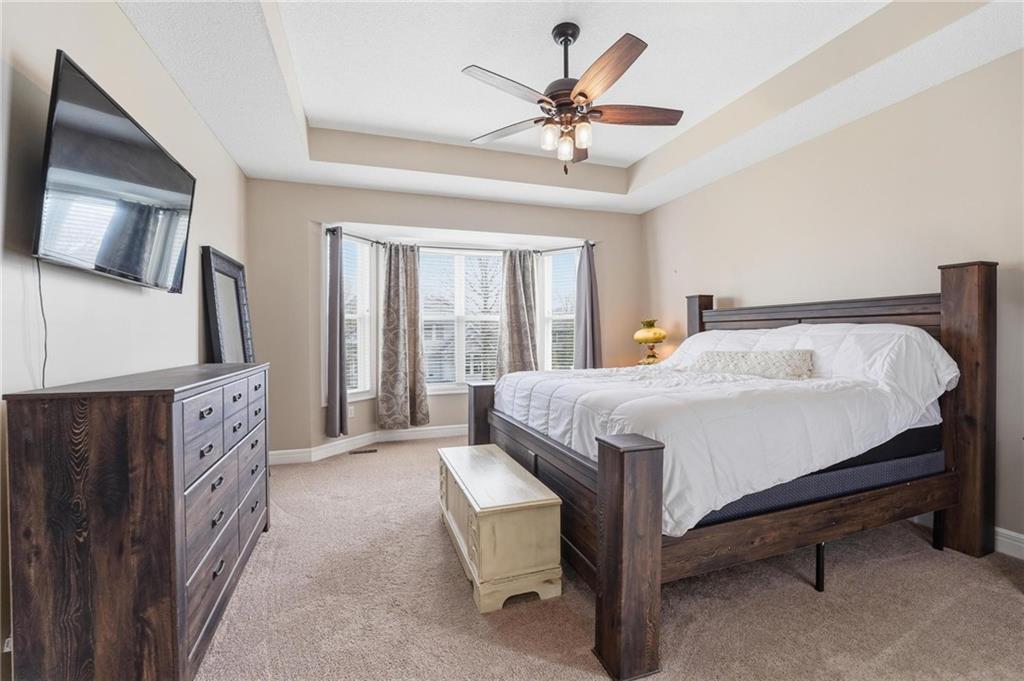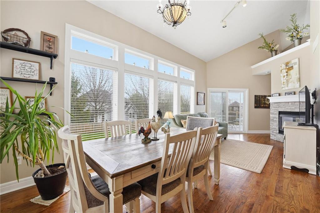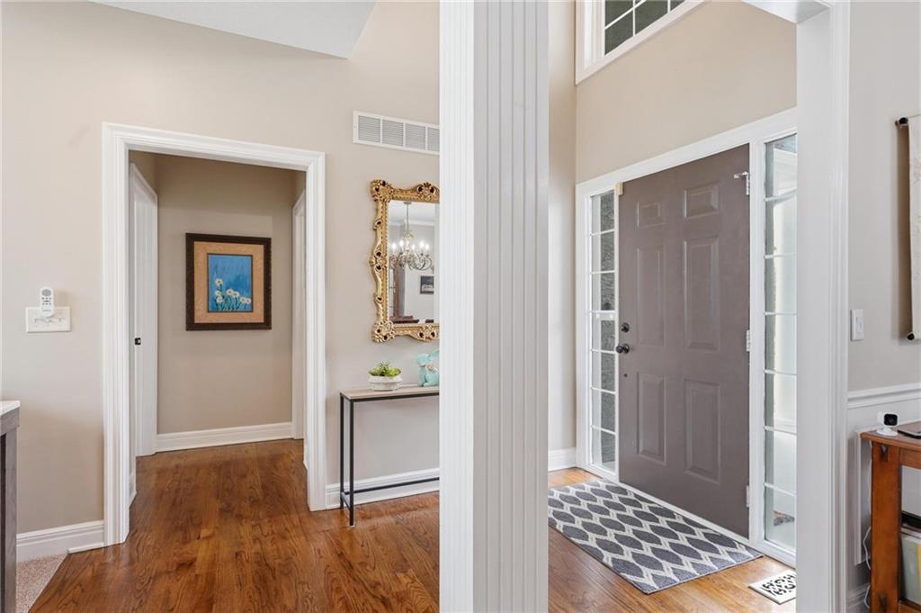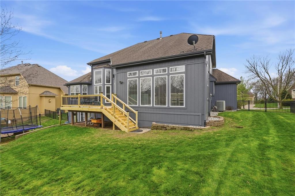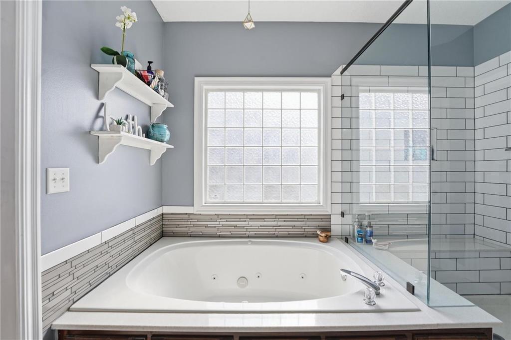 This beautifully designed 1.5-story home offers space, character, and a layout that truly stands out, along with an abundance of storage throughout. The main-level primary suite provides a private retreat, featuring a barn-style sliding door leading to the updated bathroom complete with a jetted tub, separate shower, double vanity with built-in cabinetry, a private toilet room, and a large walk-in closet with custom shelving. Just off the entry, you’ll find a formal dining room, with the living room straight ahead showcasing dramatic floor-to-ceiling windows, a stunning see-through fireplace, and an open view to the second-floor balcony above. The bright, eat-in kitchen features floor-to-ceiling windows, granite countertops, a rustic painted island, and stainless steel appliances—perfect for both everyday living and entertaining. Adjacent to the breakfast area is a cozy sitting room with access to the see-through fireplace and direct entry to the brand-new deck overlooking the fenced backyard—ideal for outdoor living. Upstairs, you’ll find three additional bedrooms. Bedrooms two and three are connected by a Hollywood-style bathroom, while the third bedroom also offers hallway access—perfect for guests. The finished lower level adds even more living space with a media area, dry bar, sitting area, full bathroom, and two additional rooms perfect for a home office, gym, or hobby space. Fresh paint inside and out, thoughtful updates, and inviting spaces throughout make this home move-in ready and a must-see.