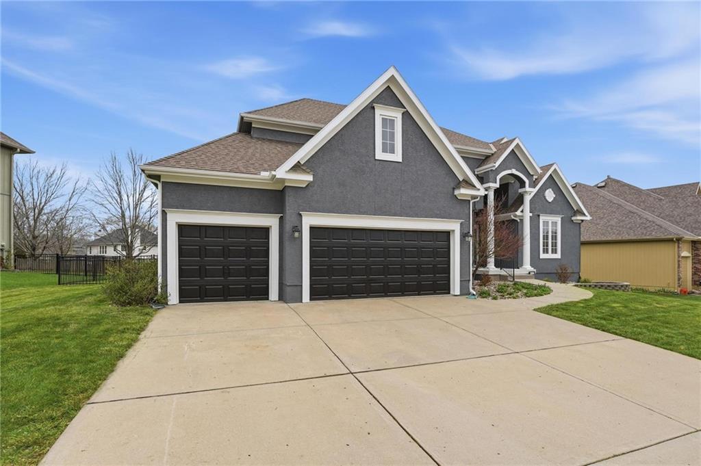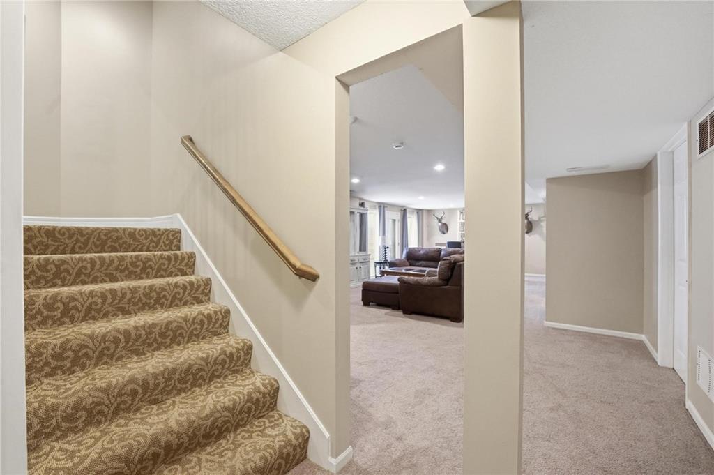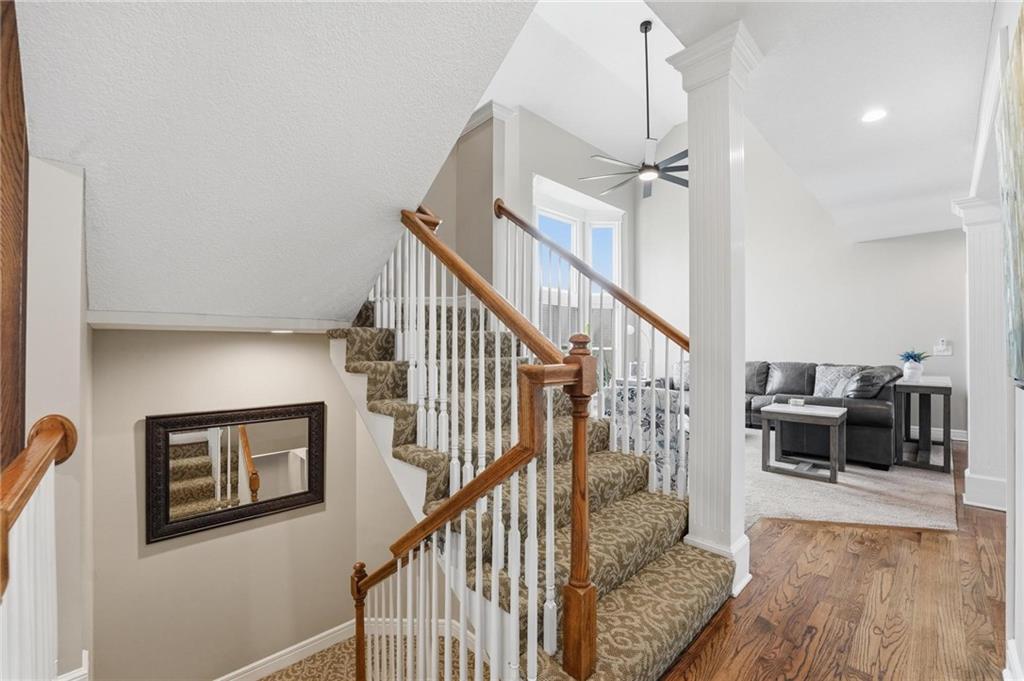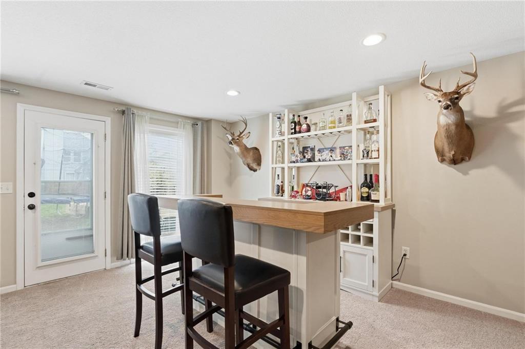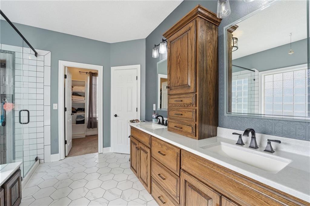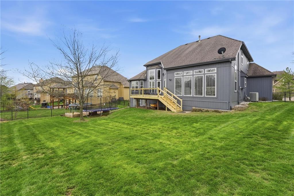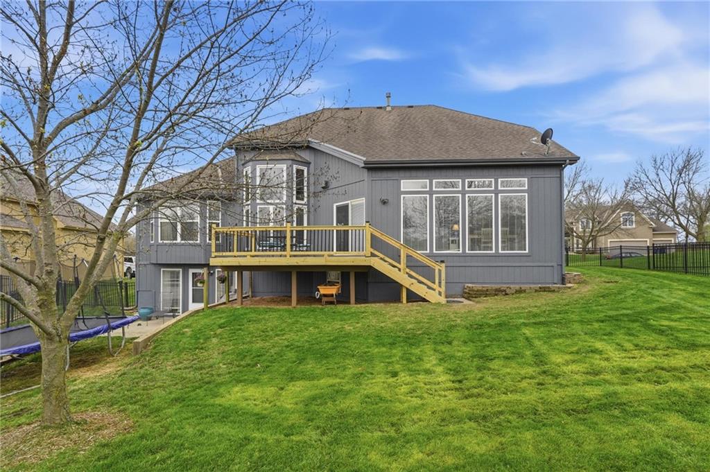 This beautifully designed 1.5-story home offers space, character, and a layout that truly stands out, along with an abundance of storage throughout. The main-level primary suite provides a private retreat, featuring a barn-style sliding door leading to the updated bathroom complete with a jetted tub, separate shower, double vanity with built-in cabinetry, a private toilet room, and a large walk-in closet with custom shelving. Just off the entry, you’ll find a formal dining room, with the living room straight ahead showcasing dramatic floor-to-ceiling windows, a stunning see-through fireplace, and an open view to the second-floor balcony above. The bright, eat-in kitchen features floor-to-ceiling windows, granite countertops, a rustic painted island, and stainless steel appliances—perfect for both everyday living and entertaining. Adjacent to the breakfast area is a cozy sitting room with access to the see-through fireplace and direct entry to the brand-new deck overlooking the fenced backyard—ideal for outdoor living. Upstairs, you’ll find three additional bedrooms. Bedrooms two and three are connected by a Hollywood-style bathroom, while the third bedroom also offers hallway access—perfect for guests. The finished lower level adds even more living space with a media area, dry bar, sitting area, full bathroom, and two additional rooms perfect for a home office, gym, or hobby space. Fresh paint inside and out, thoughtful updates, and inviting spaces throughout make this home move-in ready and a must-see.