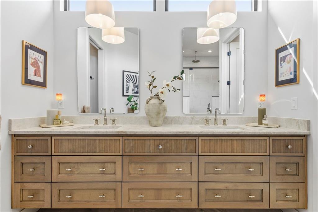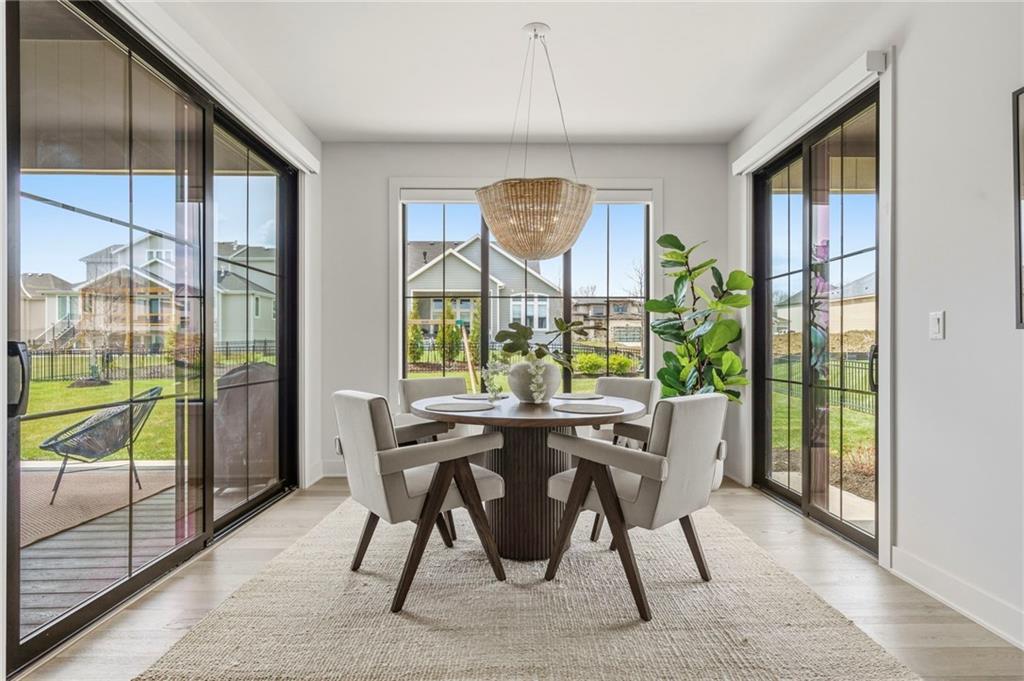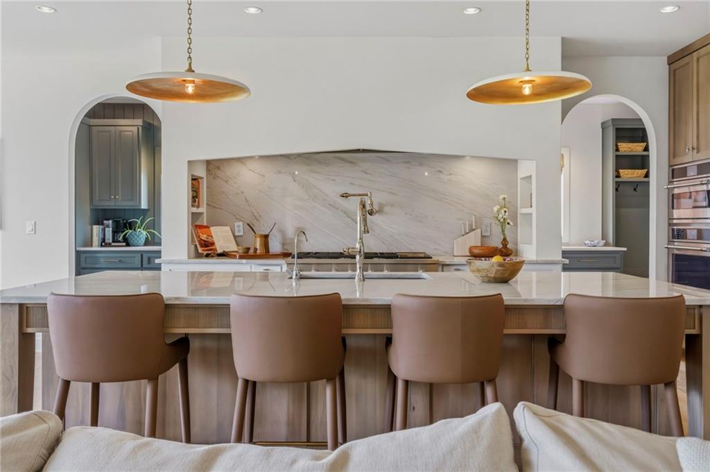 The kind of home where the design speaks for itself from the start. Originally built as the Bickimer Roosevelt 1.5-story model for the Parade of Homes, it carries a level of detail and intention that stands apart. Natural light, tall ceilings, and a striking great room with a cast stone fireplace and wood beam ceiling set the tone, while oversized glass doors create a strong sense of arrival. The kitchen is equally considered, featuring Taj Mahal quartzite, a statement plaster hood, reeded cabinetry, and a full butler’s pantry tucked just behind. Arched openings, custom millwork, and a bold sage mud hall bring depth and character throughout. This home goes beyond what is typically seen, with added upgrades including automatic window coverings throughout, a fully fenced backyard, epoxy garage floors, and elevated selections carried across every space! The main-level primary suite offers a quiet, retreat-like feel, while upstairs includes a loft and reading nook. The finished lower level is designed for entertaining with a bar, media space, full bath, and sauna. Set in Century Farms in the Blue Valley School District, the neighborhood offers a clubhouse, fitness center, resort-style pool, pickleball, and more, all just minutes from Bluehawk, parks, specialty grocers, dining, and everyday amenities!