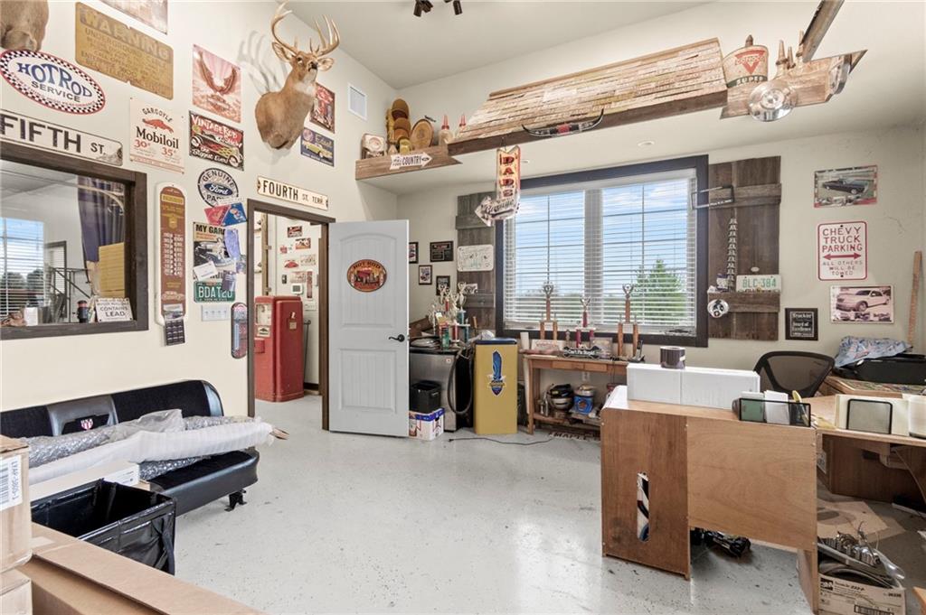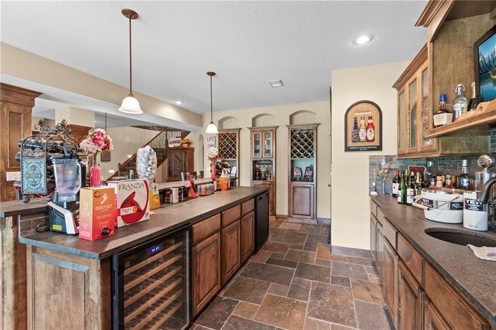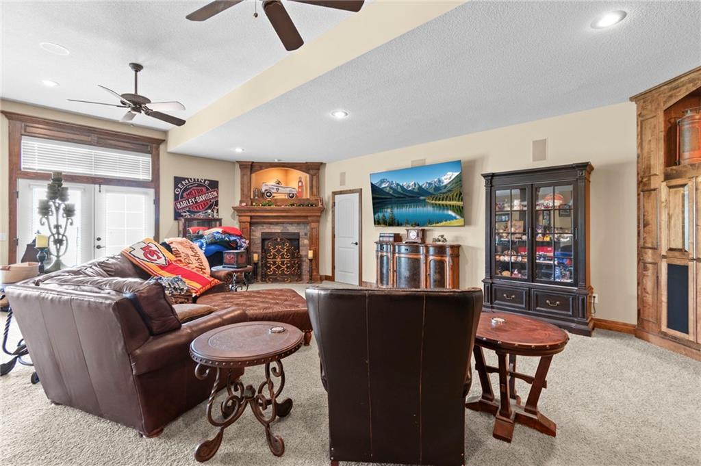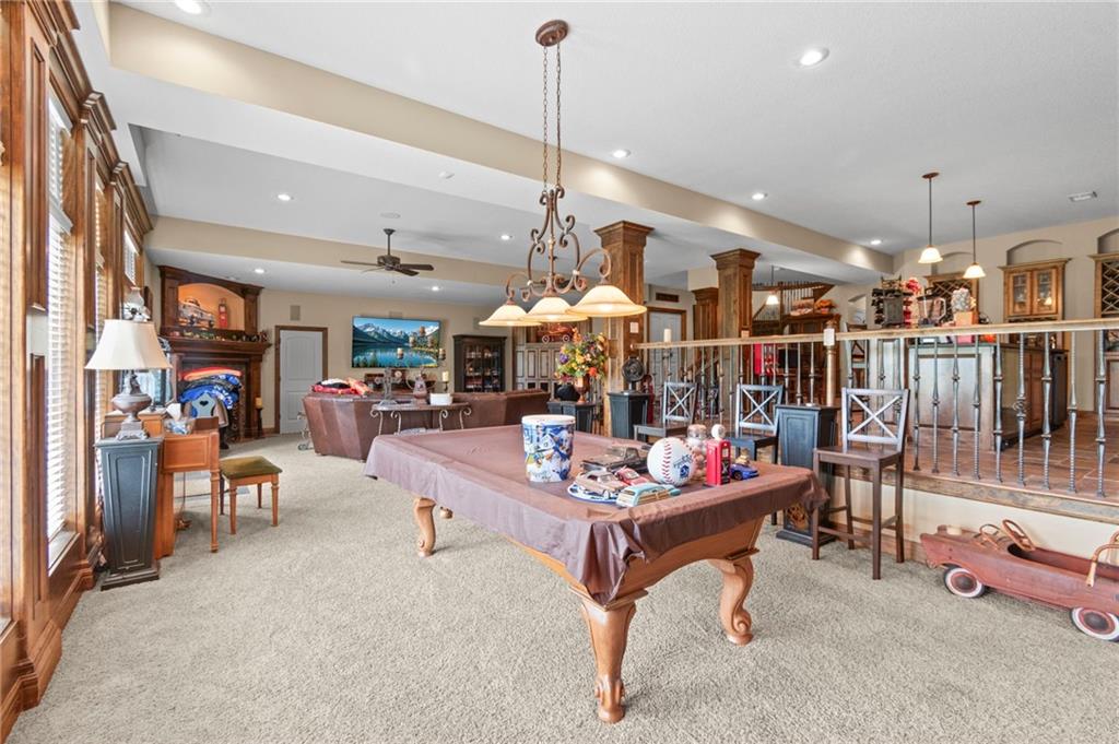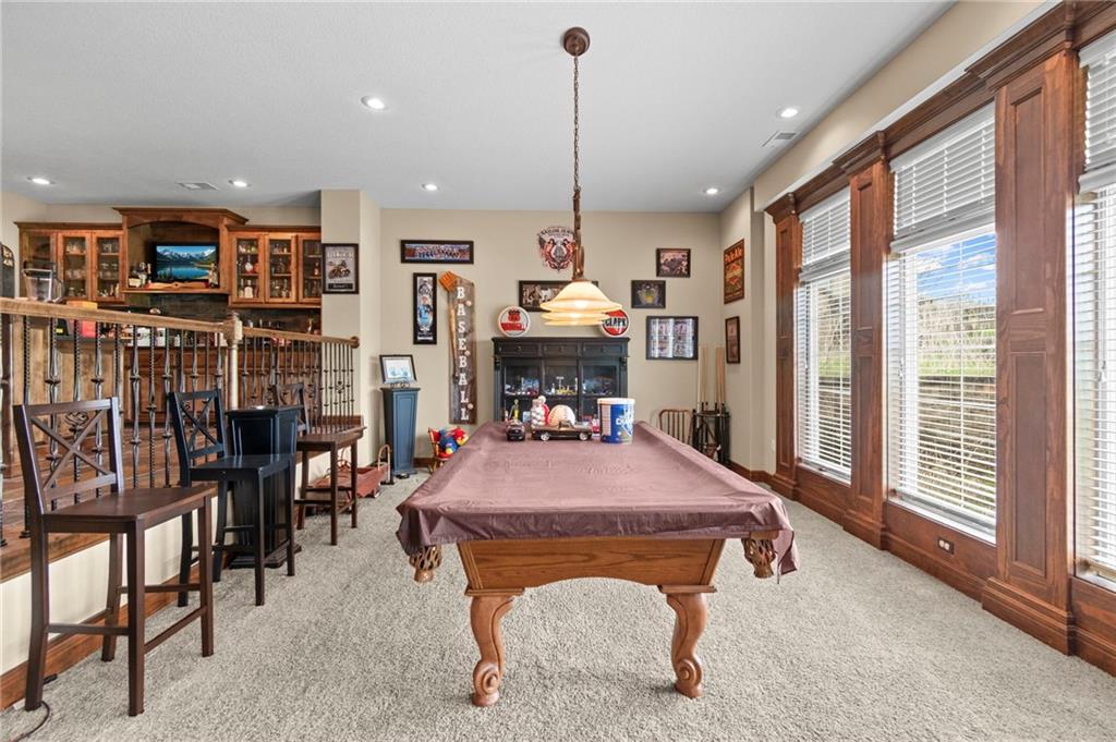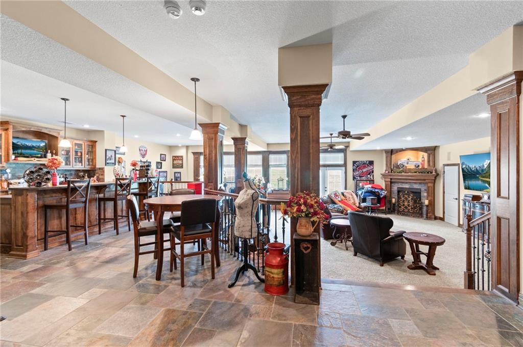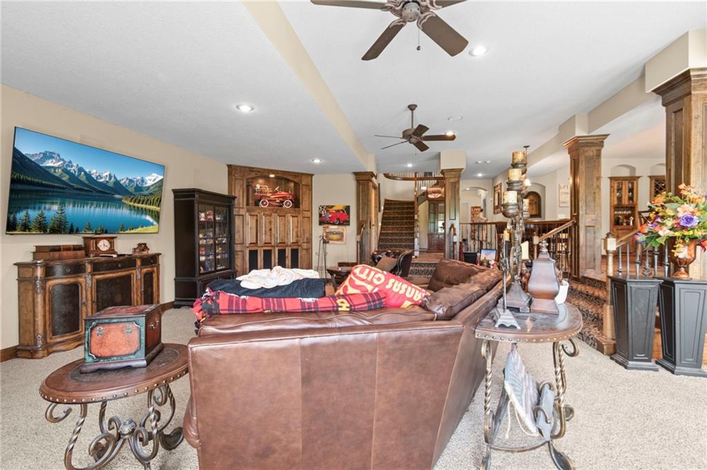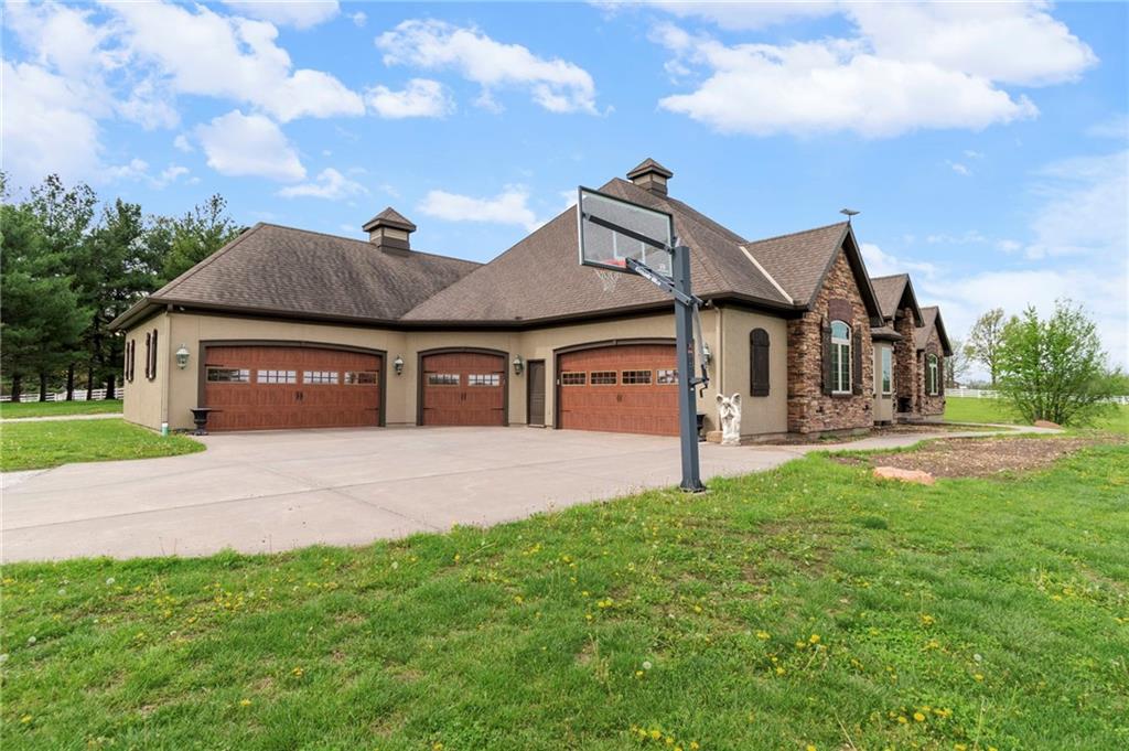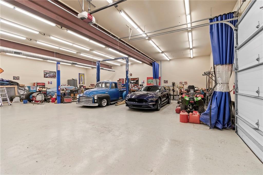 Set on nearly five acres just outside of town, this Kearney estate checks every box and then some. Inside, the main living space opens up with a layout that feels both spacious and connected. The living room, dining area, and kitchen flow together, anchored by hardwoods, tall ceilings, and natural light. A fireplace with custom built-ins adds a focal point without taking away from the scale. The kitchen is designed for real use. Granite counters, custom cabinetry, double wall ovens, and an oversized island make it easy to prep and gather. A walk-in pantry keeps everything within reach but out of sight, with space to sit and stay awhile nearby. The main level offers a flexible front room for a bedroom or office, plus two bedrooms connected by a bath with separate vanity areas. The primary suite is set apart with a large walk-in closet and a bathroom that feels like a retreat, complete with soaking tub, tiled shower with dual heads, and double vanity. Laundry with folding space and a half bath are also on this level. Downstairs, the finished lower level is built to host. A full wet bar with a large island opens to a second living area with its own fireplace. You’ll also find a half bath, flex room for a workout space or office, and a fifth bedroom with a private bath, ideal for guests or multi-generational living. Storage is extensive, with a suspended slab design offering approximately 55 by 31 of storage space, plus an additional 21 by 11 area. The six-car attached garage provides plenty of room, and the detached 60 by 49 shop takes it further with its own office, bathroom, car wash, and paint bay, plus an unfinished upper level for future use or storage. Built with intention, this home features structural beams for wide open spaces, twelve foot ceilings on both levels, and geothermal heating for long-term efficiency. Located in the Kearney School District, it offers a balance of space, function, and finish that’s hard to replicate.