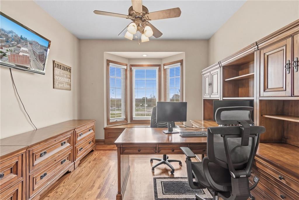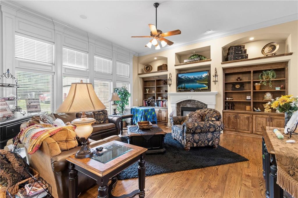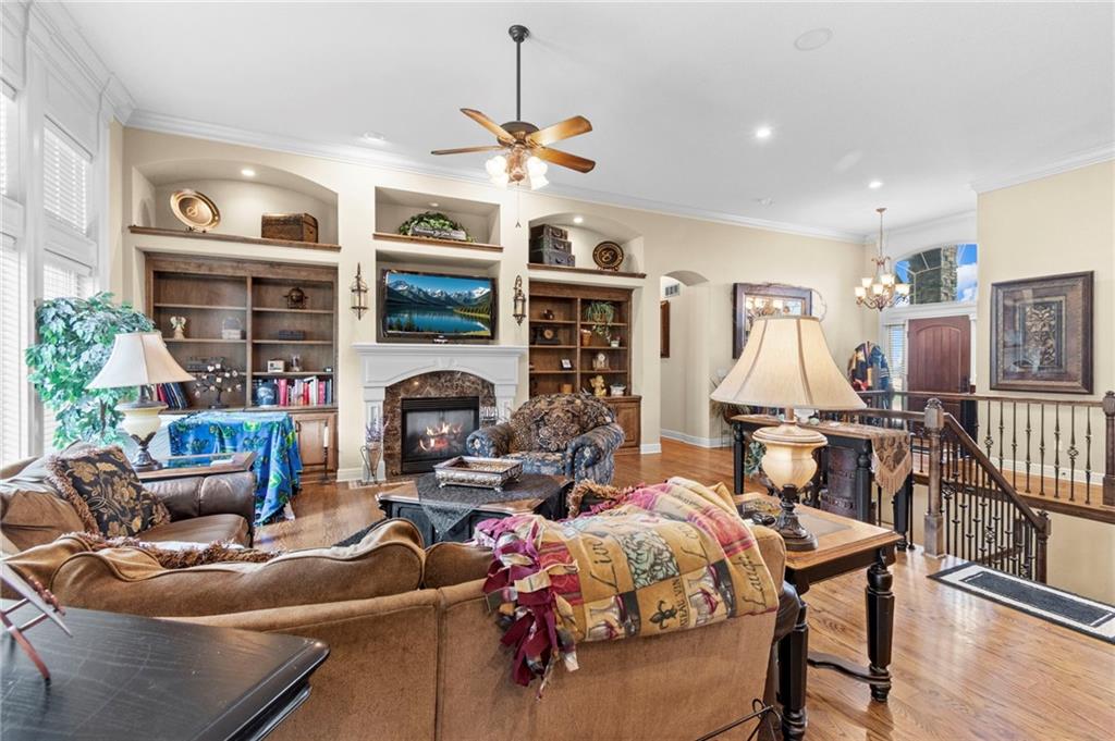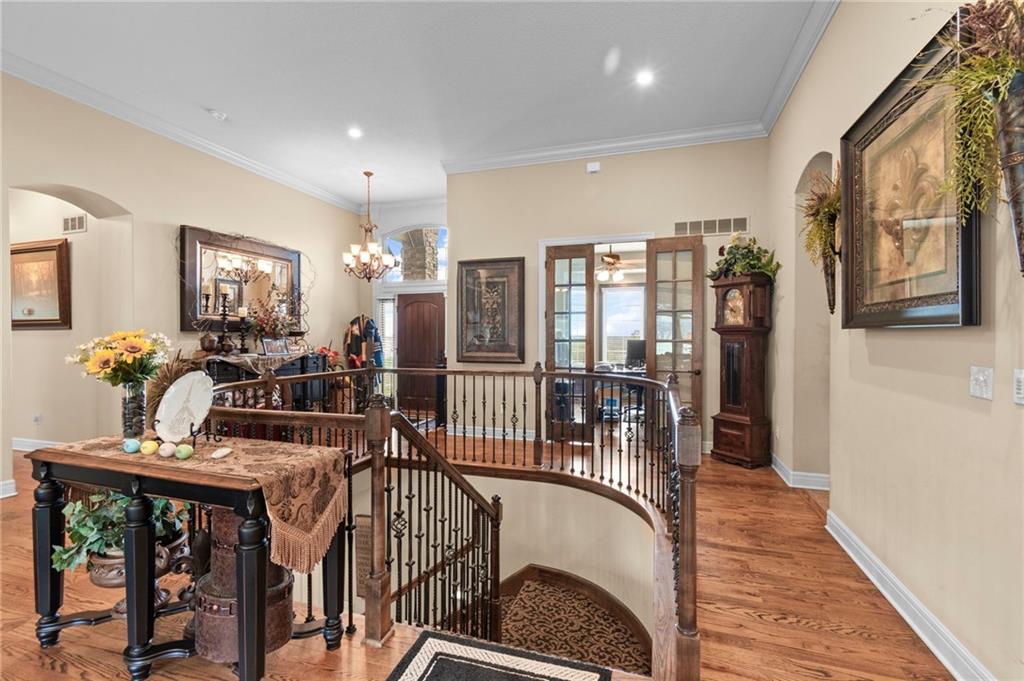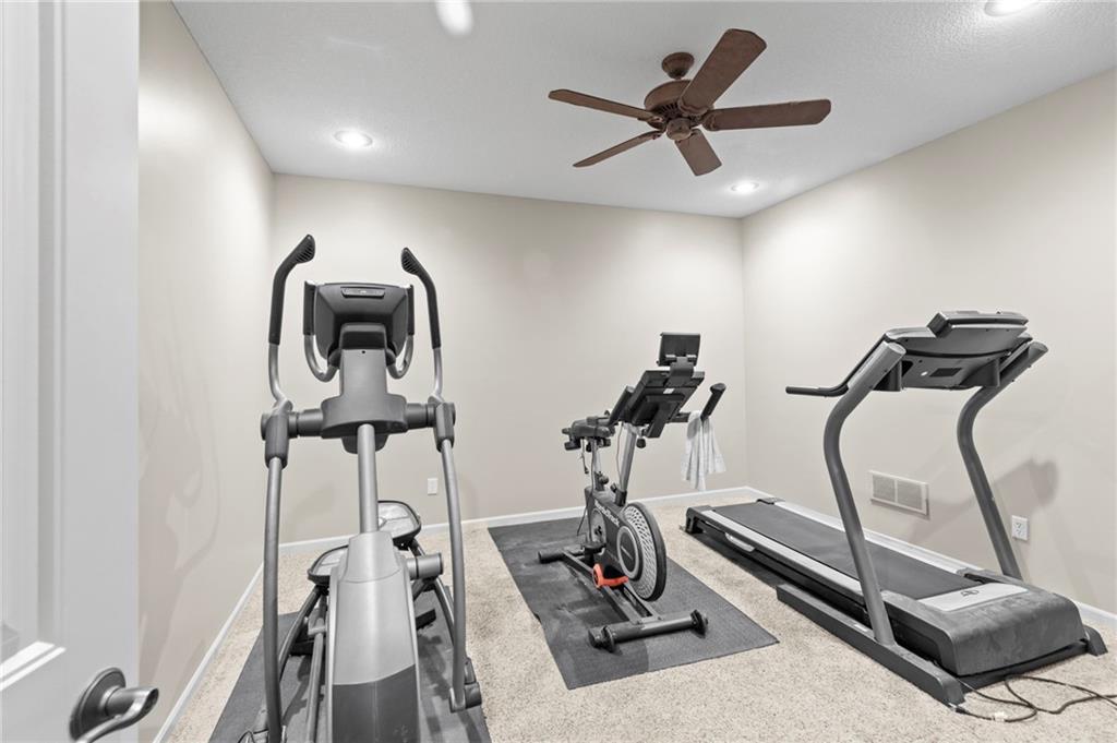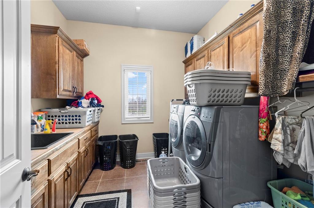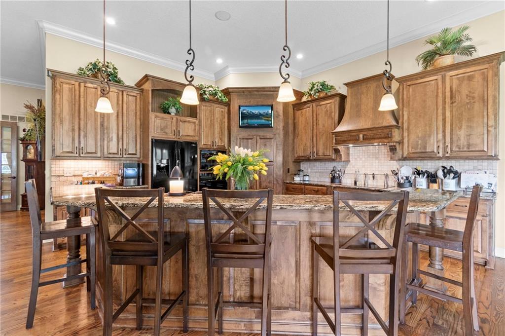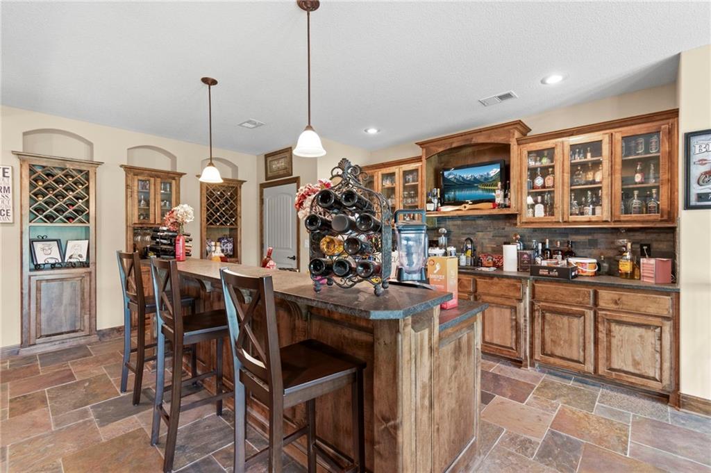 Set on nearly five acres just outside of town, this Kearney estate checks every box and then some. Inside, the main living space opens up with a layout that feels both spacious and connected. The living room, dining area, and kitchen flow together, anchored by hardwoods, tall ceilings, and natural light. A fireplace with custom built-ins adds a focal point without taking away from the scale. The kitchen is designed for real use. Granite counters, custom cabinetry, double wall ovens, and an oversized island make it easy to prep and gather. A walk-in pantry keeps everything within reach but out of sight, with space to sit and stay awhile nearby. The main level offers a flexible front room for a bedroom or office, plus two bedrooms connected by a bath with separate vanity areas. The primary suite is set apart with a large walk-in closet and a bathroom that feels like a retreat, complete with soaking tub, tiled shower with dual heads, and double vanity. Laundry with folding space and a half bath are also on this level. Downstairs, the finished lower level is built to host. A full wet bar with a large island opens to a second living area with its own fireplace. You’ll also find a half bath, flex room for a workout space or office, and a fifth bedroom with a private bath, ideal for guests or multi-generational living. Storage is extensive, with a suspended slab design offering approximately 55 by 31 of storage space, plus an additional 21 by 11 area. The six-car attached garage provides plenty of room, and the detached 60 by 49 shop takes it further with its own office, bathroom, car wash, and paint bay, plus an unfinished upper level for future use or storage. Built with intention, this home features structural beams for wide open spaces, twelve foot ceilings on both levels, and geothermal heating for long-term efficiency. Located in the Kearney School District, it offers a balance of space, function, and finish that’s hard to replicate.
