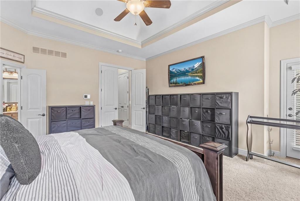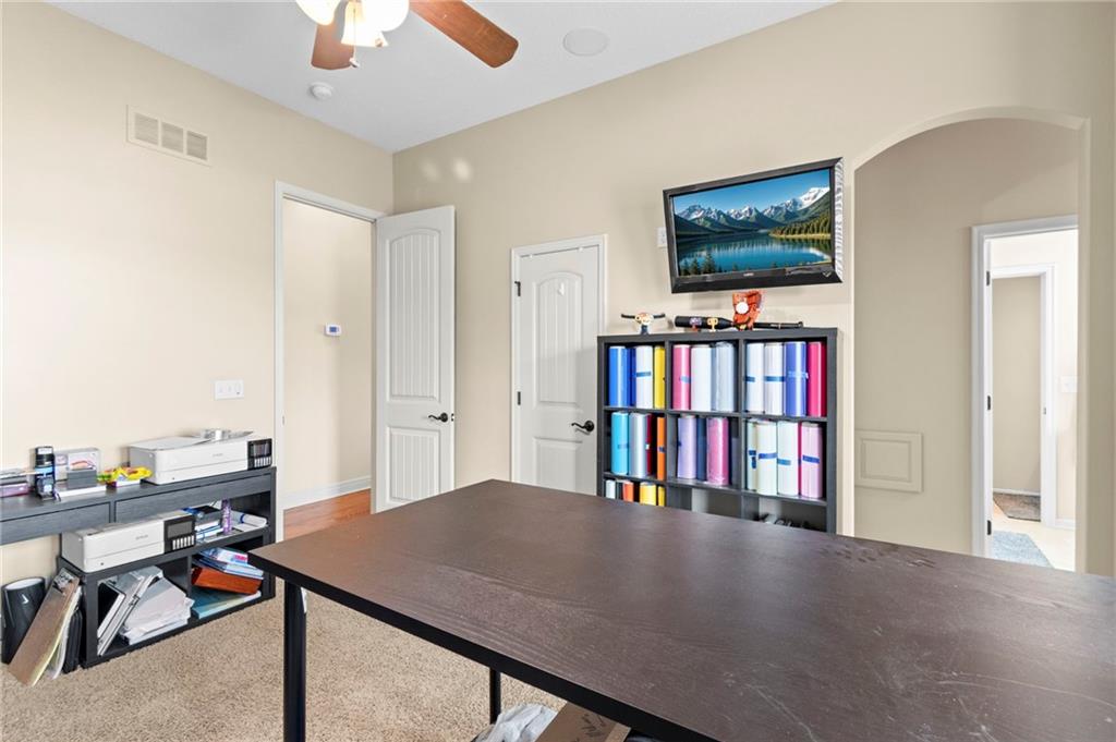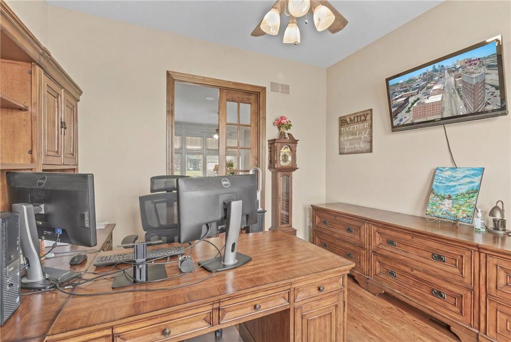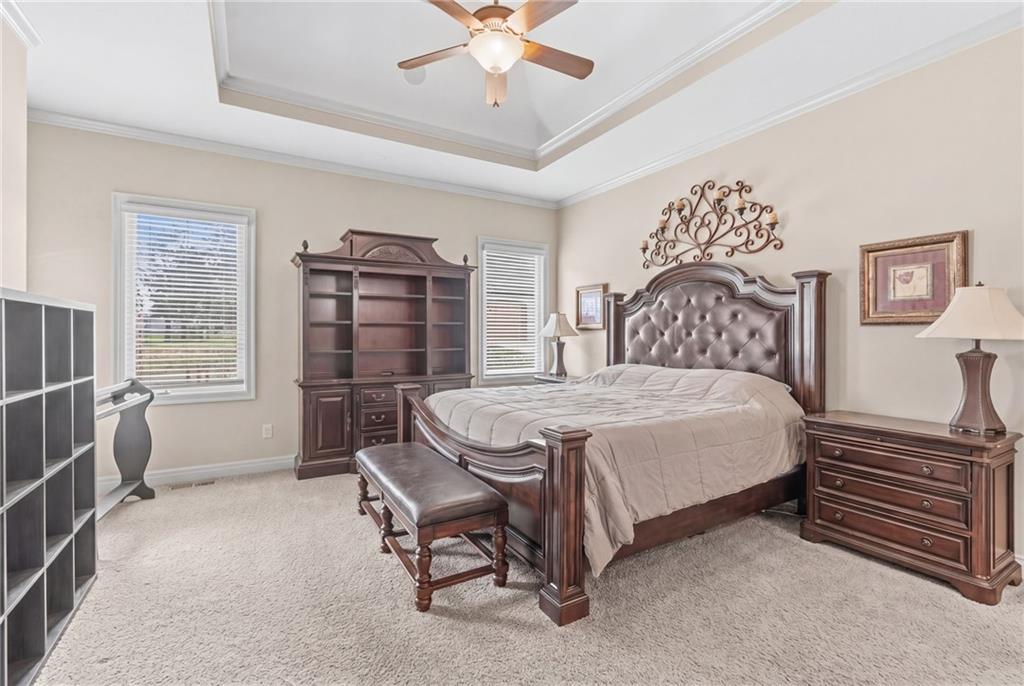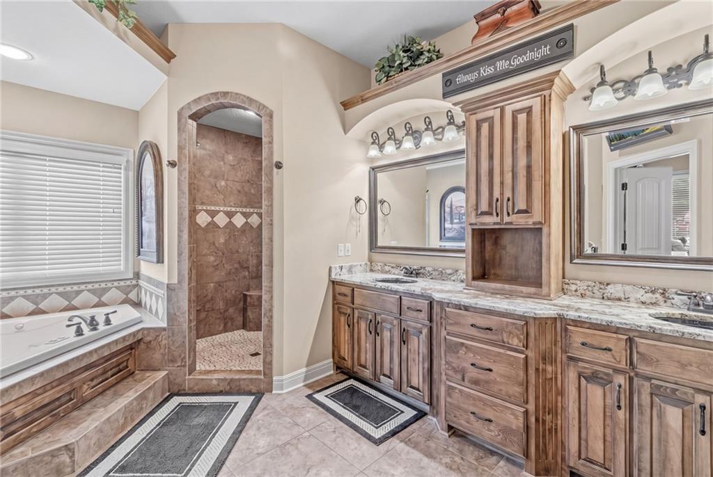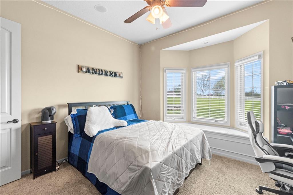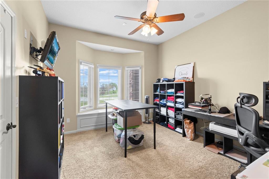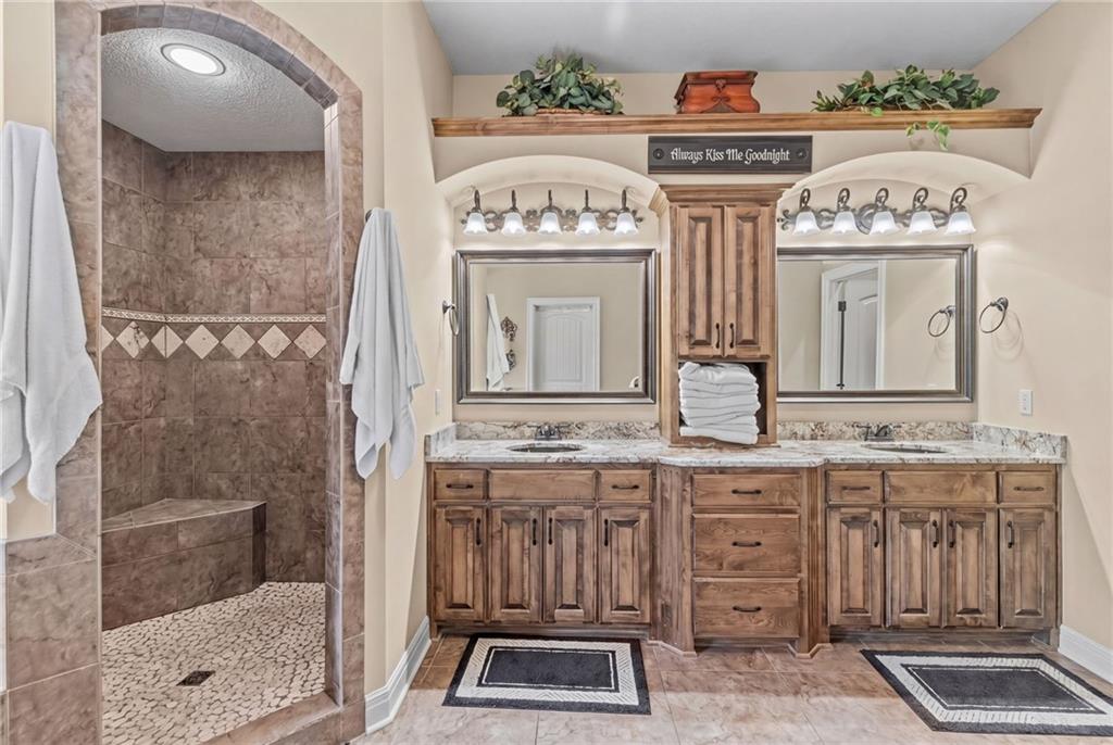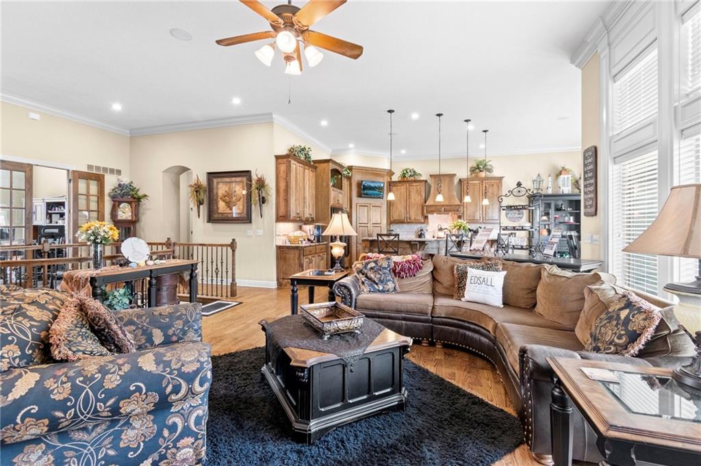 Set on nearly five acres just outside of town, this Kearney estate checks every box and then some. Inside, the main living space opens up with a layout that feels both spacious and connected. The living room, dining area, and kitchen flow together, anchored by hardwoods, tall ceilings, and natural light. A fireplace with custom built-ins adds a focal point without taking away from the scale. The kitchen is designed for real use. Granite counters, custom cabinetry, double wall ovens, and an oversized island make it easy to prep and gather. A walk-in pantry keeps everything within reach but out of sight, with space to sit and stay awhile nearby. The main level offers a flexible front room for a bedroom or office, plus two bedrooms connected by a bath with separate vanity areas. The primary suite is set apart with a large walk-in closet and a bathroom that feels like a retreat, complete with soaking tub, tiled shower with dual heads, and double vanity. Laundry with folding space and a half bath are also on this level. Downstairs, the finished lower level is built to host. A full wet bar with a large island opens to a second living area with its own fireplace. You’ll also find a half bath, flex room for a workout space or office, and a fifth bedroom with a private bath, ideal for guests or multi-generational living. Storage is extensive, with a suspended slab design offering approximately 55 by 31 of storage space, plus an additional 21 by 11 area. The six-car attached garage provides plenty of room, and the detached 60 by 49 shop takes it further with its own office, bathroom, car wash, and paint bay, plus an unfinished upper level for future use or storage. Built with intention, this home features structural beams for wide open spaces, twelve foot ceilings on both levels, and geothermal heating for long-term efficiency. Located in the Kearney School District, it offers a balance of space, function, and finish that’s hard to replicate.