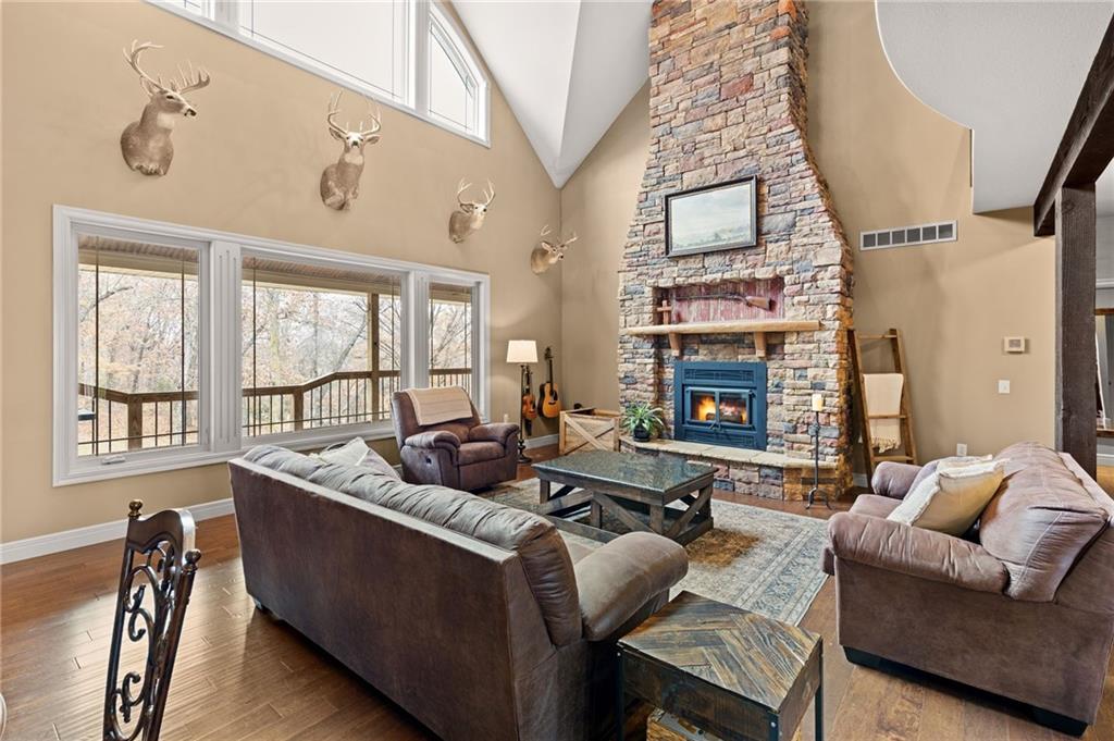 PRIVATE RESIDENCE OF A FOURTH GENERATION HOME BUILDER on 4 picturesque acres! One of a kind custom home offers over 6,200 finished square feet, 5 Bedroom, 4 1/2 bathroom + non-confirming 6th bedroom (7,000 SF total when including gym & basement workshop). LOCATED 6.5 miles north of Warrensburg and 13 miles south of I-70, making the Kansas City commute a breeze. The easement driveway leads past the 1st pond w/ swim dock, up to the residence w/ a stamped & stained concrete covered porch that offers some of the most breathtaking sunrises imaginable. FIBER INTERNET is available at this property. The 2,650 SF main floor features hardwood floors throughout, floor to ceiling stone wood burning fireplace in the living room. The custom chefs kitchen w/ 3 ovens, commercial grade appliances & a large kitchen island for gathering. The hearth room offers a gas fireplace and an abundance of natural light. The primary bedroom suite includes an electric fireplace, double closet, double vanity, built-in furniture, large tile shower & a private laundry room. Upstairs, 3 large bedrooms, 2 full bathrooms, laundry & a bonus non-conforming (6th) bedroom / play room. The finished walkout basement includes a large family room w/ electric fireplace, a custom dog kennel w/ dog door to the outside, fitness gym, 5th bedroom, full bathroom, and workshop / storage. Upgraded features include 2x6 construction, two geothermal heat-pumps for efficiency, two rear decks (one covered that runs entire length of home). A newly constructed 44' x 64' shop w/ 240V electric, two garage doors, concrete floor & bi-fold hanger style door for all of the toys & equipment. This custom home is one you don't want to miss. Too many features to list! Call today to schedule a showing! Home can be purchased with 22.54 total acres and can be referenced at MLS listing 2589070.
