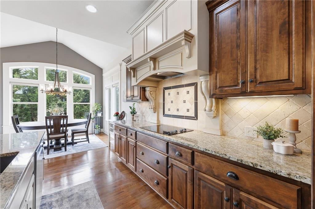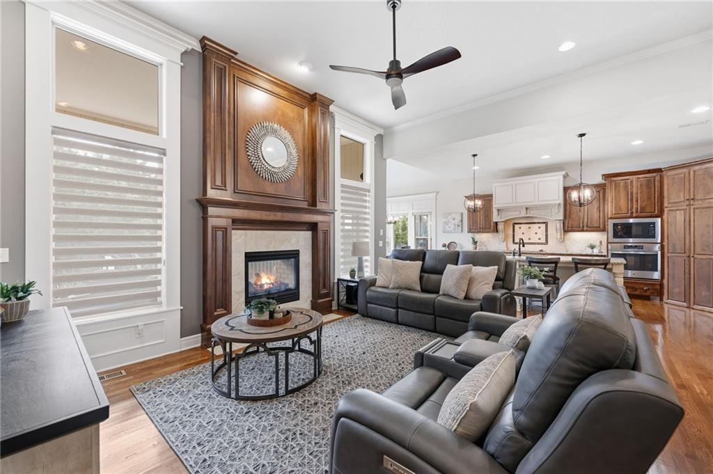 Welcome to this stunning former model home by James Engle Homes, showcasing the highly sought-after Emery reverse floor plan and loaded with gorgeous upgrades throughout. This beautifully designed 4-bedroom home offers the perfect blend of luxury and functionality. The main level features a spacious, light-filled great room with rich wood flooring and a striking see-through stone fireplace that extends to the covered, maintenance-free deck—creating a warm and inviting atmosphere both indoors and out. The gourmet kitchen is equally impressive, complete with granite countertops, double ovens, and a generous walk-in pantry, making it perfect for everyday living and entertaining. The luxurious primary suite offers a private retreat with dual vanities and a custom-tiled walk-in shower. The finished walkout/walkup lower level expands your living space with a large rec room, wet bar, two additional bedrooms, and a full bath—ideal for guests or entertaining. Step outside to enjoy exceptional outdoor living, including the covered deck with fireplace access and a beautifully designed stone patio with a fire pit, all backing to a serene tree line for added privacy. Additional highlights include a newer roof (just 2 years old) and access to fantastic neighborhood amenities, including a community pool. This home truly offers comfort, style, and convenience—don’t miss your opportunity to make it yours!