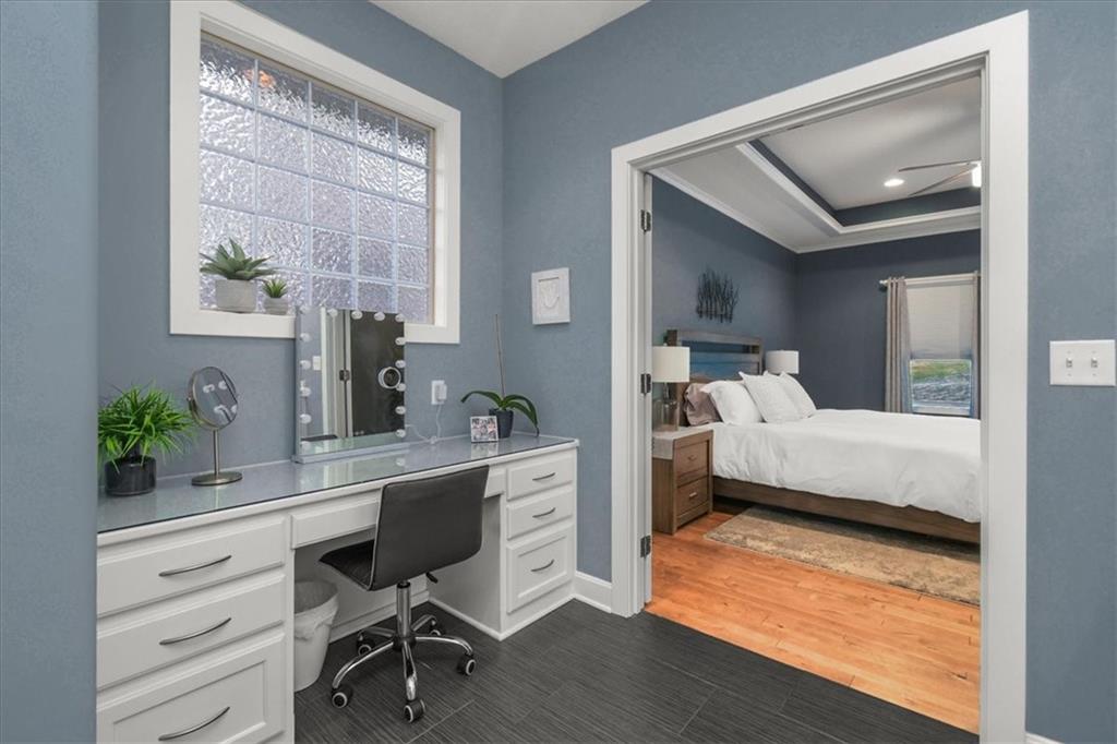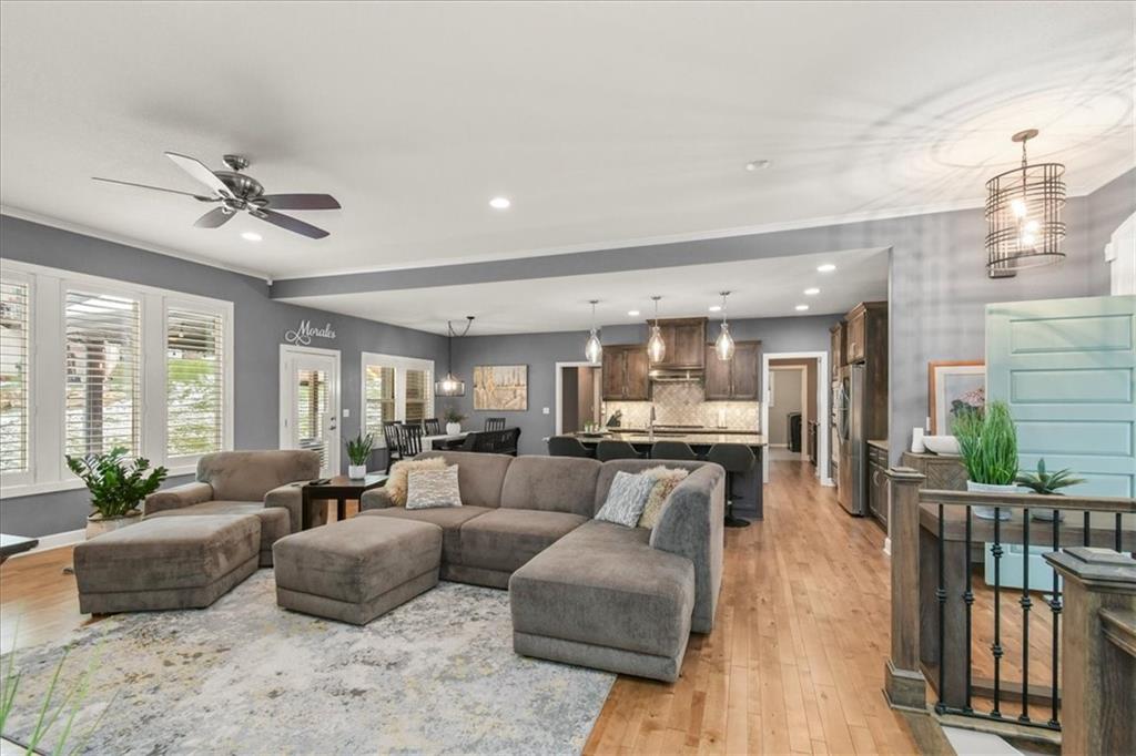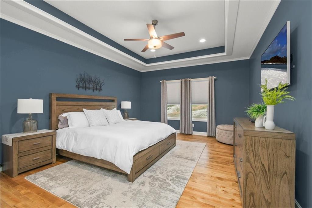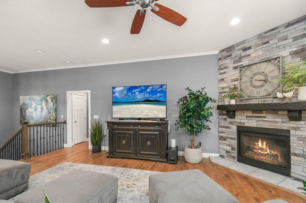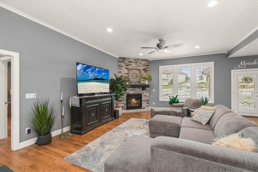 Prepare to be absolutely wowed by this ranch-style architectural masterpiece, a turnkey property where contemporary design meets luxurious, comfortable living. The home immediately impresses with its stunning façade of textured stucco and stacked stone accents, setting a sophisticated tone from the curb. Step inside onto gleaming hardwood floors that guide you through the expansive, open-concept design, flooded with natural light from oversized windows, most accented with custom plantation shutters. The heart of the home is the gourmet kitchen, a true chef's dream, showcasing rich, dark wood cabinetry equipped with soft close cabinets throughout, sleek granite countertops, and a show-stopping dark gray center island with seating—perfect for hosting and entertaining. Transition from the kitchen to the bright dining area and the spacious living room, anchored by a magnificent corner stone fireplace for cozy evenings. Retreat to the main floor private sanctuary in the primary suite, an oasis of calm with a stylish blue accent wall and an elegant tray ceiling that adds grandeur. The spa-like en-suite boasts a sleek double vanity with crisp white cabinetry, a glass-enclosed walk-in shower, and leads into a custom walk-in closet with ample built-in organization. Adding to the home's impressive functionality is a main-floor laundry room with gorgeous dark wood cabinetry, offering maximum convenience, complemented by a central vacuum system. For outdoor enjoyment, step onto the covered back patio, ideal for al-fresco dining or relaxing with a ceiling fan overhead. Below, the vast, unfinished basement presents a phenomenal opportunity to customize and expand—a blank canvas for adding a future home gym, theater, or additional living space to create your ultimate dream home. This is more than a home; it's an uncompromising quality lifestyle awaiting its new owner in a coveted community with excellent highway access for a convenient commute.