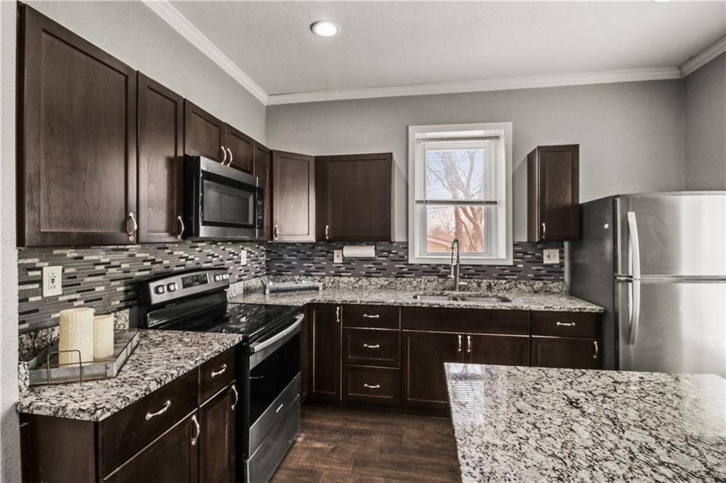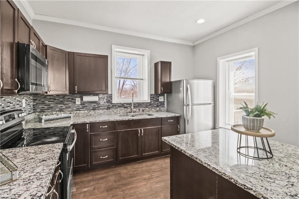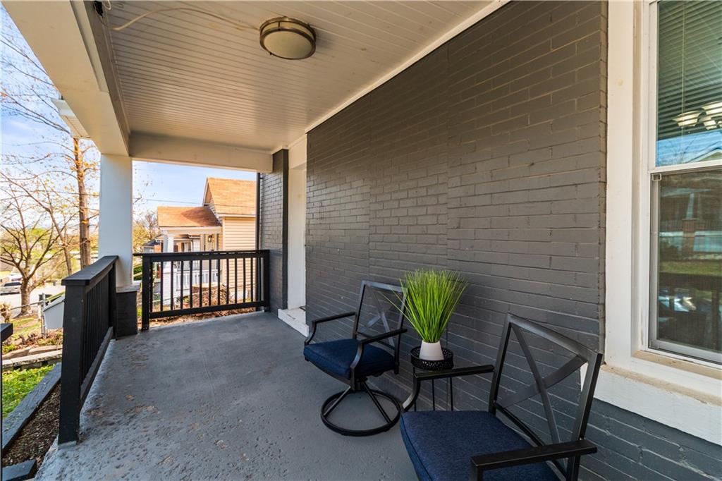 Welcome home to this charming 1920's home, centrally located gem just 10 minutes from downtown Kansas City—perfectly situated within walking distance to the shops and restaurants of Strawberry Hill. Start your day on the spacious front deck—perfect for morning coffee or unwinding in the evening. Step inside to a warm and welcoming living room featuring durable LVP flooring, flowing seamlessly into the formal dining area and open kitchen. Here, you’ll find granite countertops, a center island, ample cabinet space, and all appliances included—making it as functional as it is inviting. Out back, a second deck creates the perfect setting for relaxing evenings or entertaining guests. The main level offers flexibility with a bedroom that can also serve as a home office, along with a full bathroom for added convenience. Upstairs, you’ll find three additional bedrooms, including a comfortable primary suite with dual vanities, a stand-up shower, and your own private balcony—your own quiet escape at the end of the day. A laundry closet is conveniently located just off the hallway. The home continues to impress with neutral finishes throughout, a newer HVAC system (approximately 5 years old), and a walkout basement offering plenty of storage space. A carport located just behind the home adds extra convenience.