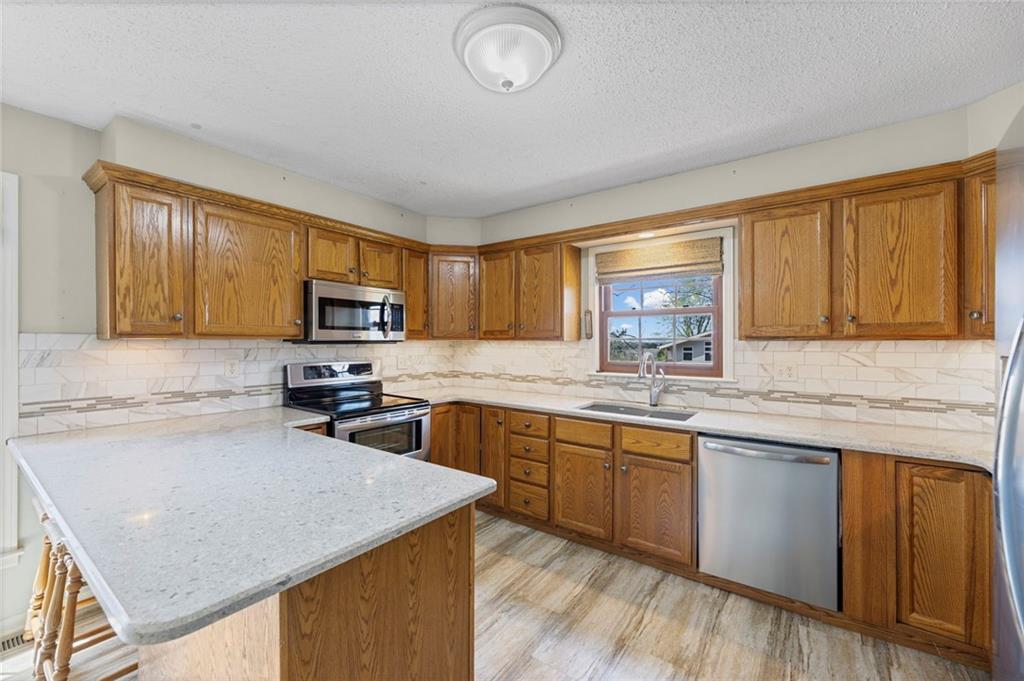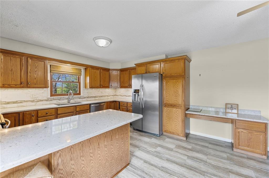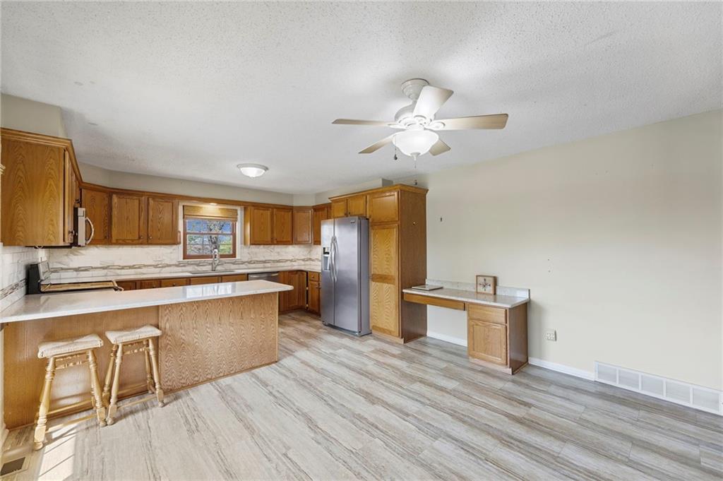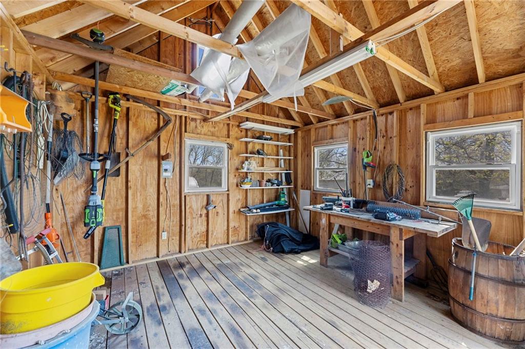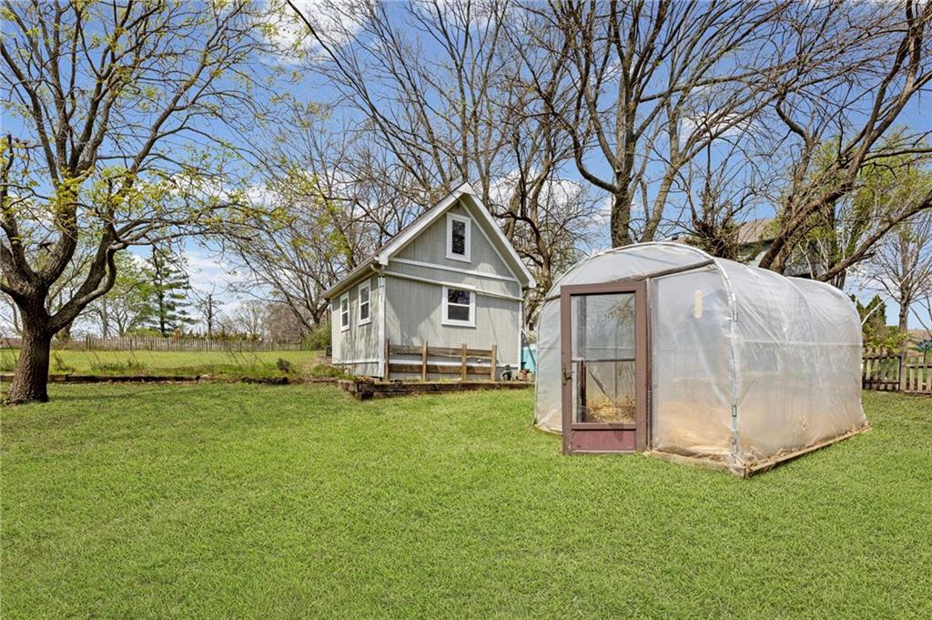 Rare find close to town on a paved road, raised Ranch/Split Entry on ~2 Acres with 75'x42' Morton Building with 14' sidewalls, 12'x12' Sliders on N&S Ends, 9'9"x10'tall garage door on W side, concrete floor, natural gas furnace, electric and water. House fireplaces and Shop furnace are on a natural gas well (shared). Plus the house has solar panels on roof for minimal electric bill! Spend your Spring & Summer planting and tending your vegetable or flower garden in backyard that includes a potting shed & small greenhouse for starting plants. The kitchen area features quartz counters, Blanco undermount sink & updated backsplash, SS smooth top double oven range, dishwasher and refrigerator, ample stained cabinetry with lazy Susan's in lower corners, pantry cabinet and a peninsula island. Kitchen is open to a large dining area to keep the cook connected while entertaining. A large main level family room offers pegged hardwoods floors, vaulted ceiling and brick gas fireplace & hearth with a door to the deck overlooking the backyard. The primary bedroom has a full bath with shower, stool and single vanity, there's a pocket door in the closet that can turn bedroom 2 into a office/workout/sitting area off the primary. A hall bath provides a long vanity top with single vanity (could update to double vanity) and a jacuzzi tub w shower above. Lower-level rec room has built in shelf unit, brick gas fireplace, daylight windows and a half bath. The laundry is in the utility room, just off the garage entry, garage features cabinetry and counter tops from original kitchen making for great storage/organizer/workbench. The exterior is vinyl sided for low maintenance along with thermal pane replacement windows. The solar panels are paid off and owned by the seller. The gas well is to the left of driveway entry gate on SE corner of neighbor to the West. This home has been loved by seller's family for 35 years and ready for you to complete updates and make it your own!
