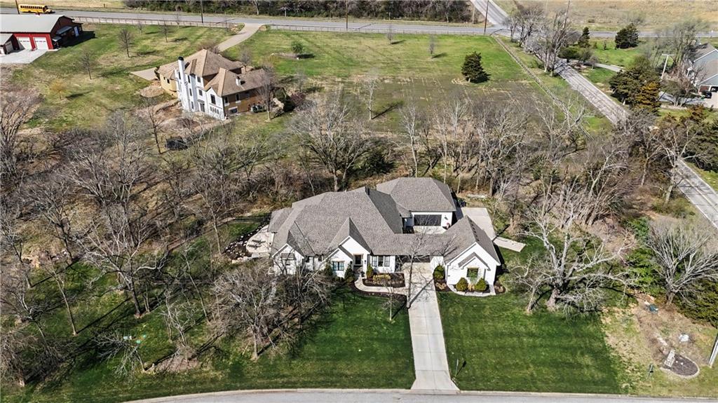 Luxury living in the sought-after **Blue Valley School District** — where location truly is everything. Builder's personal residence, situated on **2 scenic acres of beautifully treed, fenced property**. This stunning former spec home offers 4 spacious bedrooms and 4.5 baths in a beautifully designed ranch floor plan. The main level features a luxurious primary suite complete with separate his-and-hers bathrooms for the ultimate private retreat, plus a convenient laundry room located within the primary suite. Each additional bedroom includes its own en-suite bath, offering comfort and privacy for family and guests. The kitchen is a showstopper, showcasing a large statement island, gas cooktop, double sinks, premium Thermador appliances and an spacious butler's pantry — perfect for entertaining. A second laundry room is thoughtfully located in the mudroom just off the kitchen, adding everyday functionality. The home includes a 2-car attached garage plus a 2-car detached garage connected by a porte cochere. A secondary stairwell in the garage provides direct access to the expansive 3,500 sq ft unfinished daylight basement — ready for you to design and customize to your needs. The charming carriage house offers ideal space for a private office, guest quarters, or multi-generational living. Enjoy peaceful views of nature from the covered patio just off the living room. All this, just minutes from highways, shopping, and restaurants — a rare combination of luxury, space, and convenience.