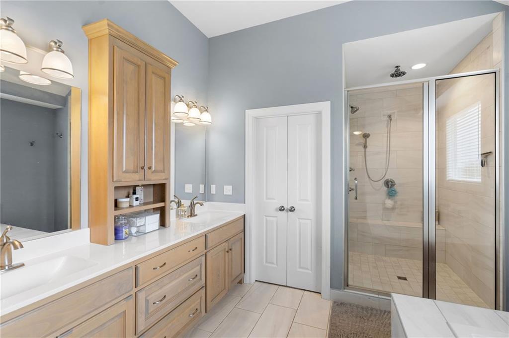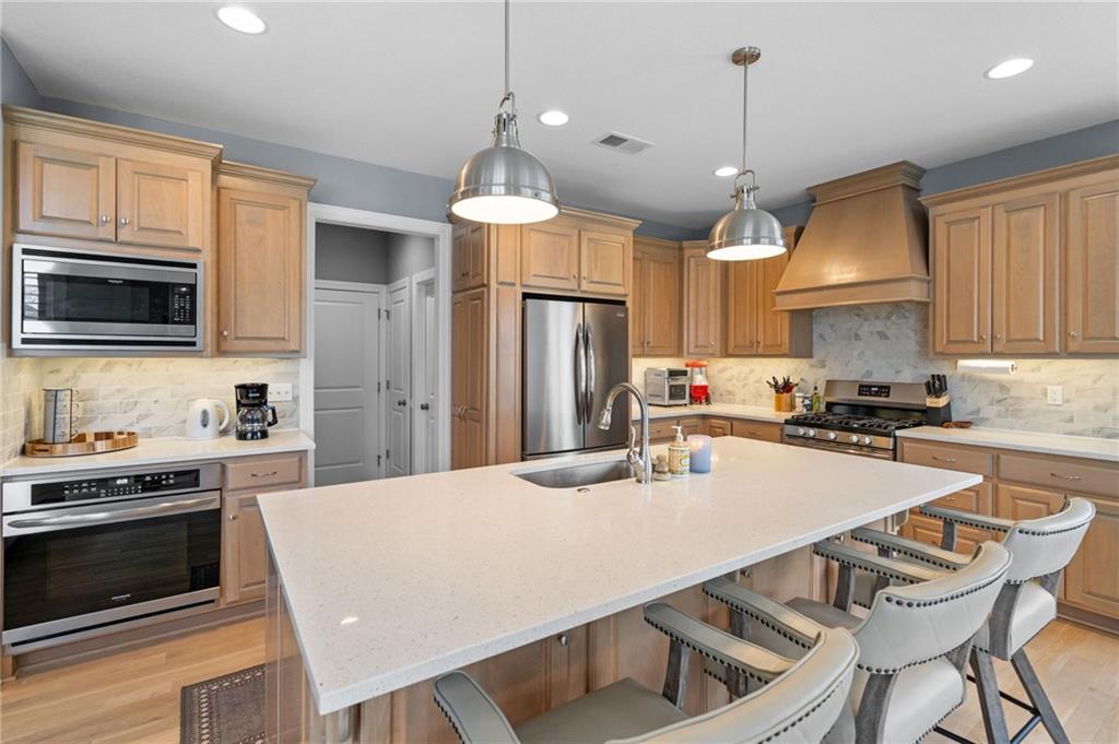 Stunning Ranch/Reverse home that features beautiful wood floors on the main level, open floor plan and kitchen with granite countertops, kitchen island, stainless appliances including a gas cook top that all remain with the home, white cabinets and pantry. Spacious primary suite that provides a wonderful walk in closet with lots of space, adjoining bathroom that features a double vanity, multi-headed shower and tiled floors. Finished basement with large rec room with wet bar and two additional bedrooms. Enjoy your fenced in backyard with a large patio space that is great for entertaining and includes a fire pit. Hurry this one will not last long!!!