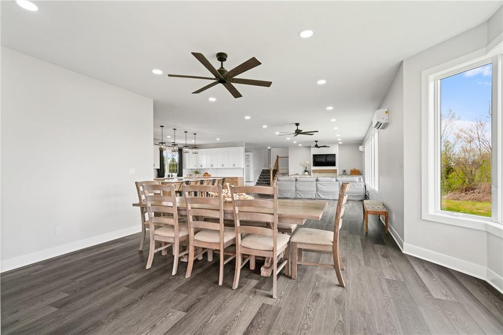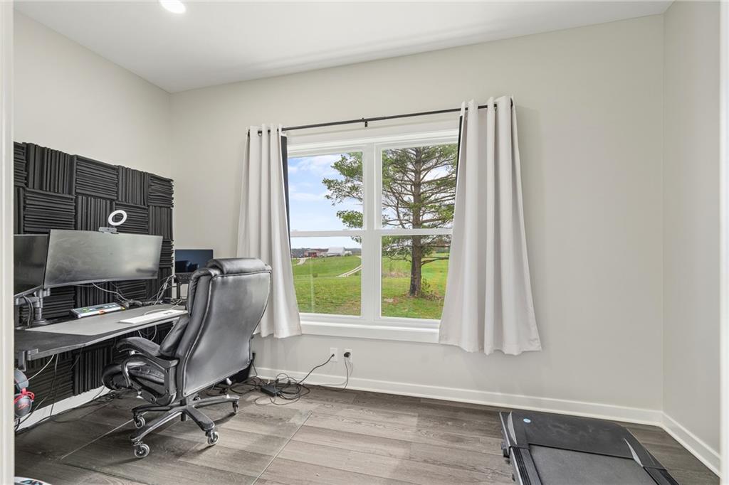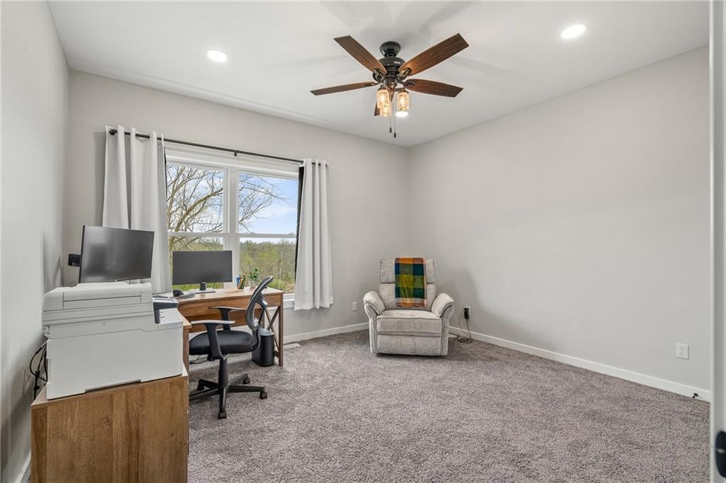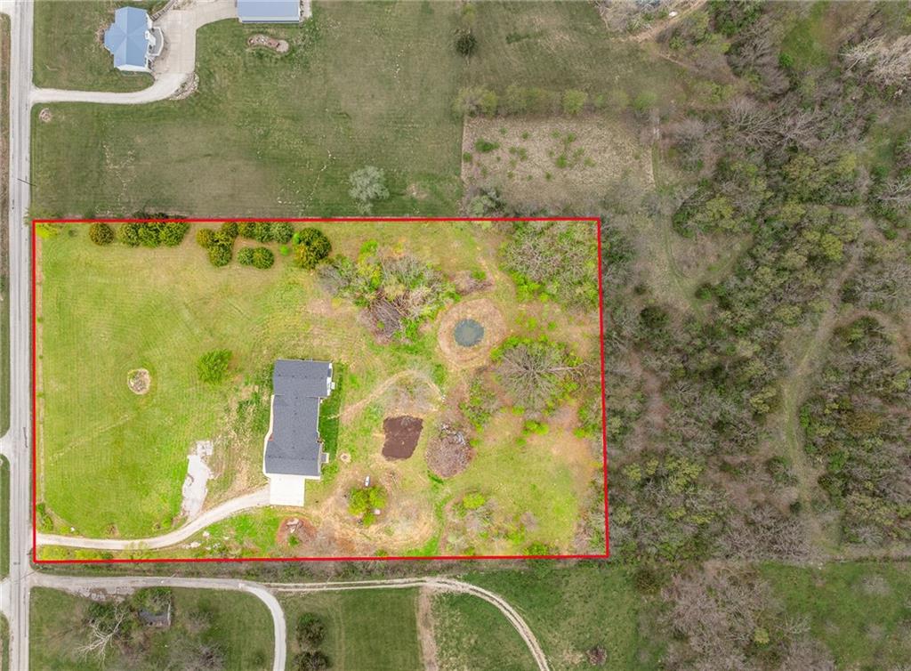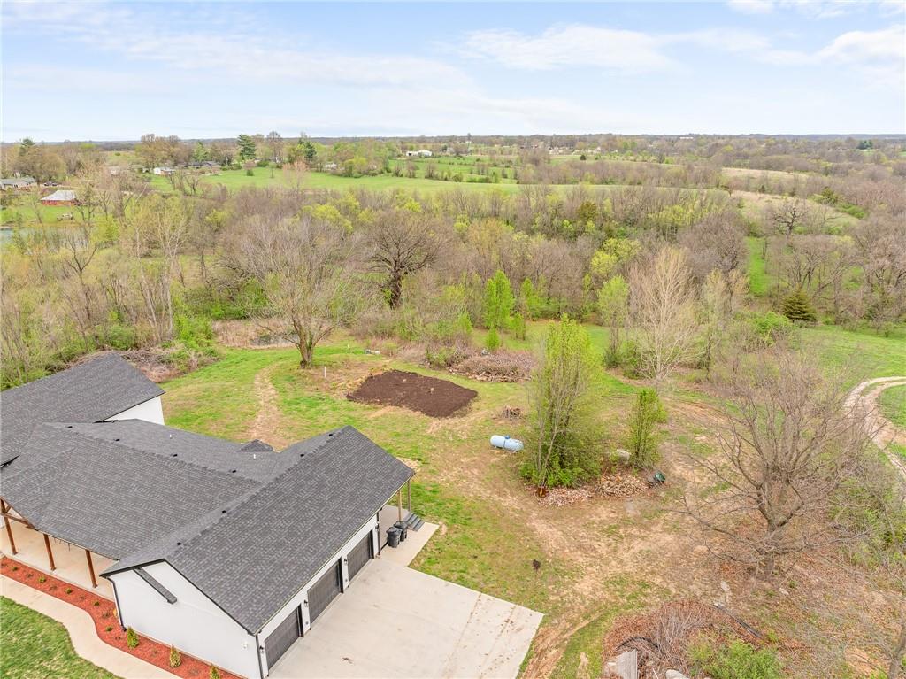 Start your mornings on the expansive 48-foot covered front porch, coffee in hand, as the quiet of the countryside and sweeping views ease you into the day. Set on 4.84± acres, featuring a beautiful newer home, this property offers a rare sense of space and privacy—perfect for those craving a slower pace without giving up convenience. Inside, thoughtful design meets everyday luxury. The open-concept floor plan is both inviting and functional, centered around a gourmet kitchen featuring custom white oak cabinetry, quartz countertops, double ovens, a Butler’s pantry, appliance lift, and an impressive 10-foot island—perfect for gathering. The adjoining family room is filled with natural light and anchored by a cozy gas fireplace. Upstairs, you’ll find generously sized bedrooms, including a serene primary suite retreat with a spa-inspired bath showcasing a 10-foot dual-head shower. Tucked beyond the expansive primary closet is a hidden office or flex space—ideal for working from home or a private escape. The finished walkout lower level offers even more room to live and entertain with 9-foot ceilings, two additional bedrooms, a full bath, and a large rec room. A substantial 8-foot concrete storm shelter provides peace of mind, while abundant storage keeps everything organized-1,600 square feet of unfinished endless potential. Car enthusiasts and pet lovers alike will appreciate the extended three-car garage with built-in dog wash. Out back, the elevated deck overlooks your acreage, with a concrete pad below already in place for a future hot tub—just imagine the evenings. With fiber internet, wide-open space, and endless possibilities, this property delivers the best of both worlds: modern comfort and the freedom of country living. Located 30 minutes to the Kansas City International airport and 35-40 minutes to downtown Kansas City. A rare opportunity to own acreage without compromise—offering endless potential to make it truly your own.