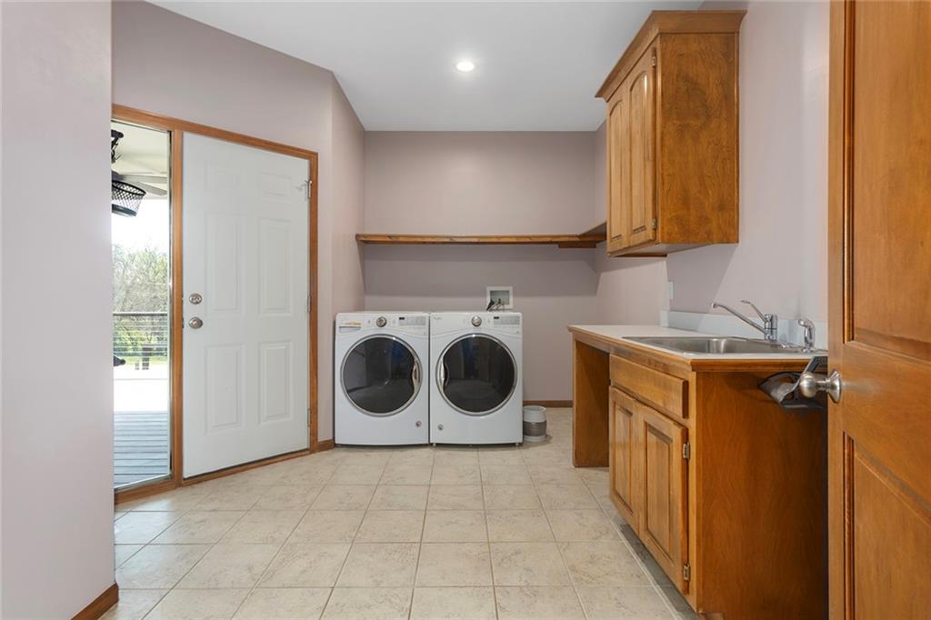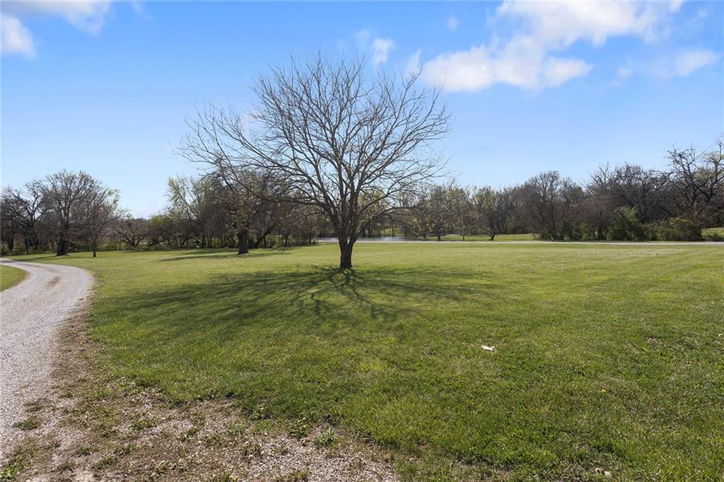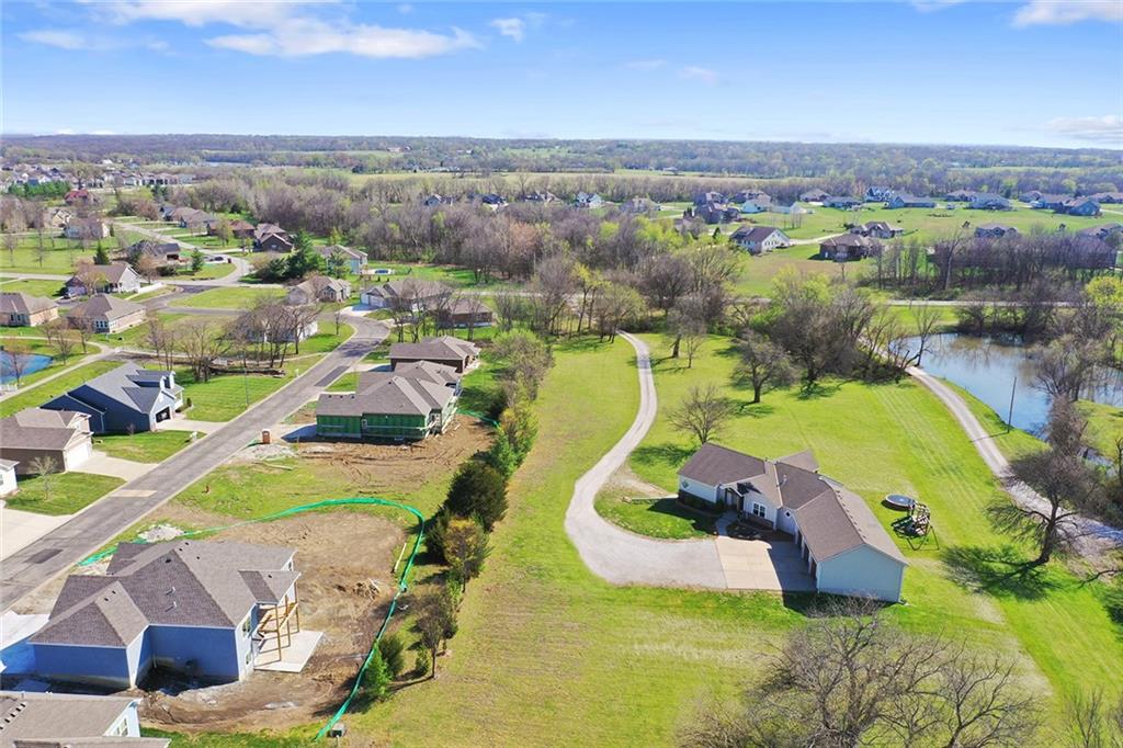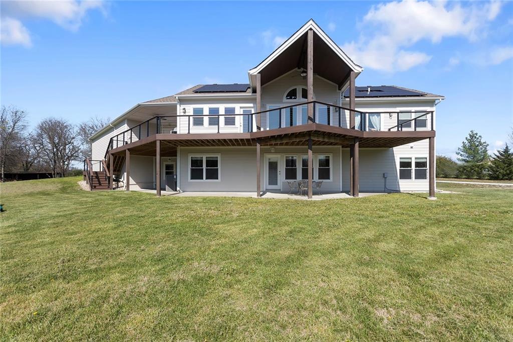 RARE 4-ACRE RETREAT JUST MINUTES FROM KANSAS CITY! Discover the perfect balance of privacy, space, and convenience with this exceptional reverse 1.5-story home tucked away in a picturesque, tree-lined setting. Offering nearly 4 acres of serene landscape, this property delivers a true country-living experience without sacrificing access to top-rated schools, shopping, and city amenities. Designed for both comfort and functionality, this home showcases vaulted ceilings, expansive living spaces, and an abundance of natural light. The main level provides effortless living, while the walkout lower level expands your options with a private 4th bedroom featuring its own exterior entrance—ideal for guests, multi-generational living, or a private office suite. Outdoor living shines with a wraparound deck, perfect for entertaining or simply enjoying the peaceful surroundings under a canopy of mature trees. Car collectors, hobbyists, or those needing extra space will love the oversized 3-car garage with extended bays and doors, plus a rare 4th garage on the lower level—offering unmatched flexibility. Thoughtfully updated throughout, with major improvements in the past 2–3 years including new hardwood floors, custom plank tile, updated lighting and fans, exterior stone accents, upgraded stair finishes, deck enhancements, and a fully finished lower level. Additional updates in progress add even more value. Don't forget the advantage of low energy bills due to the energy efficient living with Solar Panels. **Please note Solar Panels are paid for and there is no financial burden transferred to the buyer, just the savings. Opportunities like this—with acreage, upgrades, and location—are few and far between. This is the one buyers have been waiting for.