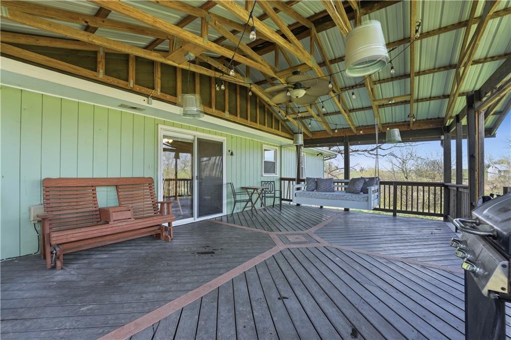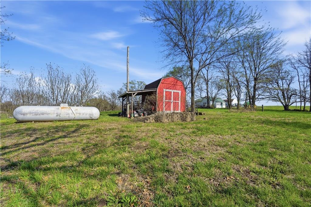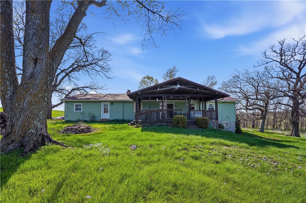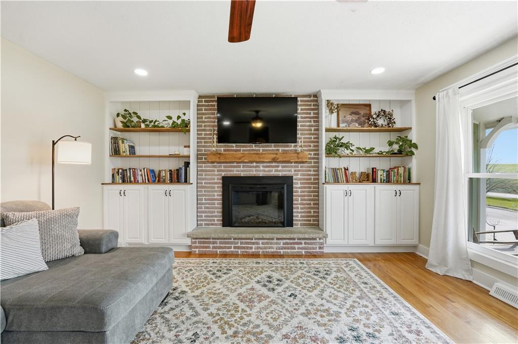 Welcome to this beautifully updated home in the Burns Addition subdivision of Edgerton, Missouri. From the moment you walk in, you’ll love the warm hardwood floors, stunning brick fireplace and custom built-ins that create a cozy and inviting living space. A wall of windows fills the home with natural light, making every room feel bright and open. The updated kitchen offers an abundance of cabinet and counter space, featuring Corian countertops, a gas cooktop with stainless steel hood vent, tile flooring, and a built-in pantry—perfect for everyday living and entertaining. Just off the kitchen, step out to the expansive covered deck overlooking a large, private lot with mature fruit trees, creating a peaceful outdoor retreat you’ll enjoy year-round. All three bedrooms are generously sized, and the primary bathroom has been fully updated with a fresh, modern feel. You’ll also appreciate the convenience of main-level laundry complete with built-in cabinets and a utility sink. The unfinished walkout lower level provides excellent storage or future finishing potential, and the attached two-car garage adds even more functionality. A small shed offers additional outdoor storage, and the serene setting provides privacy while still being conveniently located. This home truly combines comfort, space, and thoughtful updates—ready for you to move in and enjoy.