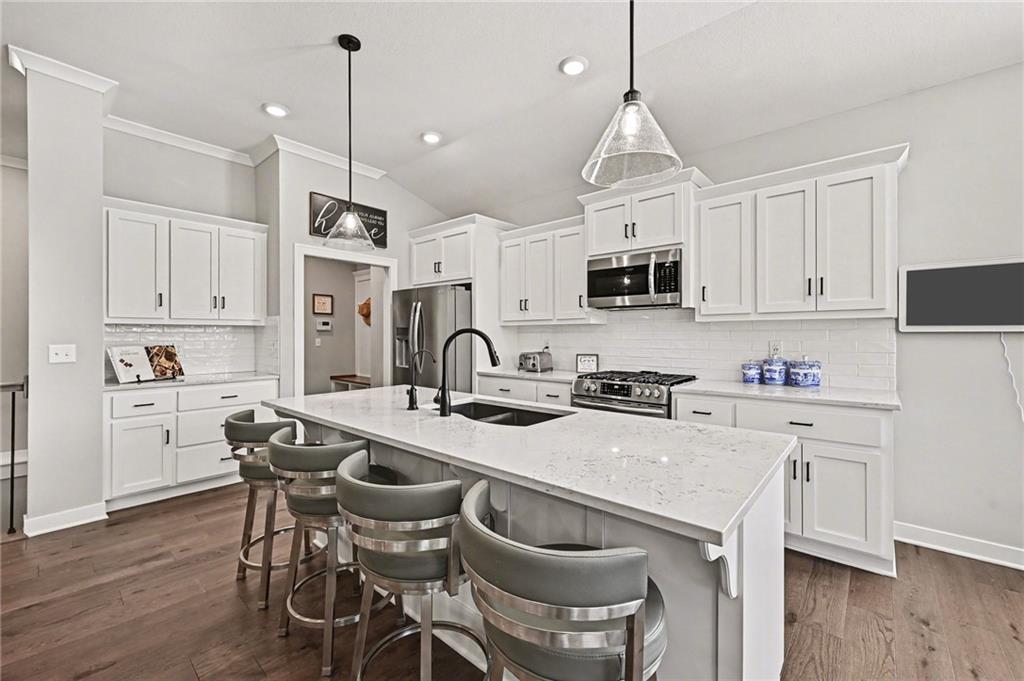 Located in a newer neighborhood that's still growing, this reverse ranch feels like a nearly new home. Built just four years ago by Summit Homes, it has a modern layout with finishes that are fresh, clean, and ready for you to move into. The home offers 4 bedrooms and 3 full bathrooms. The main level has approximately 1,544 sq. ft. of living space, and the basement adds another 988 sq. ft. of finished area. The open layout on the main floor makes it easy to flow from the kitchen to the dining area and living room. The kitchen has great finishes and a design that works well for both everyday meals and entertainment, plus there’s a mudroom and pantry near the three-car garage for extra convenience. The primary suite is on the main level for privacy and comfort, with a spacious bedroom, a well-designed bathroom, and direct access to a walk-in closet. A second bedroom and full bathroom near the front offer flexibility for guests or an office. Downstairs, the large family room is great for hanging out, with a wet bar that's great for hosting. Two more bedrooms share a Jack-and-Jill bathroom, and there’s unfinished space for extra storage. Egress windows bring in natural light and make the lower level feel bright and welcoming. Outside, you’ll find a covered concrete patio right off the dining area—perfect for quiet evenings or entertaining guests. The yard has an in-ground sprinkler system, and the home comes with a security system for peace of mind. With 2,532 sq. ft. of finished space, a three-car garage, and a location in a growing part of Blue Springs area, this home blends modern style, useful space, and everyday comfort—ideal for those who want something that feels new without the hassle of starting from scratch.