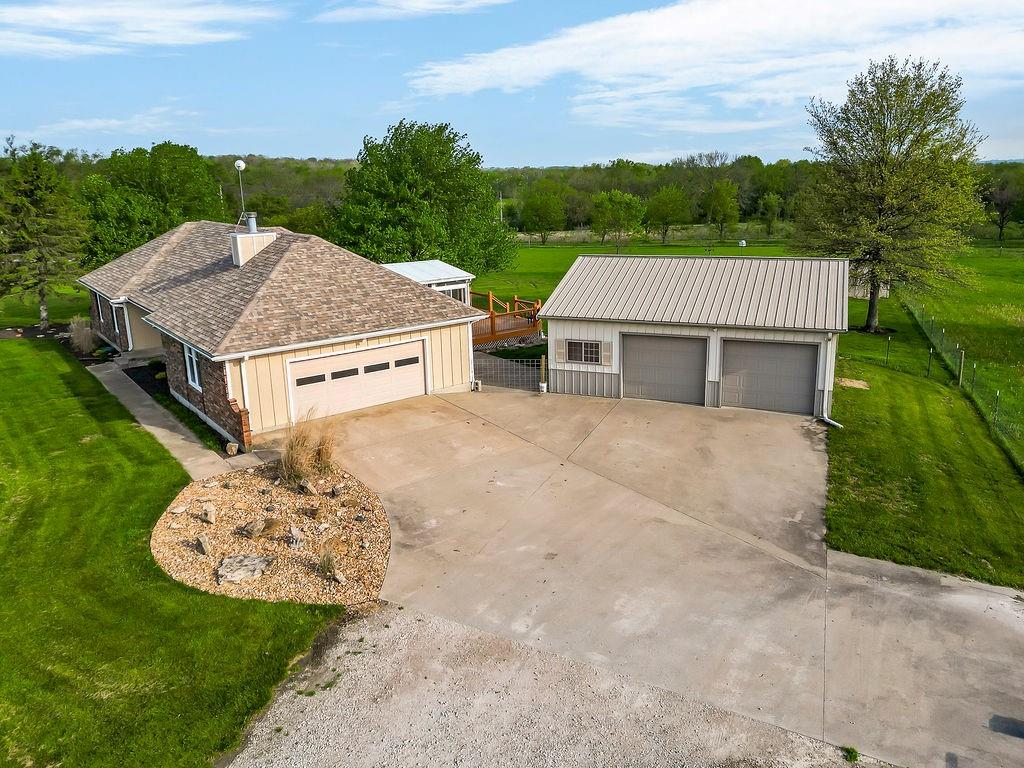 South on 169 Hwy to 255 Street Exit, west on 255th through Hillsdale and over Hillsdale Lake dam. Turn west on 271st, home is at the corner of 271st & Weaverly RD.