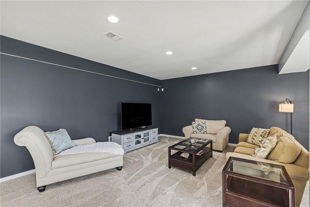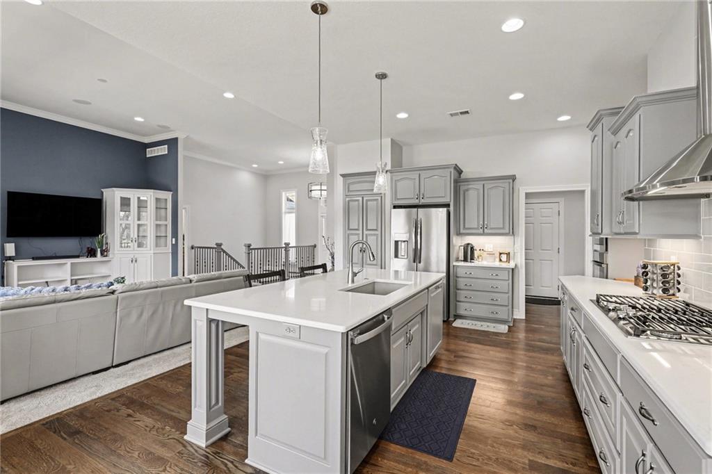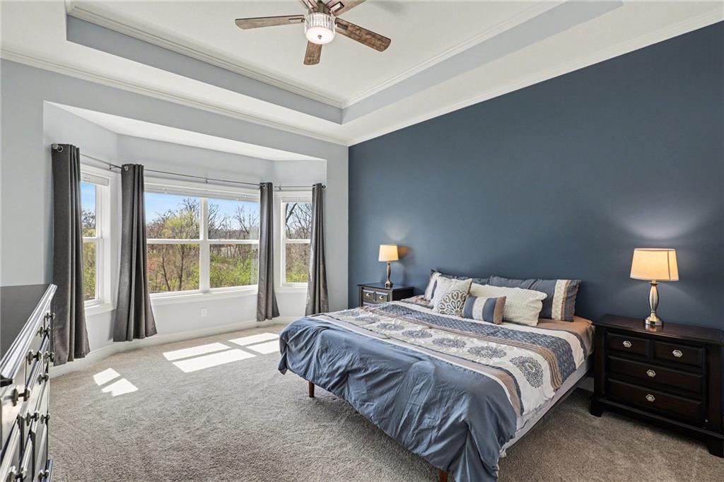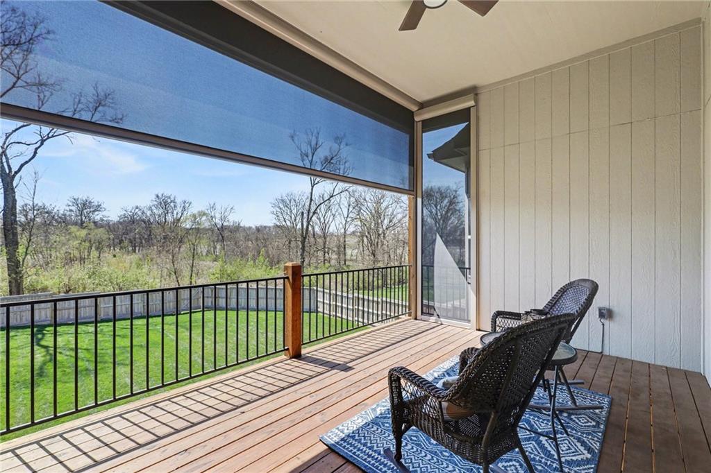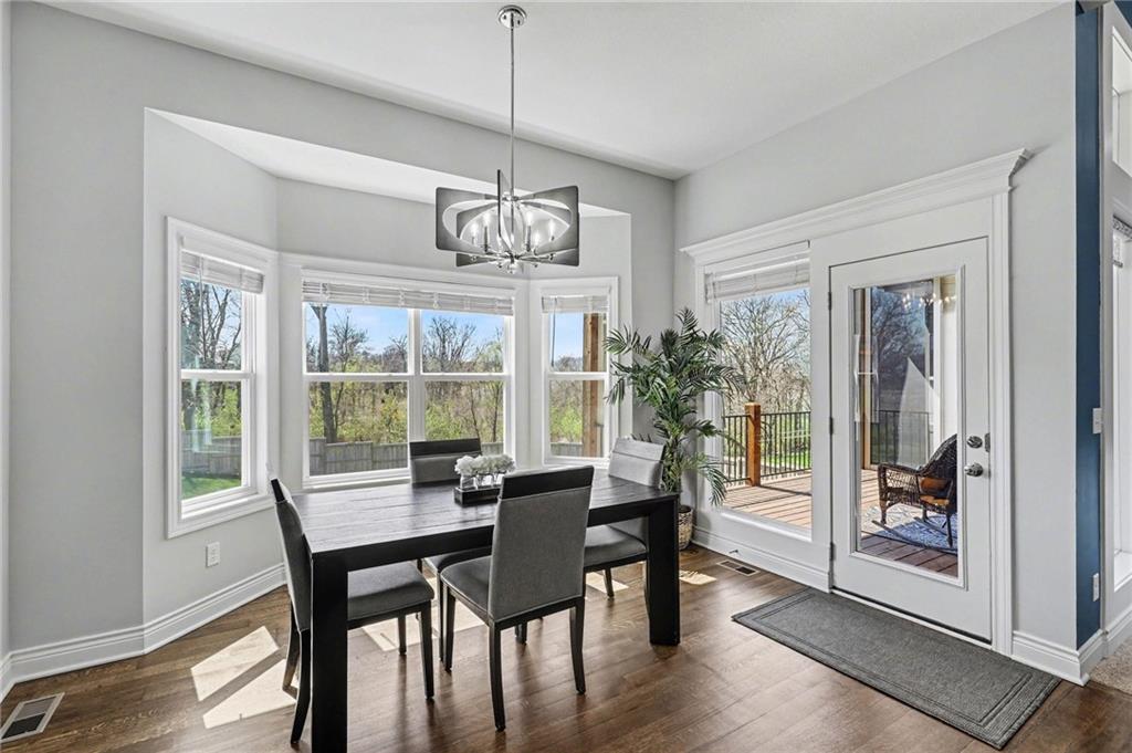 Step into refined elegance & thoughtfully designed living spaces! Nestled in a serene cul-de-sac, this beautifully designed home offers exceptional privacy with a peaceful backdrop of lush, undeveloped woodland. The open-concept main level is filled with natural light, highlighted by soaring ceilings, expansive windows, & rich hardwood flooring that flows seamlessly through the main living areas. A stunning great room anchors the space with a beautifully crafted fireplace, custom millwork, built-in cabinetry, & a dramatic wall of windows that frames the scenic views beyond. The chef-inspired kitchen is both stylish & functional, featuring an oversized island with seating, sleek countertops, custom cabinetry, S/S appliances, tile backsplash, & designer pendant lighting. The adjoining dining area sits in a bright, window-lined nook, creating an inviting space for everyday meals or entertaining. Just off the main living area, a covered deck provides the perfect setting to relax & enjoy the tranquil wooded surroundings. The thoughtfully designed main level includes both a spacious primary suite & a private guest suite, offering comfort & flexibility. Each space is enhanced by generous proportions, modern finishes, & abundant natural light. A convenient 3-car garage adds everyday practicality without sacrificing style. The walkout lower level expands the living space with 2 additional bedrooms, a third full bathroom, & an expansive recreational room ideal for entertaining, movie nights, or creating a game area. Large windows and direct outdoor access continue the bright, open feel while connecting seamlessly to the private backyard setting. Combining elegant finishes, a functional layout, and a peaceful cul-de-sac location, this home offers the perfect balance of luxury, comfort, and everyday livability. ***SPECIAL FEATURES:6-foot cedar, board-on-board privacy fence AND retractable solar shield screens to the deck & custom-made retractable blinds in the basement.***