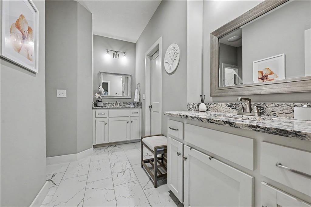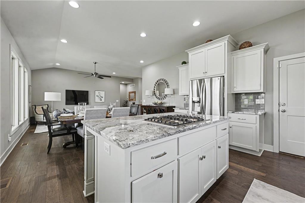 GORGEOUS reverse 1.5 story home on an amazing Cul De Sac in the heavily sought after Arbor Woods in Olathe with wonderful curb appeal! Beautiful gourmet kitchen with huge eat in granite island, with walk in pantry, hardwood floors, and stainless steel appliances. Lovely deck off conveniently located off kitchen - overlooking the beautiful treed view- great for grilling and entertaining! Spacious Master BR with ensuite with vaulted ceiling, carpet, shower, double vanities with granite tops, walk through closet, laundry and another bedroom/office all on main floor. Lower level has HUGE family room with wet bar, with third large bedroom with full bath, and large storage.