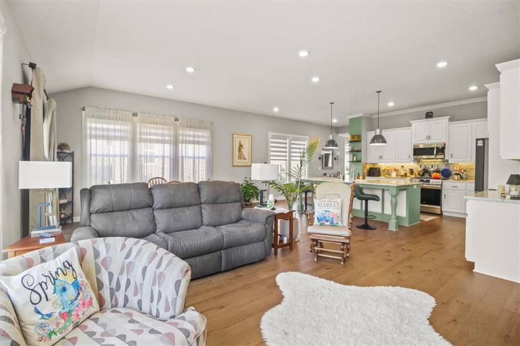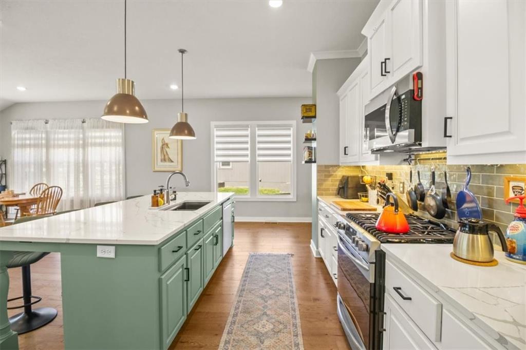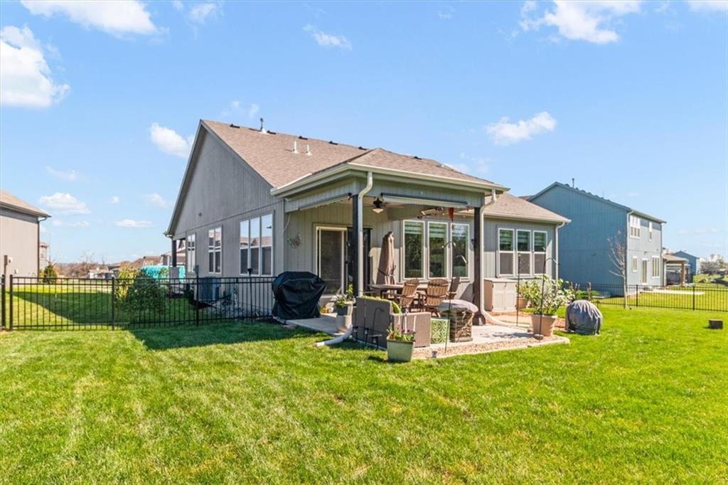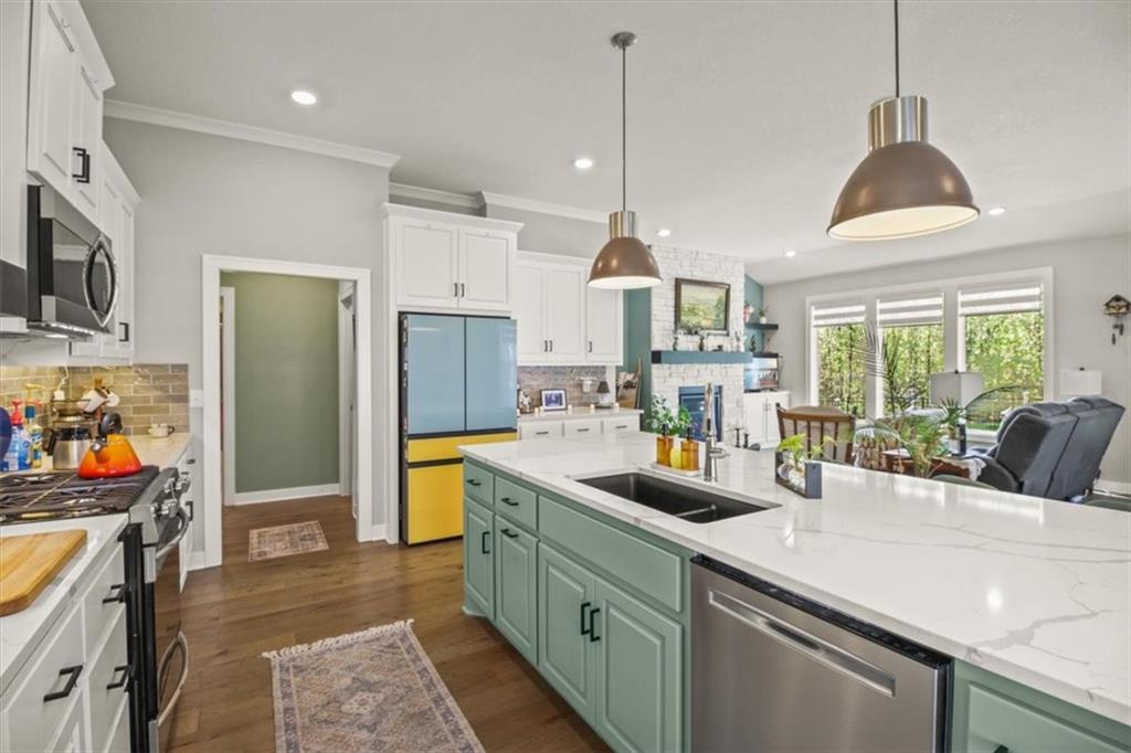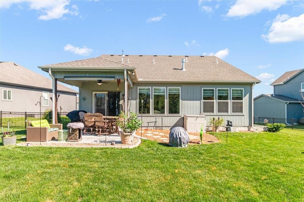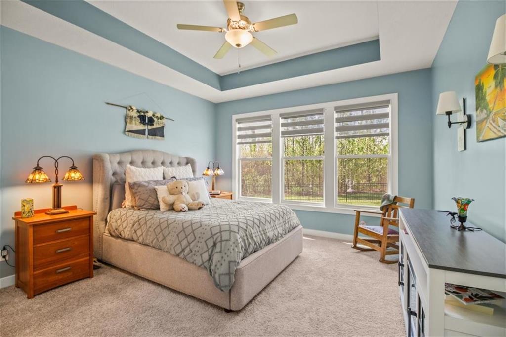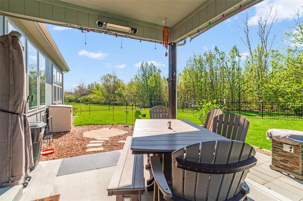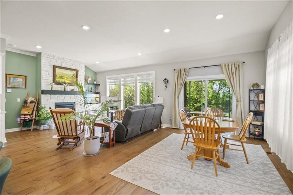 A stunning reverse 1.5-story home nestled on a private, treed lot with no direct rear neighbors. Built in 2022, this 4-bedroom home (including 2 on the main level) features a luxurious main-level primary suite with beautiful tile finishes, dual vanities, and a spacious walk-in closet with direct access to the laundry room for added convenience. Offering over 2,700 sq ft of thoughtfully designed open living space, the home is complete with granite countertops and high-end finishes throughout. The light-filled main level showcases an open-concept design with rich hardwood floors and a striking stone fireplace accented by custom built-ins. The designer kitchen serves as the centerpiece, featuring a gas range, upgraded countertops, an oversized island, walk-in pantry, and abundant cabinetry for exceptional storage. Step outside to enjoy peaceful outdoor living on the covered, extended patio overlooking mature trees and green space—providing a level of privacy and tranquility rarely found in the neighborhood. The finished lower level expands your living space with two additional bedrooms, a full bath, a generous recreation area perfect for entertaining or guests, and ample unfinished storage space. Seller upgrades further enhance the home, including professional landscaping with added trees, a fully fenced yard, custom blinds, and a custom front door that adds standout curb appeal. Ideally located near parks, lakes, shopping, dining, and with quick highway access, this home offers the perfect blend of modern comfort and everyday convenience.