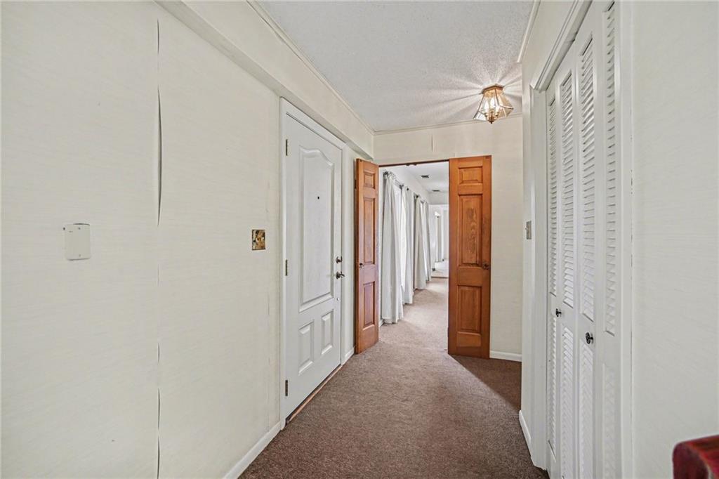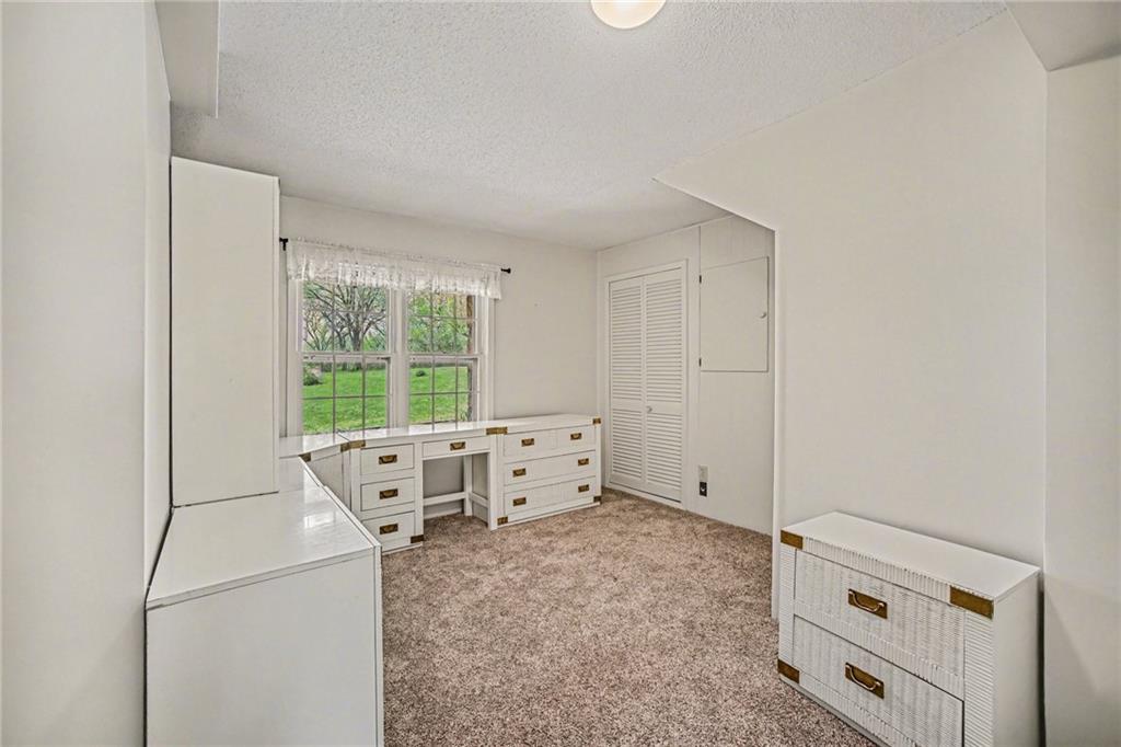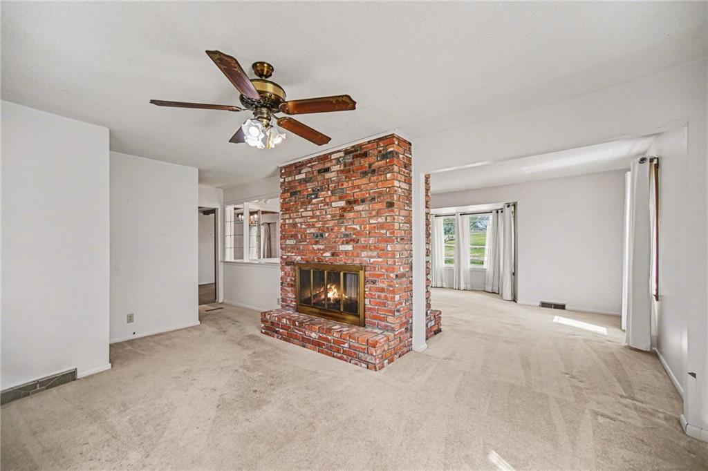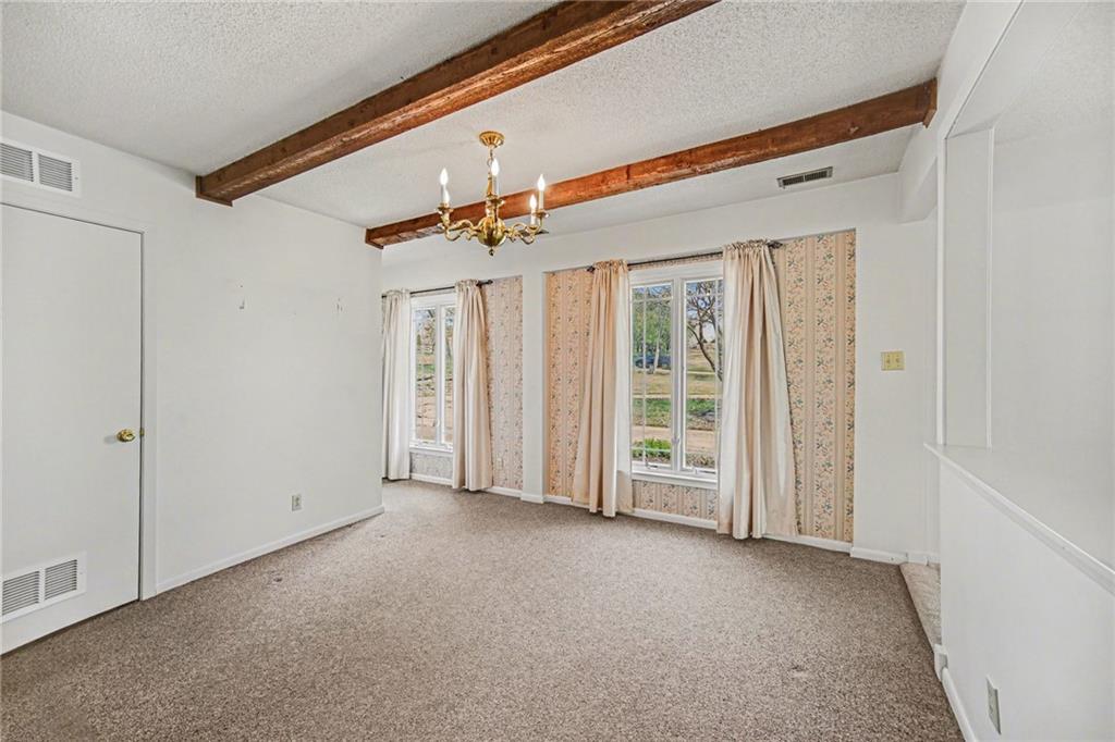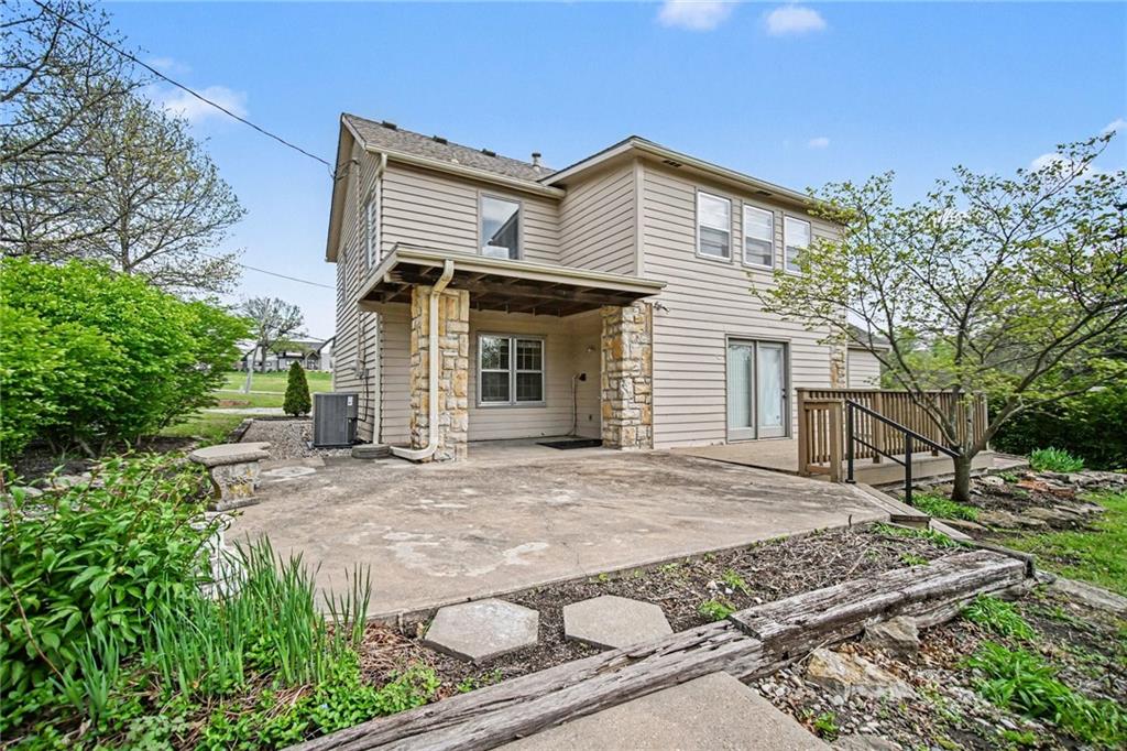 Spacious 2 Story home set on nearly 4.5 picturesque acres in Olathe! The main level features a convenient bedroom and full bath. This unique floor plan also has a large living room and family room with a see-through fireplace. The kitchen and dining room both have stunning wood beams. Nice sunroom or sitting room off the kitchen leading to the patio and deck. The second floor has three bedrooms, a sitting room, and a full bath. Newer HVAC. Tons of potential in this great home or an amazing lot to build your dream home. Perfect location close to schools, shopping, Olathe Lake, and Cedar Niles Park.
