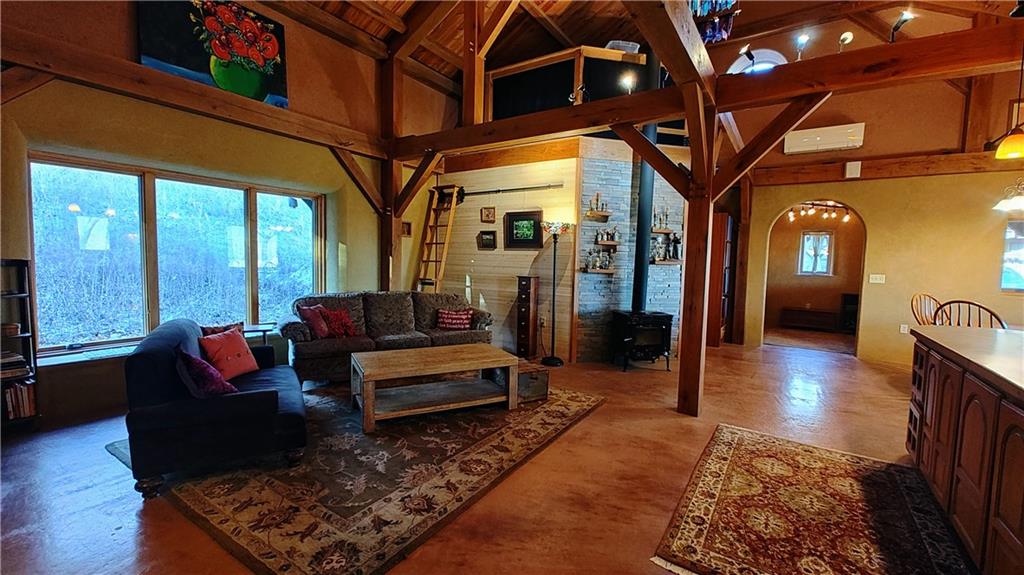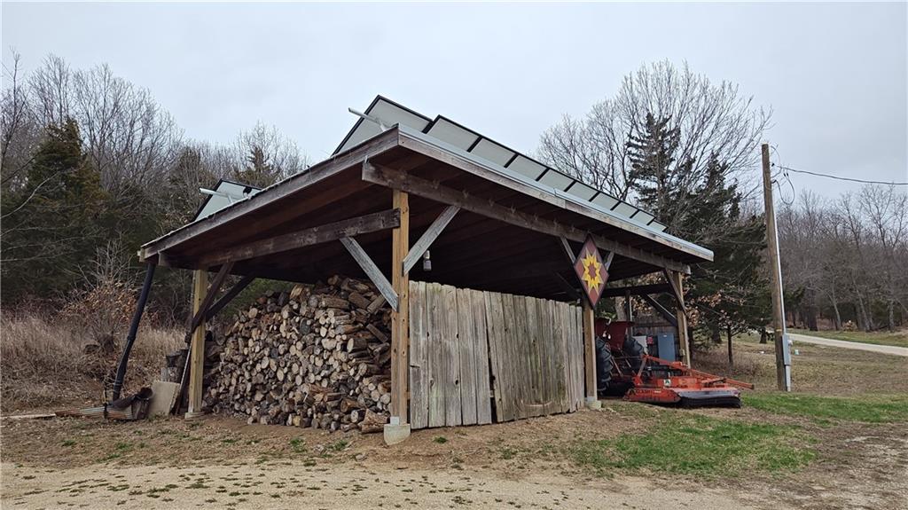 12 year-old Net-Zero Custom-Built Timber Frame Home on 27+ Private Acres with Stocked Pond Energy Independence, Privacy, Woods, Water, and Pasture — 12 miles from Lawrence: timber-frame home sits 500 feet off the road on 27+ acres overlooking the Buck Creek Valley. Designed for efficiency and built with the highest quality materials, it offers a rare combination of sustainability, recreation, and proximity to town. Durability and comfort are hallmarks of this home. You really must experience this home first-hand! 10 acres fenced pasture (high-tensile 4-wire electric fencing) 17 wooded acres with mature oak, hickory, walnut & hedge and over 1 mile of private hiking trails Stocked largemouth bass pond Pond aeration system installed 2025 Home positioned halfway up the hill for protection and views The Home: 1,550 sq ft PLUS 500 sq ft covered porch Traditional timber-frame construction (white oak) 2 bedrooms + flexible loft space (office/guest/yoga/studio) 20’ ceiling peak in open living area Large kitchen with island Zero-entry walk-in shower Straw bale exterior walls (R-40) Structural insulated panel roof (R-40) Andersen casement windows Standing-seam metal roof Mitsubishi mini-split heat pump (new coil 2025) Pacific Energy Alderlea wood stove Complete architectural plans available Natural materials create exceptional indoor air quality and a calm, grounded feel Net-Zero Solar Energy: Installed in 2018 Produces 8,500–9,000 kWh annually, historically exceeds total household usage Inverter replaced March 2024 Water & Infrastructure 8,000-gallon rainwater cistern Pump house/workshop Whole-house filtration system (spin-down, carbon/sediment, UV, optional chlorinator) Outbuildings 11' x 18' workshop / pumphouse 15’ x 45’ pole barn (3 bays) 16’ x 32’ pole barn (2 bays) Converted 15' diam. grain bin with concrete floor, electricity, lighting & exhaust fan 13 mi. to Perry Lake Marina 23 mi. to Clinton Lake Marina