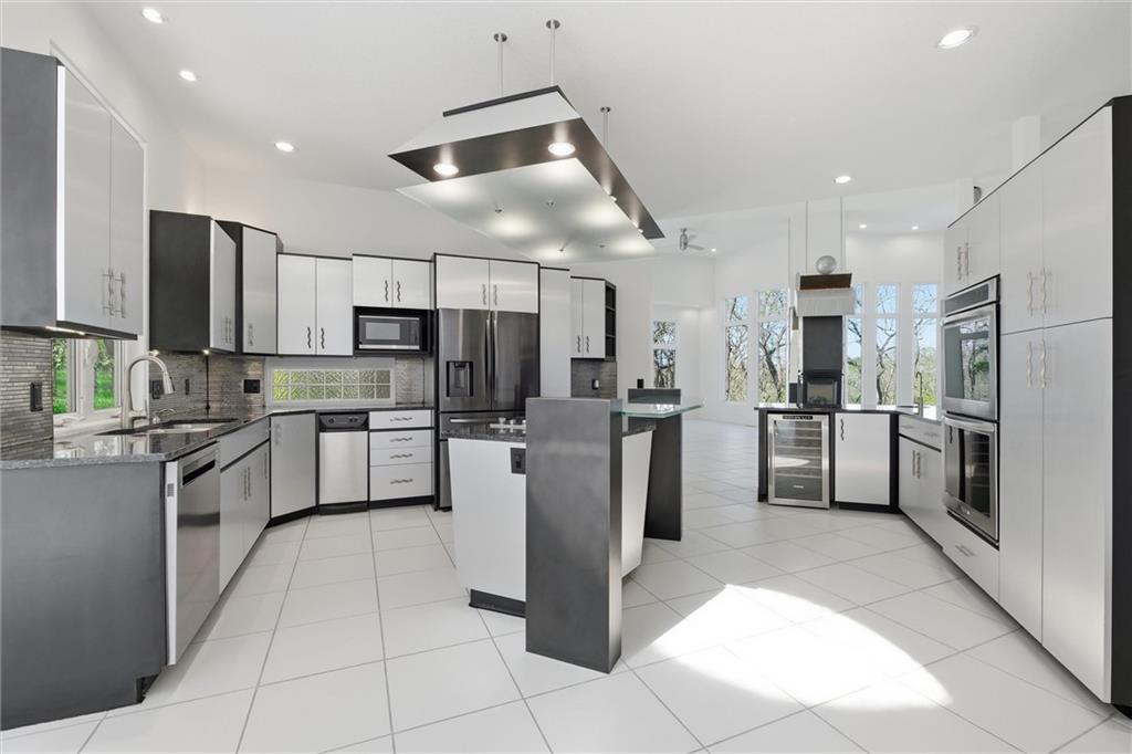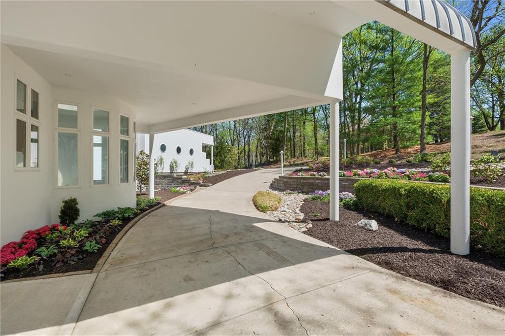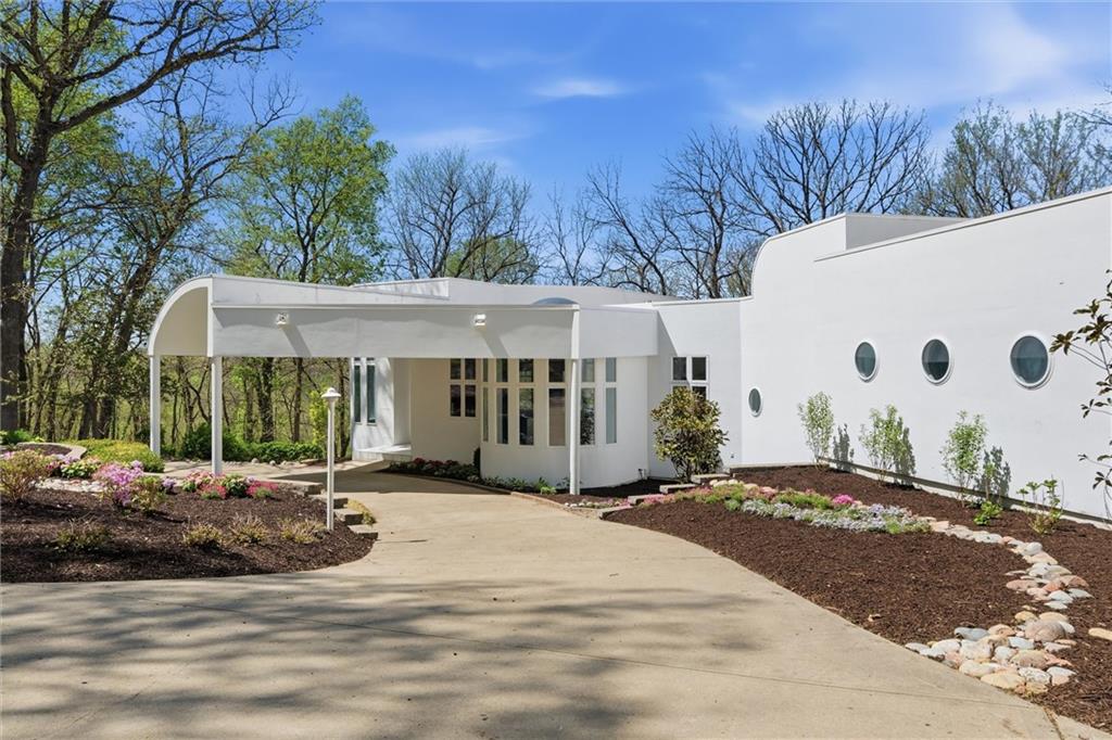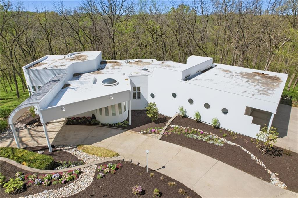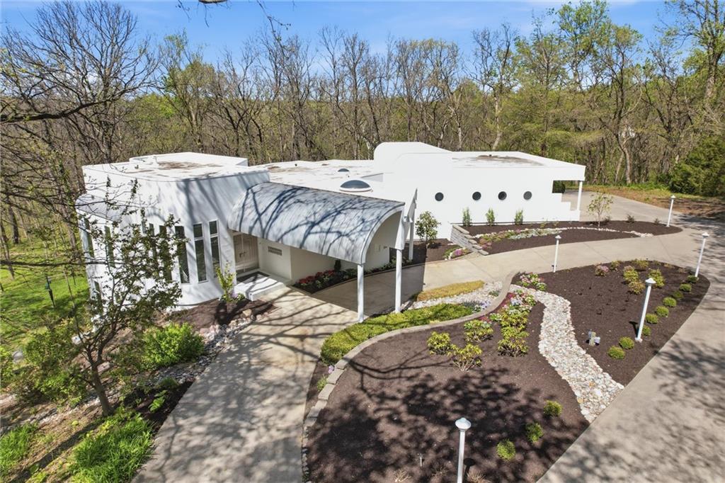 Experience a rare opportunity to own a living work of art. Masterfully designed by world-renowned architect Richard Meier, this custom-built residence is a symphony of light, geometry, and nature. Perched on a secluded cul-de-sac and nestled within a lush canopy of mature trees, the home embodies Meier's signature modernist aesthetic--a striking white silhouette that serves as a pristine canvas for the surrounding forest's vibrant colors. Wrapped in 5.19 acres of mature timber, this custom-built Richard Meier Estate offers the ultimate in architectural distinction and privacy. Designed to harmonize with its wooded surroundings, this contemporary reverse 1.5 story home features, soaring ceilings and an abundance of custom windows that frame breathtaking views from every angle. The main level is anchored by a chef's kitchen, bright and airy, round, eat in kitchen area, separate pantry, main level laundry room, and a grand living area featuring one of three see through fireplaces. Retreat to the primary suite, a true sanctuary with its own see-though fireplace, attached to a private study with patio access,. Relax in spa-like bath with a jacuzzi tub, separate walk-in shower, dual closets, dual vanities, dual toilet closets! The walk-out lower level is an entertainers dream, complete with a second full kitchen, a spacious family room, infrared sauna room, exercise room and seamless access to the outdoor patio and creek. True to the architect's vision, the home features soaring glass walls and expansive open spaces that seamlessly blur the boundary between indoors and out. Every angle is intentionally crafted to capture shifting natural light, creating an environment that feels both ethereal and grounded. This is more than a residence; it is a masterwork for the collector of fine architecture who seeks the ultimate harmony of space and site.