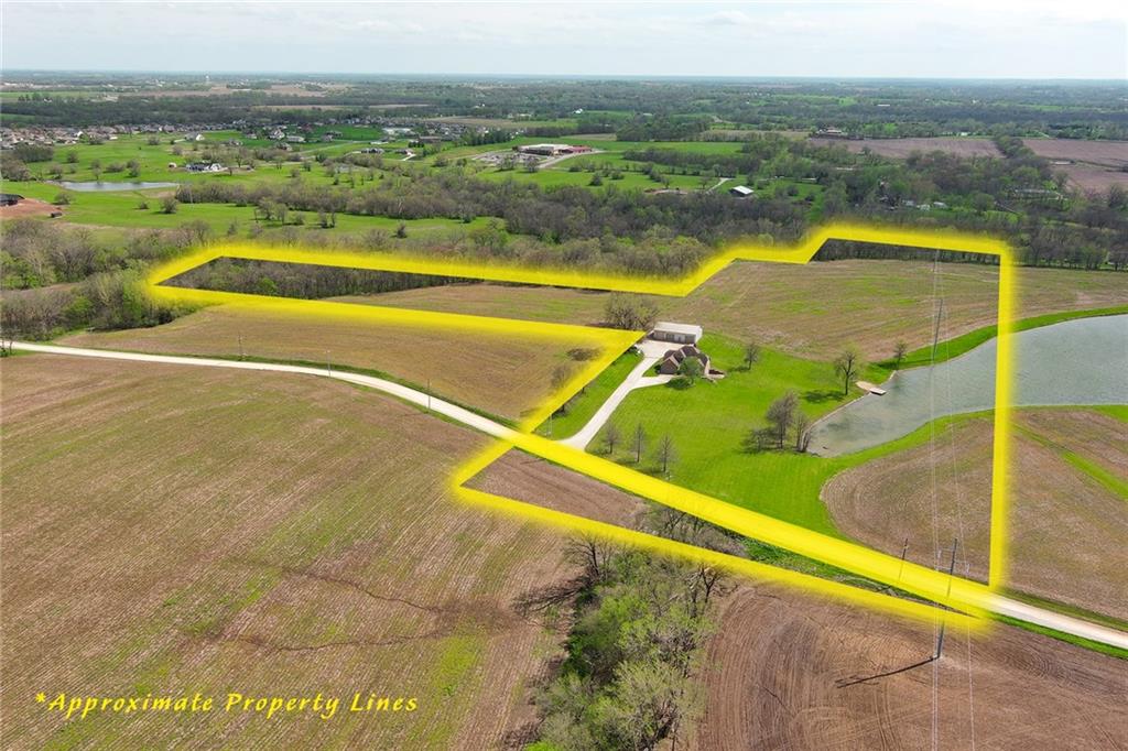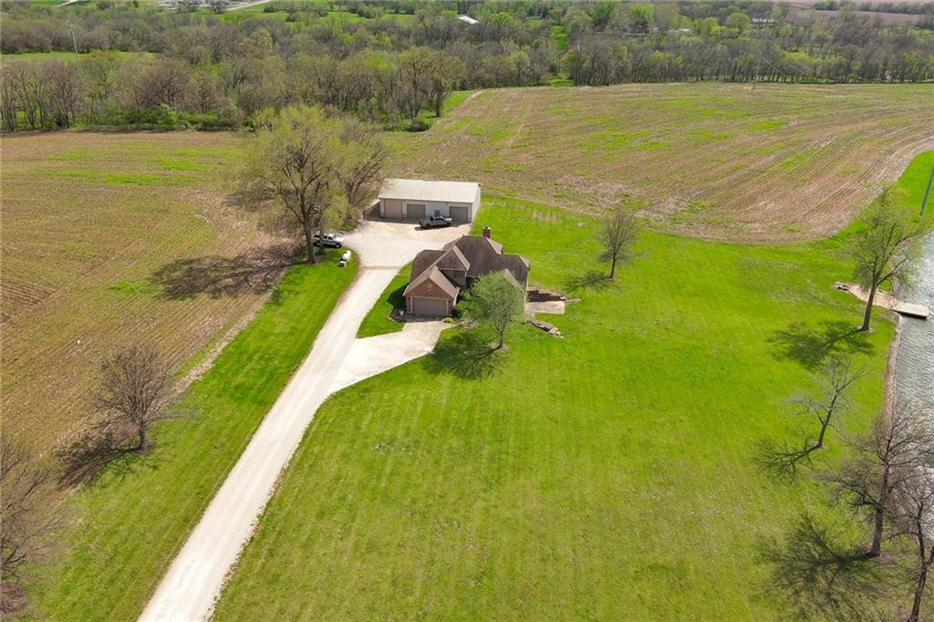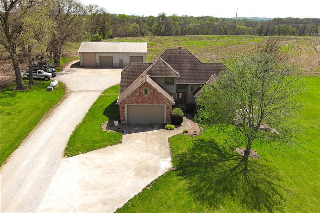 Escape to the peace of the countryside in this custom built home on 24 acres. A fully stocked pond with Bass, Crappies, Perch, Bluegill, and Catfish provides the perfect place to relax while watching the sun set. The entry opens to a large great room with heat circulating wood burning fireplace and 13' ceilings with beautiful crown moulding. There are two dining areas (one is currently being used as an office). The kitchen has many cabinets, pantry, island with cooktop, Granite countertops, tile backsplash, and wood floor. The primary suite is large and includes the following amenities - a double vanity, shower, whirlpool tub, linen closet, and walk-in closet. The two upstairs bedrooms are generous size with a shared bathroom. There is an office that could be converted into another bedroom/play area/craft room - the options are endless. There is a storage area above the garage off one of the bedrooms. The finished walk-out lower level has so much to offer with large family room, gym/exercise room (could be converted into a bedroom), full bath (with walk-in closet for guests), storage area (16.11x11.6), and 3rd car garage (14.3x11.2). The home was remodeled in 2008 with new vinyl siding, windows, roof, granite countertops, & refinished hardwood floors. The 60x40 outbuilding includes 100amp electrical service, insulated interior, concrete floor, water, radiant heat, pegboard/workbench, large overhead door for RV, & BONUS - 9,000 lb vehicle lift. There is a lean-to (40x12.6) on the back of the outbuilding. Located just a little under 10 minutes from I-70, this property offers the perfect balance of rural privacy and convenient access to town and Kansas City. Inspections welcome but selling "AS IS". The two gas tanks on the East side of the outbuilding are not staying.