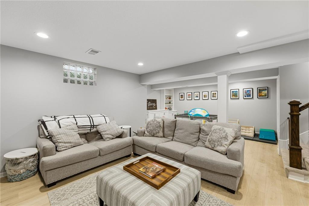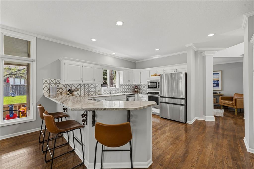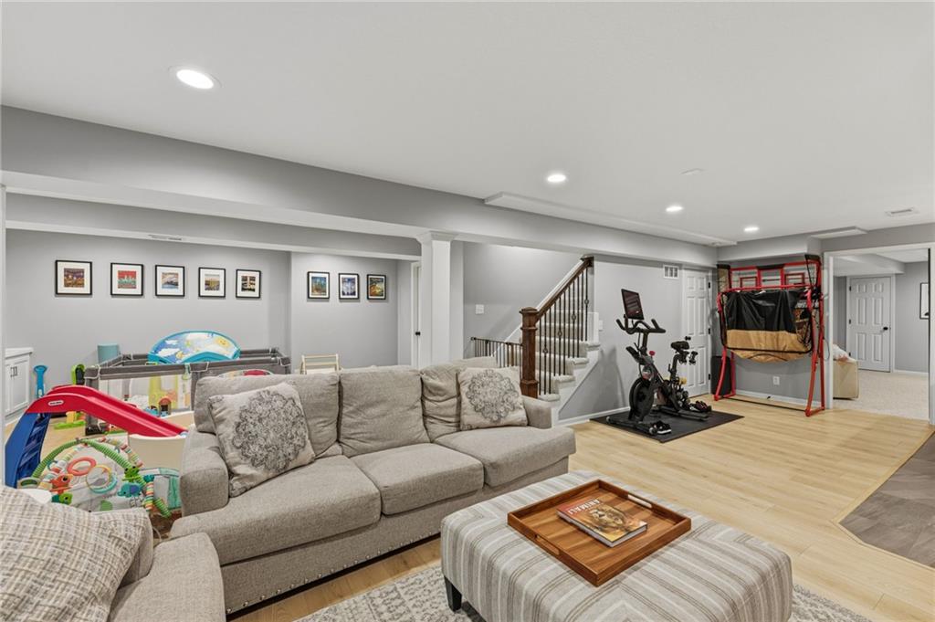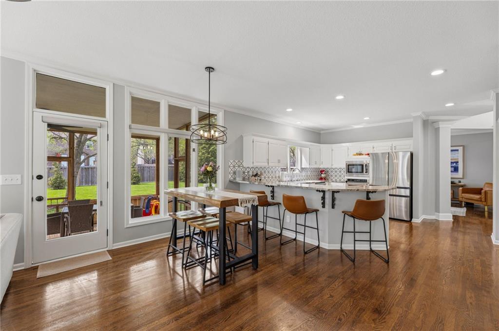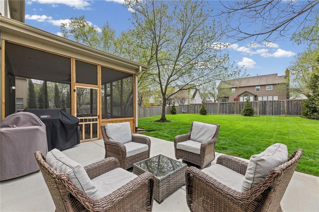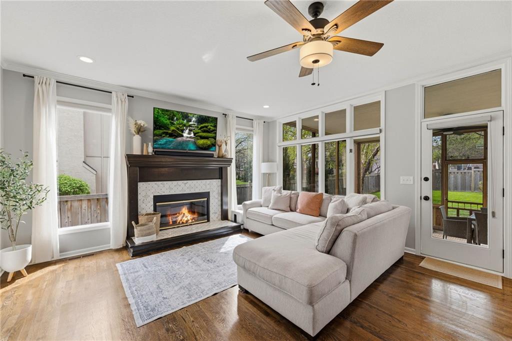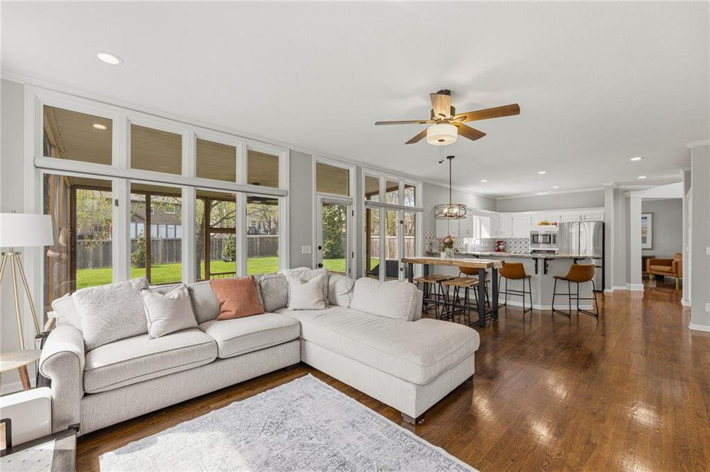 This home offers an impressive blend of luxury, functionality, and an unbeatable location. Step inside to a spacious, light-filled interior featuring designer finishes and quality craftsmanship throughout. Hardwood floors anchor the main level, where a thoughtfully designed layout offers multiple living and dining spaces—perfect for both everyday living and effortless entertaining. Enjoy a large, inviting family room ideal for gathering, along with additional living areas that provide flexibility for relaxing, working, or hosting guests. The home also features multiple dining spaces, including a formal dining room for special occasions and more casual areas for everyday meals. Soaring vaulted ceilings and generously sized rooms create a bright, airy atmosphere showcasing the home beautifully. Freshly painted inside and out, the property also boasts numerous upgrades throughout. The stunning gourmet kitchen is a true centerpiece, complete with stainless steel appliances, quartz countertops, and abundant white cabinetry. A well-appointed main-level bedroom provides added flexibility, ideal for guests, multigenerational living, or a private office retreat. Additional highlights include a composite roof replaced less than two years ago, and a lower-level recreation room featuring new LVT flooring, a cozy fireplace and wet bar—ideal for relaxing or hosting guests. A non-conforming sixth bonus room and a convenient half bath complete the lower level. For those who enjoy the outdoors, the newly screened porch offers the perfect retreat. Unwind with a good book while taking in peaceful sunset views over the private fenced backyard. Located in a highly sought-after neighborhood, this home is just minutes from Town Center, offering a variety of dining and shopping options, as well as nearby parks with scenic walking and biking trails.