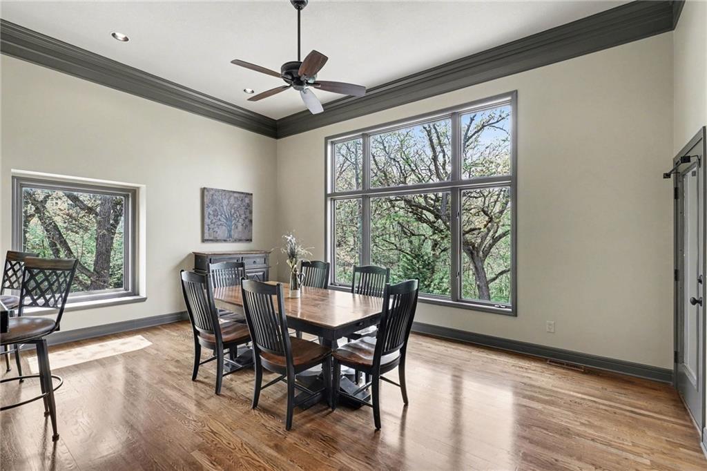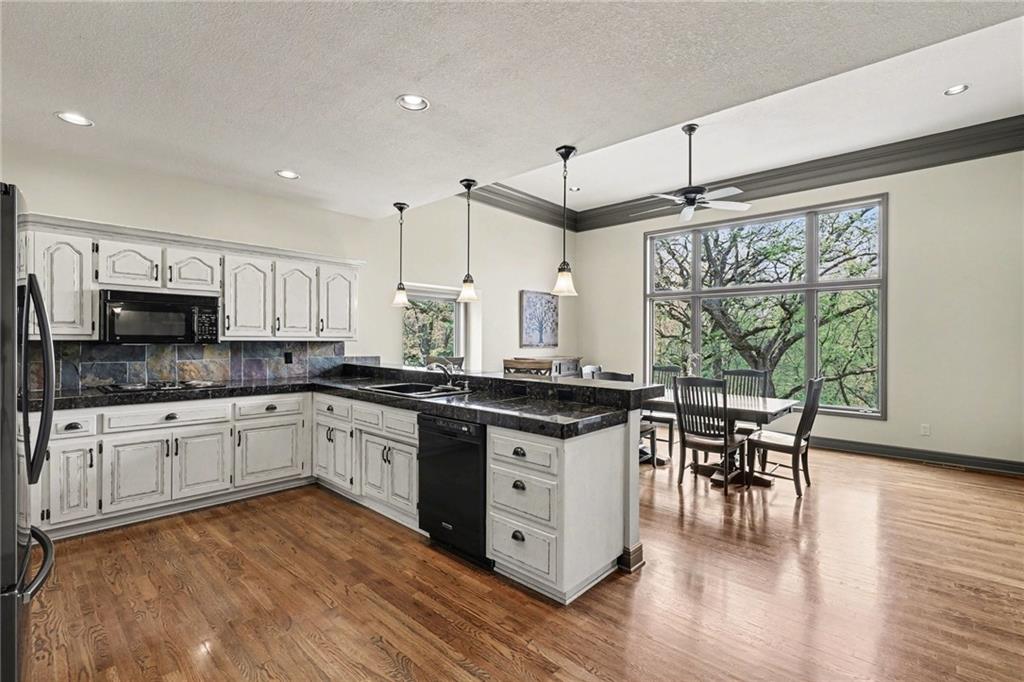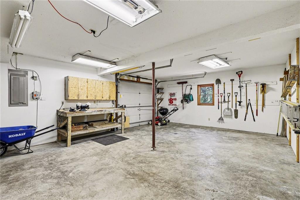 Stunning custom-built home where thoughtful design meets breathtaking views—come for the house, stay for the scenery. The chef’s kitchen is a showstopper with hardwood floors, custom cabinetry, granite tile countertops, a breakfast bar with seating, and stylish pendant lighting. The breakfast area features soaring ceilings, walls of windows, and access to the covered, screened-in porch—perfect for relaxing mornings or evenings. The inviting Great Room offers beautiful views of the treed backyard, upgraded trim, and a striking stone fireplace. The grand entry welcomes you with a vaulted ceiling, updated lighting, and tiled flooring. The primary suite is a retreat with bayed windows, a tray ceiling, and ceiling fan. The spa-like bath includes a double vanity with custom cabinetry, tiled floors, and a walk-in tiled shower. A secondary bedroom on the main level offers flexibility as a guest room or office. The large laundry room adds convenience with cabinetry and a sink. The lower level features a spacious living area with a corner fireplace and access to another covered deck, along with two generously sized bedrooms, a full bath, and a non-conforming bonus room. The next level is perfect for entertaining with a massive rec room, wet bar, and additional full bath. Walk out to the private, landscaped backyard and enjoy the serene, wooded setting year-round. Additional highlights include storage space under the two-car garage and a dedicated workshop area. This home truly has it all—space, function, and incredible views.