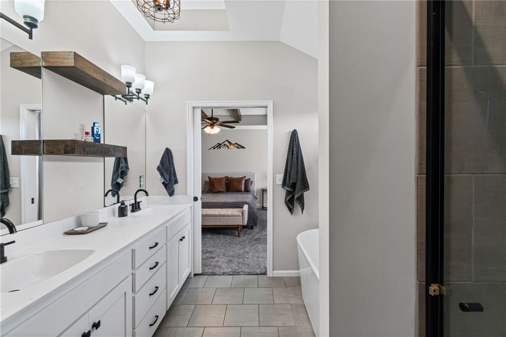This beautifully updated home is truly move-in ready, featuring fresh interior paint, new flooring and carpet throughout, a newly epoxied garage floor, upgraded landscaping, lawn irrigation system, and a wrought iron fence—plus so much more! From the moment you arrive, you’ll be charmed by the inviting front sitting porch, cedar shutters, and striking architectural beams. Step inside to discover vaulted ceilings, rich hardwood floors, and a warm, welcoming living room complete with a gas fireplace, decorative shiplap, and a wood mantle. The staircase showcases sculptured carpet and elegant white spindles, leading you into a breathtaking kitchen and dining area. The kitchen is a true showstopper with custom white cabinetry (including glass-front accents), a custom stained hood, granite countertops, stainless steel appliances, wood shelving, a spacious pantry, and a brand-new stove highlighting the tiled backsplash. The dining area is generously sized—perfect for hosting large gatherings—and flows seamlessly with the hardwood flooring that extends throughout the kitchen, dining space, and hallway. Stylish light fixtures add a modern touch throughout the home. The spacious primary bedroom features decorative beams and leads into a luxurious ensuite bath complete with double sinks, cultured marble countertops, tiled backsplash, custom shelving, a relaxing soaking tub, walk-in closet, and tiled shower—all enhanced with charming shiplap details. Two additional bedrooms and a conveniently located laundry room complete the main level. Downstairs, enjoy a huge recreation room along with an additional half bath—ideal for entertaining or relaxing. The oversized, extra-deep garage offers exceptional storage space. Located in a fantastic neighborhood, this home truly has it all. Don’t miss your chance—schedule your showing today!