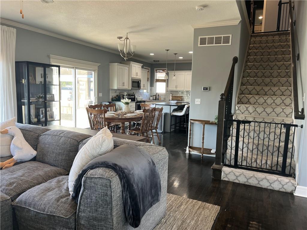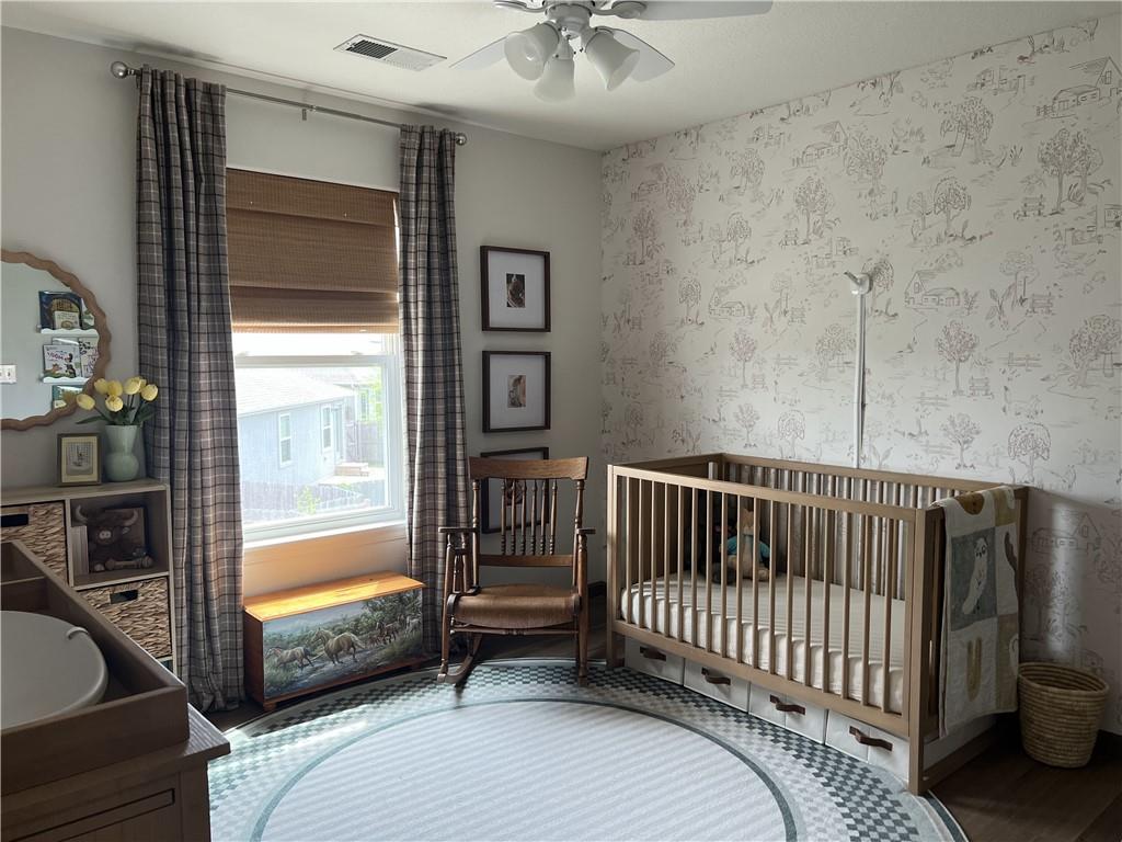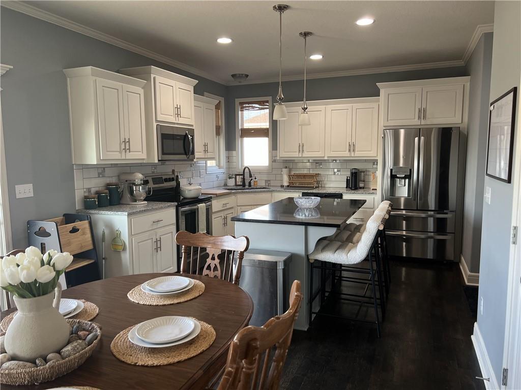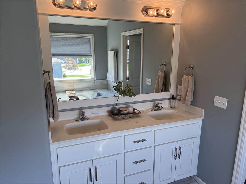 2 story on corner lot with tall wood fence and screened patio. Large covered front porch. Stacked stone trim. 3 car garage. Open main floor living with wood flooring. Kitchen has granite counters, an island, pantry and access to fenced backyard. 4 bedrooms, 2 baths and laundry room on 2nd floor. Primary bedroom features large walkin closet and en suite with jetted tub, double sinks and shower with bench. Unfinished basement with 2 egress windows. Private backyard has tall fence, firepit, patio with screened and unscreened area.