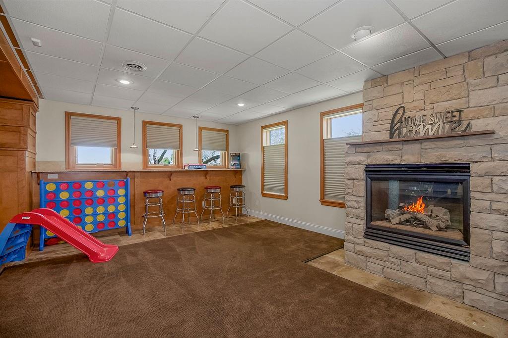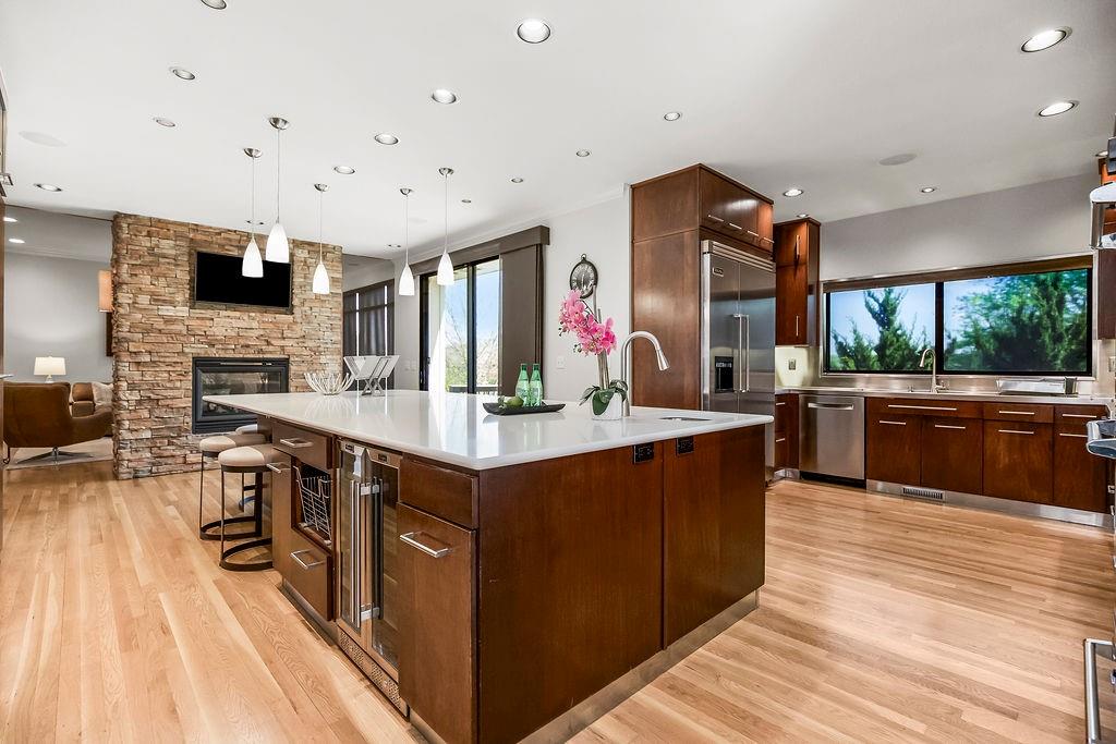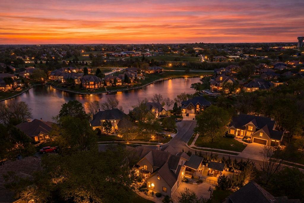 Welcome to this stunning and spacious 1.5-story home designed for both comfort and entertaining! The custom gourmet kitchen is a chef’s delight, boasting top-of-the-line Viking appliances, a gas range, and a generous island perfect for meal prep and casual gatherings. Step outside to your private retreat featuring an outdoor kitchen and a cozy fire pit—ideal for relaxing or entertaining year-round. Inside, the main level impresses with a formal dining room, a bright great room with expansive windows and a see-through fireplace, a private office, and a luxurious primary suite. Upstairs, you’ll find three spacious bedrooms and a versatile loft area—perfect for a playroom, reading nook, or extra workspace. The finished walkout lower level offers even more room to enjoy, including a family room, wet bar, rec area, and an exercise room. Nestled on a quiet cul-de-sac with a fenced yard and easy lake access, this home combines privacy, elegance, and convenience. A backyard gate leads directly to the sidewalk and dock, just steps away. This home truly has it all—style, space, and a perfect setting for everyday living or entertaining!