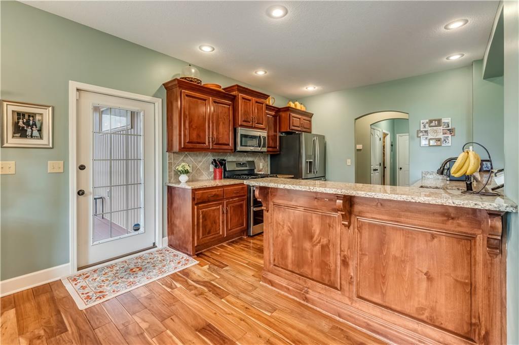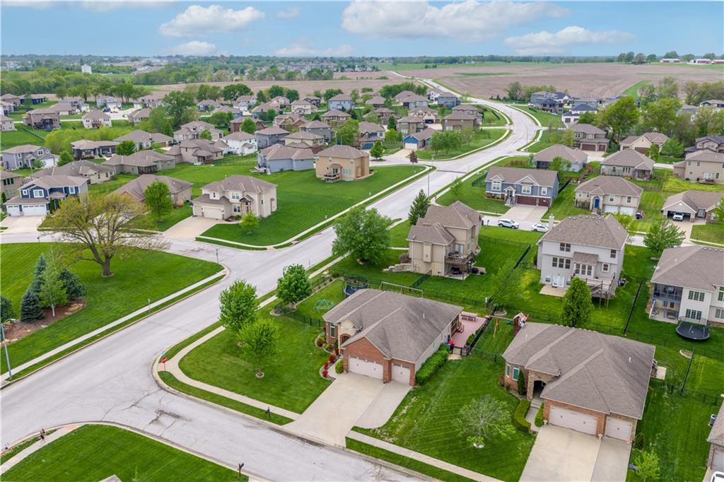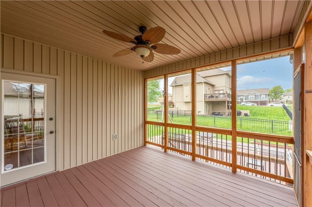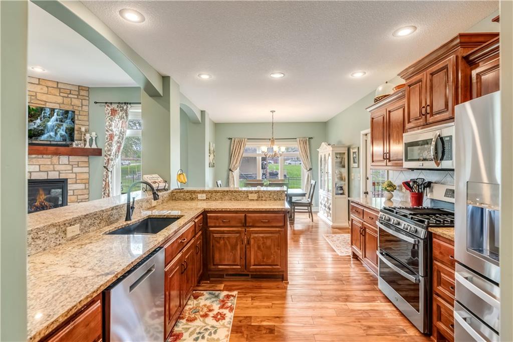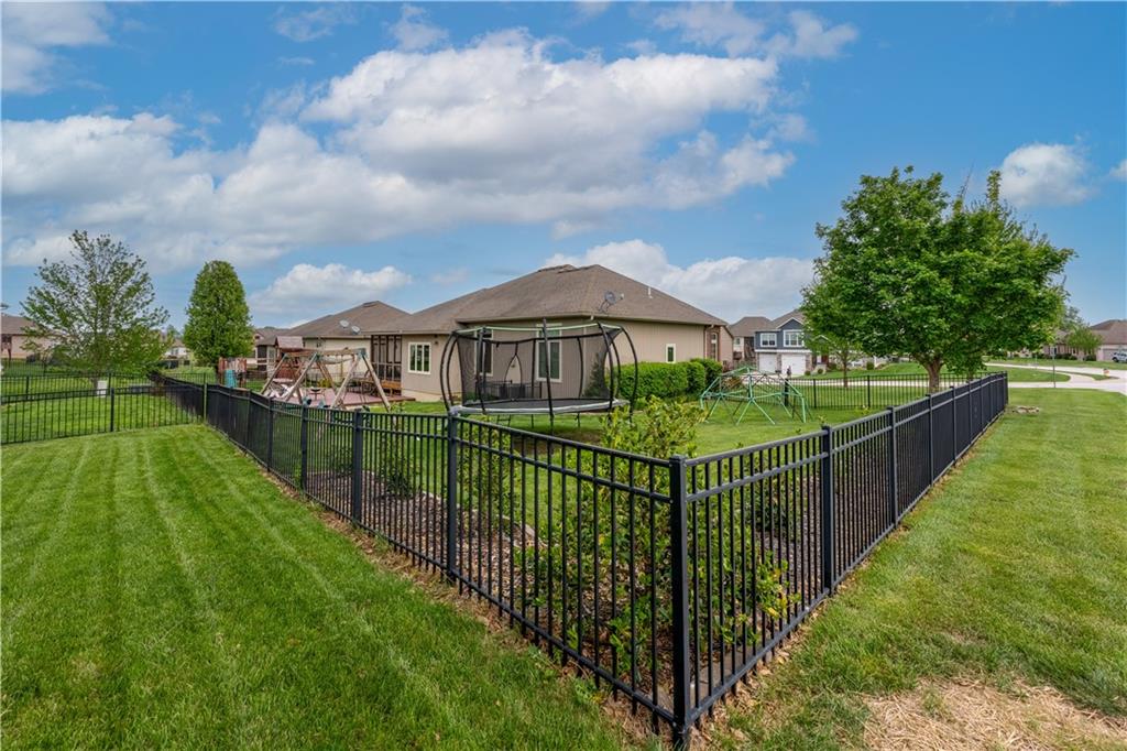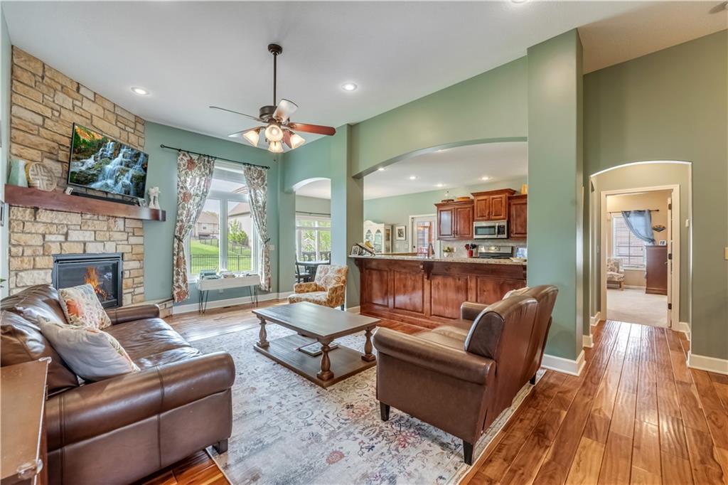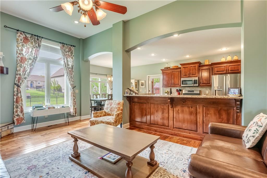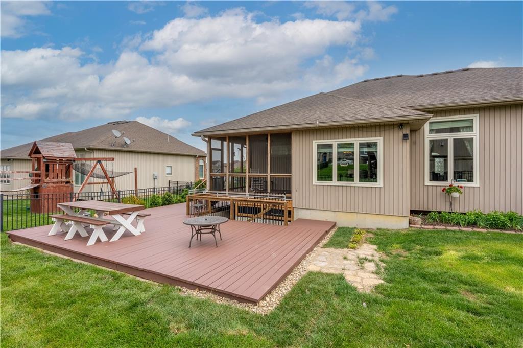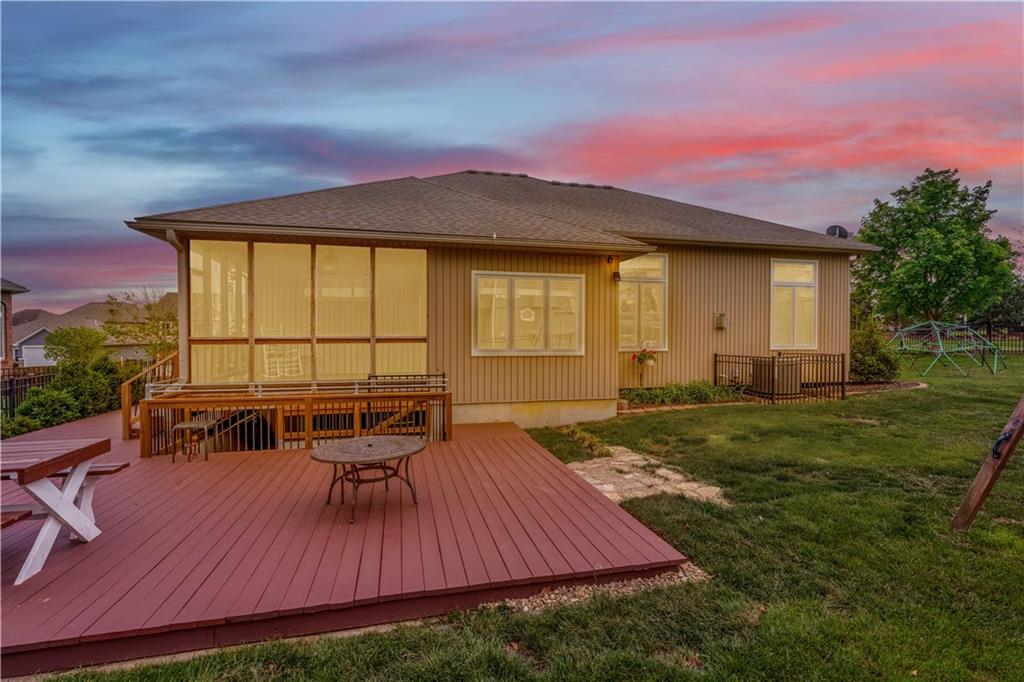 Your beautiful home is ready for you in the desirable Cayhill subdivision, known for holiday events, walkability, and commuting convenience to Whiteman AFB! This immaculate reverse ranch sits on a large corner lot with subdivision lake privileges, just minutes to shopping and restaurants in town. The welcoming front porch ushers you into warm hardwood hand-scraped floors and an open concept great room with tall ceilings. Enjoy the warmth of the gas fireplace with stone surround and still have connection to the Kitchen/Dining Room activities. Sellers have increased energy efficiency with window replacement in LR, DR, back secondary Bedroom, and hall Bathroom June 2025. Your large Kitchen has an abundance of custom wood cabinetry, granite counters, stainless steel appliances that all stay (Fridge, double oven, and dishwasher less than a year old!) and a dedicated pantry directly off the Kitchen. Main floor laundry is also nearby. The generous Primary Bedroom showcases a walk-in closet, newer carpet, and a beautifully updated on-suite Bathroom with new floor tile, newly tiled shower, new glass door, double vanity, and jetted tub. The two secondary Bedrooms have larger closets with storage systems and newer carpet with the hall Bathroom between. The lower level includes a full bar (drink fridge will stay) and service area off of the spacious Family Room, the 4th true Bedroom with a walk-in closet, another nonconforming room for many uses, and a 3rd full Bathroom. The 300 SF storage area includes a utility sink, storm shelter, NEW AC and furnace in 2025! Head out the patio door upstairs to the screened-in deck for relaxation without bugs! The basement patio leads up to the wide, newly stained back deck with a dedicated gas line for a firepit or grill. Play options abound with a swing-set and more in the fenced yard with in-ground sprinkler system. Come make new memories here!