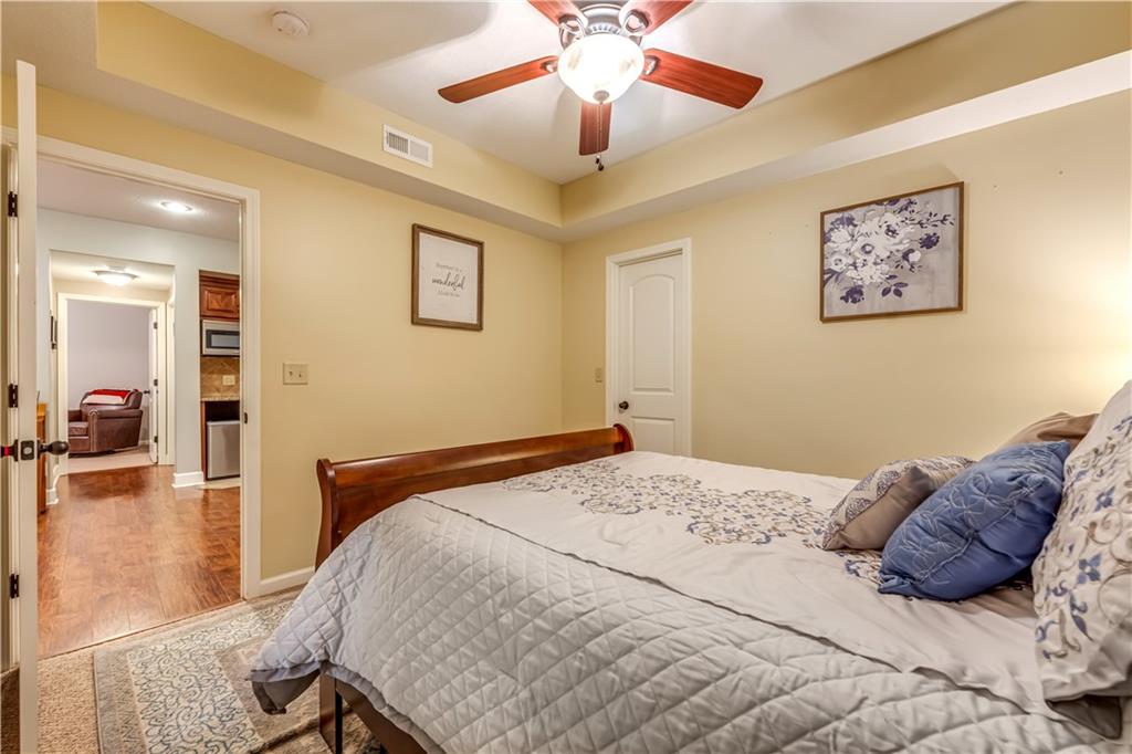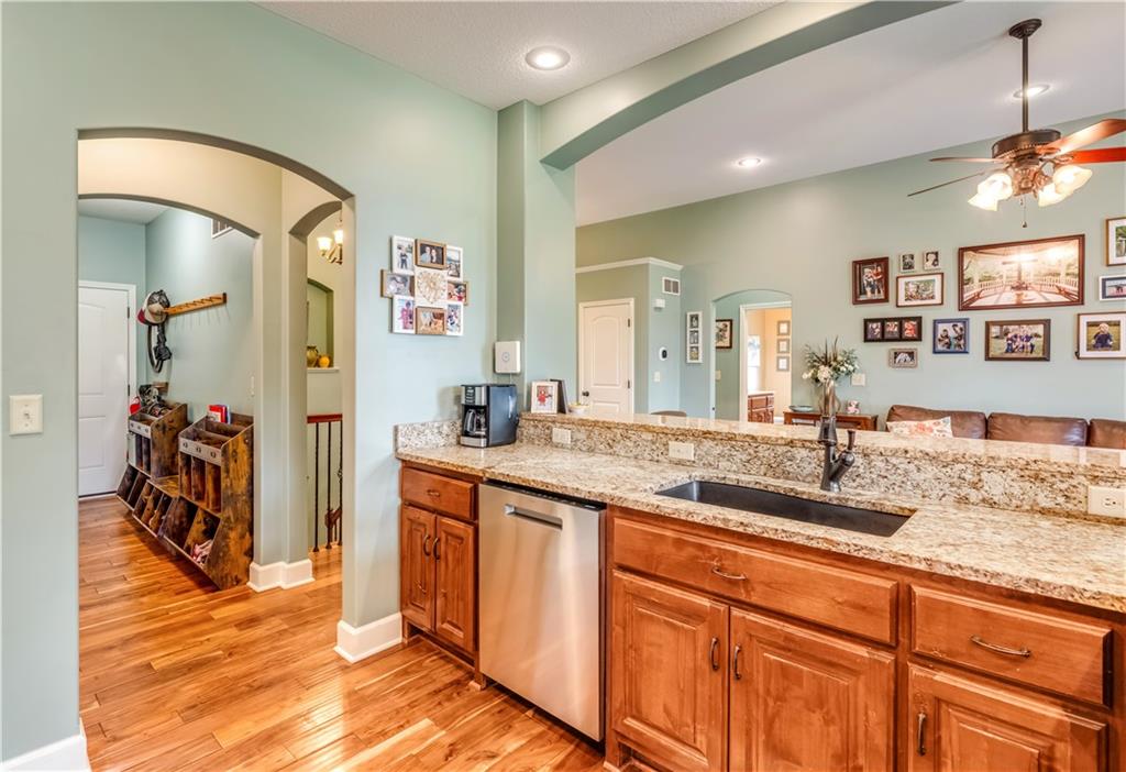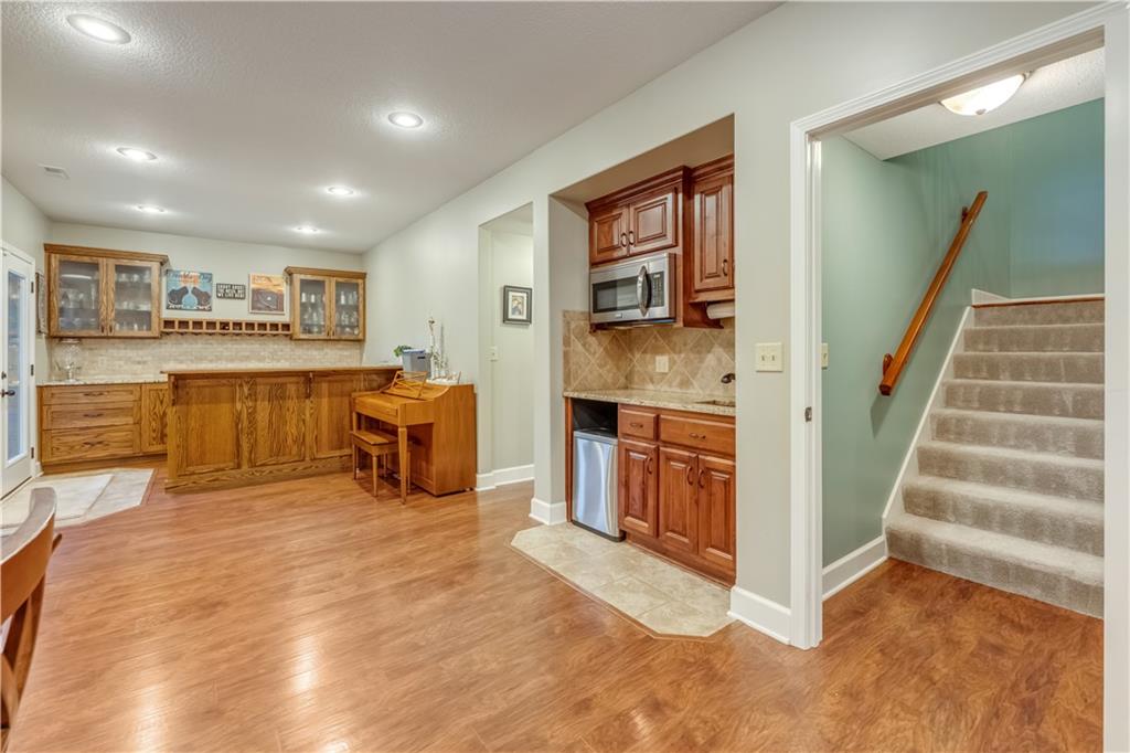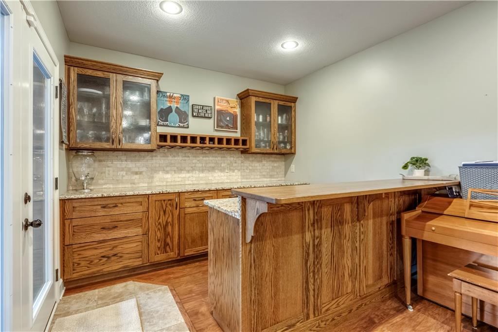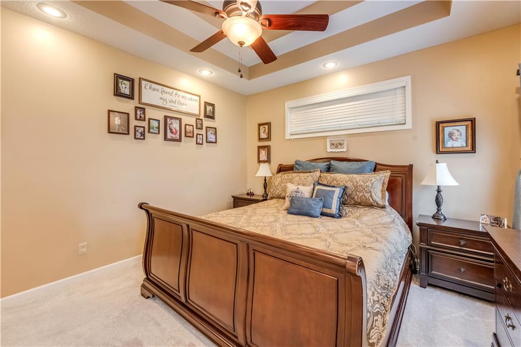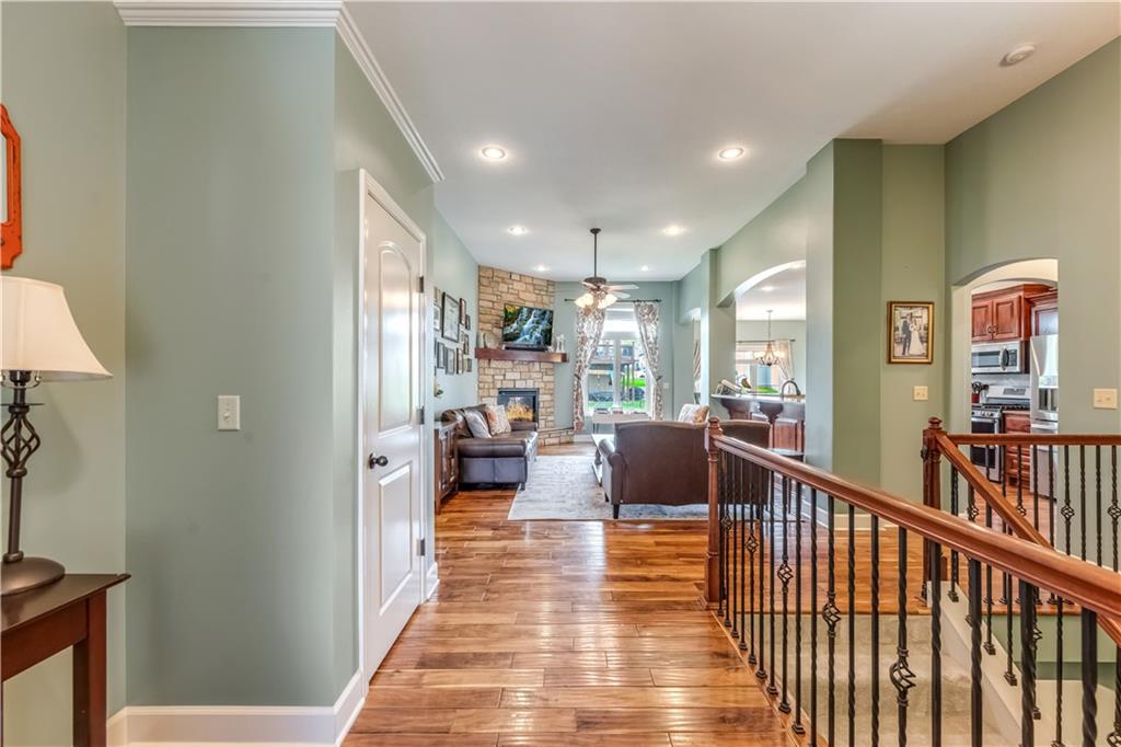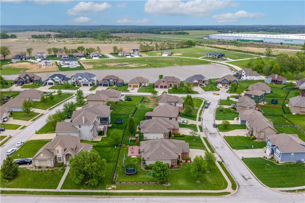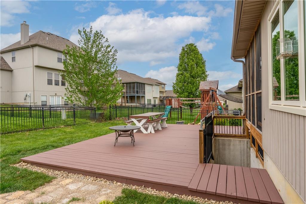 Your beautiful home is ready for you in the desirable Cayhill subdivision, known for holiday events, walkability, and commuting convenience to Whiteman AFB! This immaculate reverse ranch sits on a large corner lot with subdivision lake privileges, just minutes to shopping and restaurants in town. The welcoming front porch ushers you into warm hardwood hand-scraped floors and an open concept great room with tall ceilings. Enjoy the warmth of the gas fireplace with stone surround and still have connection to the Kitchen/Dining Room activities. Sellers have increased energy efficiency with window replacement in LR, DR, back secondary Bedroom, and hall Bathroom June 2025. Your large Kitchen has an abundance of custom wood cabinetry, granite counters, stainless steel appliances that all stay (Fridge, double oven, and dishwasher less than a year old!) and a dedicated pantry directly off the Kitchen. Main floor laundry is also nearby. The generous Primary Bedroom showcases a walk-in closet, newer carpet, and a beautifully updated on-suite Bathroom with new floor tile, newly tiled shower, new glass door, double vanity, and jetted tub. The two secondary Bedrooms have larger closets with storage systems and newer carpet with the hall Bathroom between. The lower level includes a full bar (drink fridge will stay) and service area off of the spacious Family Room, the 4th true Bedroom with a walk-in closet, another nonconforming room for many uses, and a 3rd full Bathroom. The 300 SF storage area includes a utility sink, storm shelter, NEW AC and furnace in 2025! Head out the patio door upstairs to the screened-in deck for relaxation without bugs! The basement patio leads up to the wide, newly stained back deck with a dedicated gas line for a firepit or grill. Play options abound with a swing-set and more in the fenced yard with in-ground sprinkler system. Come make new memories here!