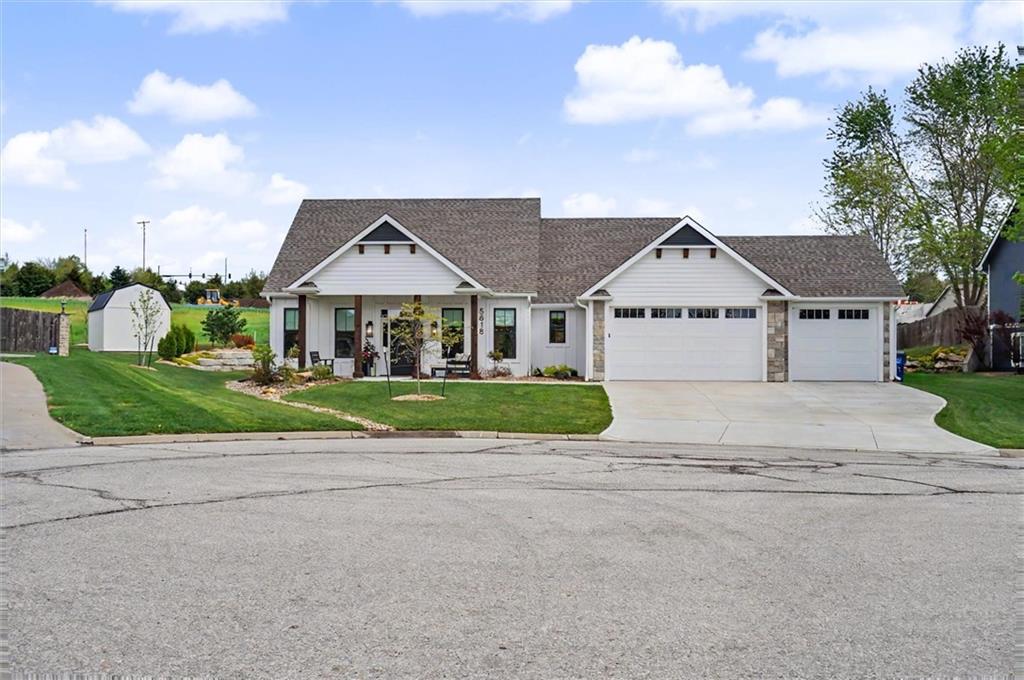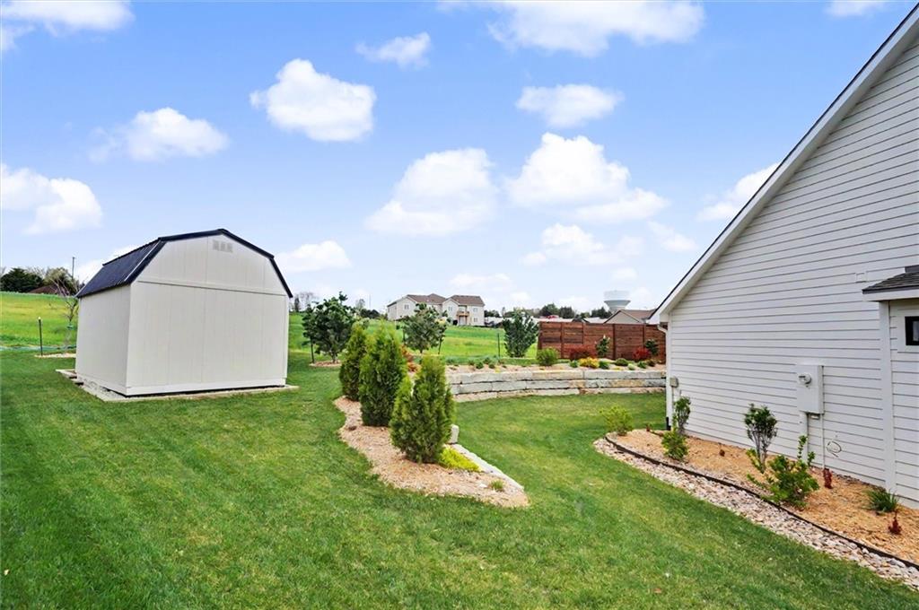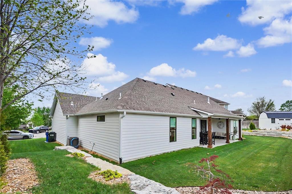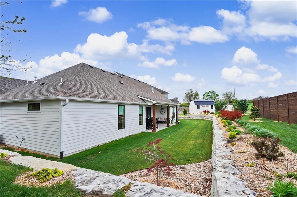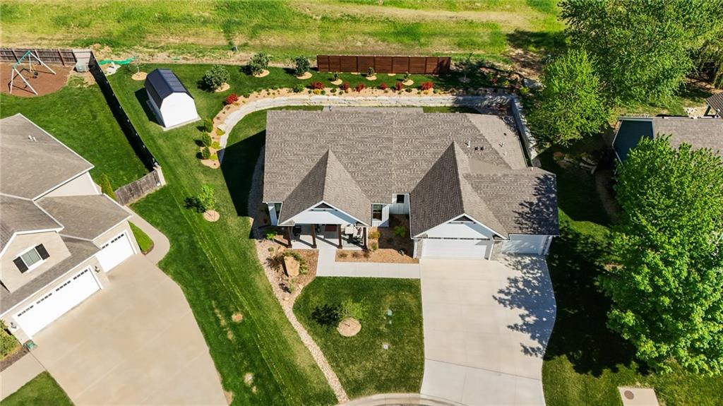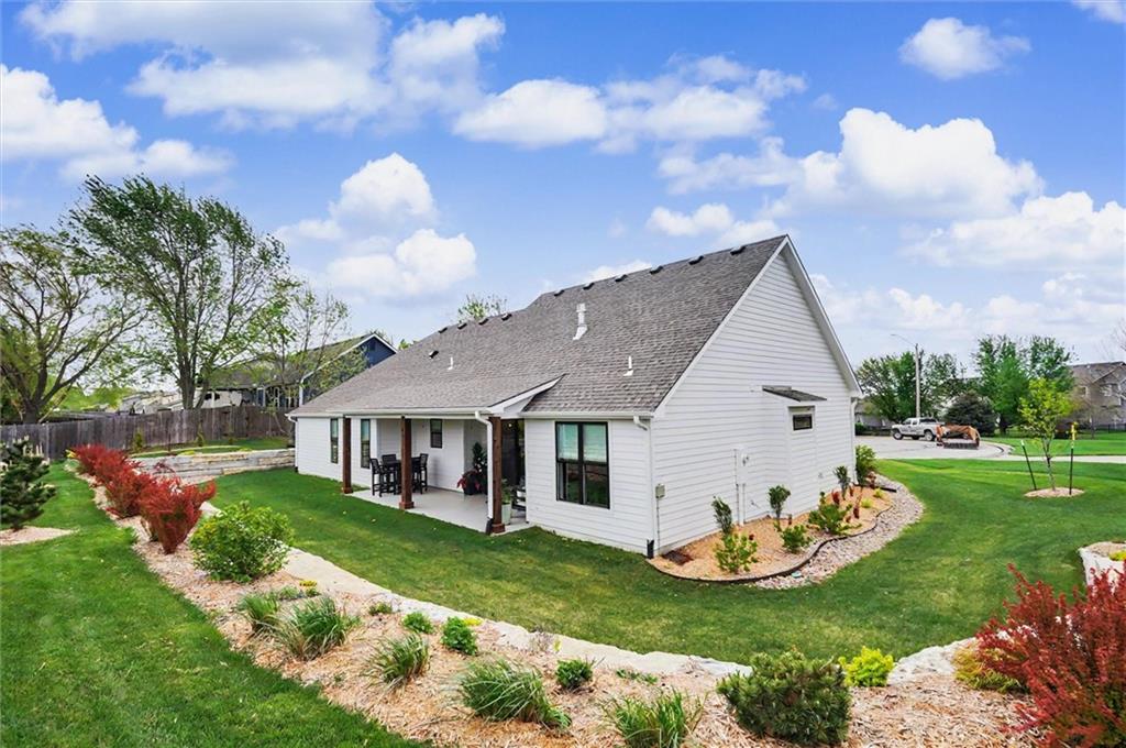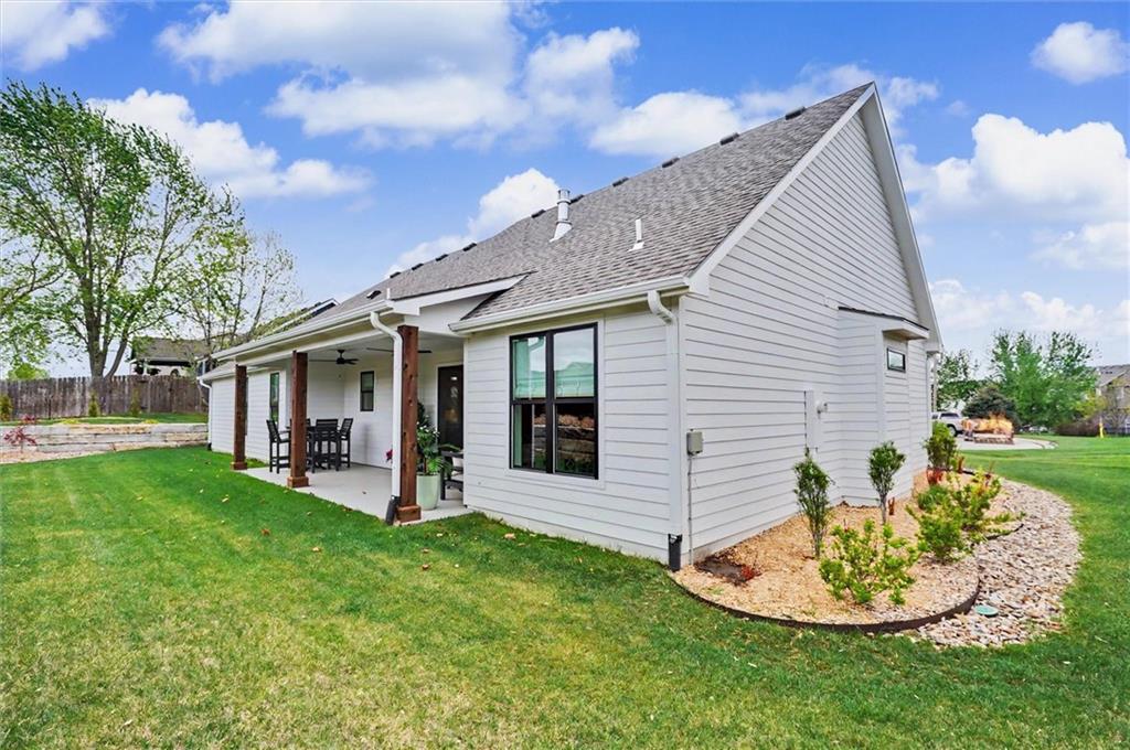 Why You’ll Love This Home Built in Spring 2024 as a custom residence for the builder, this home showcases exceptional craftsmanship, thoughtful upgrades, and superior attention to detail throughout. Now, with two years of established landscaping, you benefit from a mature setting that new construction simply can’t offer. The expanded in-ground sprinkler system supports lush greenery designed for both privacy and a welcoming habitat for birds and butterflies. Perfectly positioned at the end of a quiet cul-de-sac, this home combines privacy with convenience. Enjoy quick access to Hwy 10 and I-70, making commuting effortless. Nearby amenities include outdoor recreation at Jayhawk Park and Lawrence Recreation Pavilion, education at Langston Hughes Elementary School, and top-tier healthcare at LMH Health West Campus. True Single-Level Living Designed for ease and accessibility, this home features no stairs—everything you need is on one level, including the front entrance, spacious 3-car garage, and covered backyard patio. Energy Efficiency & Peace of Mind Built with modern standards and certified for energy efficiency, this home offers comfort, sustainability, and the confidence of lower utility costs year-round. Thoughtful, Functional Layout The open-concept design centers around a stunning kitchen with a large walk-in pantry and brand-new appliances—perfect for both daily living and entertaining. • The private primary suite is situated on the east side of the home and features a spacious bedroom, a luxurious five-piece bathroom, and a large walk-in closet with custom built-ins. • The closet also doubles as a secure storm shelter with reinforced one-foot-thick concrete walls and connects directly to the laundry room for added convenience. • On the west side, two additional bedrooms and a beautifully appointed bathroom provide comfort and privacy for family or guests.