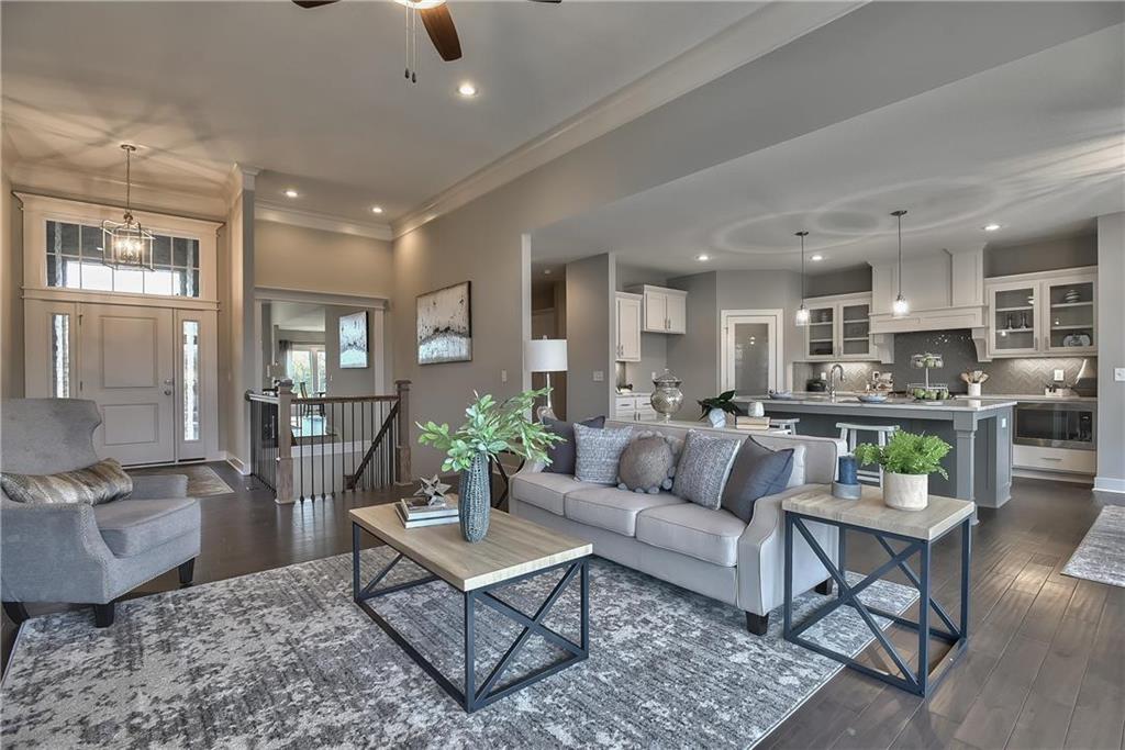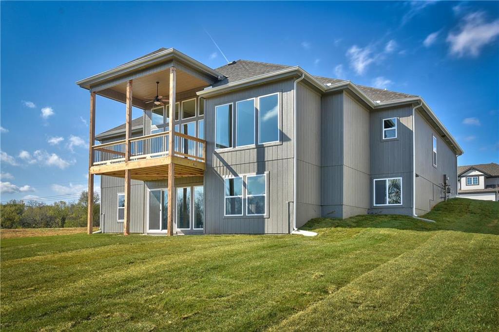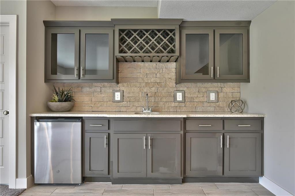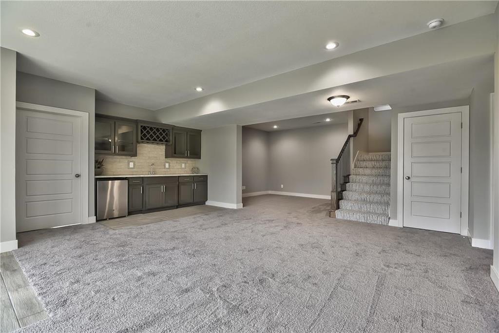 Want some privacy? This Dakota reverse sits on a beautiful walk out lot backing to trees. Nice hardwood floors run throughout the entry, great room, dining area, kitchen and mud room. The great room includes a stunning fireplace and wall of windows giving you lots of natural light. Walk out from the dining area to a wonderful covered deck with a peaceful view of the treed backyard and greenspace. Center island kitchen with granite countertops is a cook's delight featuring an apron sink, custom cabinets with cabinet hood, upgraded cabinet hardware with soft closing drawers & doors, built in microwave, undercabinet lighting, stainless appliances and a large walk in pantry. The owner's suite with its vaulted ceiling and wall of windows leads into a lovely bath with separate granite vanities, walk in tiled shower, separate tub and walk in closet. Laundry room is connected to the master bath for your convenience. The second bedroom on the main floor is a great multipurpose room for a guest room, craft room, office, etc. ice sized mud room with large boot bench,, coat closet and a 3/4 bath just off the back hallway. Follow the U-shaped staircase down to the rec room with wet bar and plenty of room for a home theater plus a game table. Walk out from the rec room to enjoy the private backyard. Two more bedrooms and bath complete the finished lower level. Lots of storage in the unfinished basement. Storm room included for your safety in case of a storm. Three car garage and sprinkler system. Prairie Farms has a great community pool, play area and walking trails. It's a great place to call home.